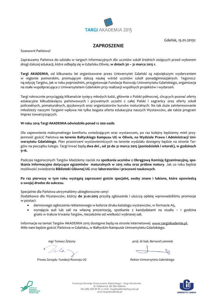 Gdańsk, 15.01.2015r. ZAPROSZENIE Szanowni Państwo! Zapraszamy Państwa do udziału w targach informacyjnych dla uczniów szkół średnich stojących przed wyborem drogi dalszej edukacji, które odbędą się w Gdańsku Oliwie, w dniach 30 – 31 marca 2015 r. Targi AKADEMIA, od kilkunastu lat organizowane przez Uniwersytet Gdański są największym wydarzeniem w regionie pomorskim, promującym dalszą naukę wśród uczniów szkół ponadgimnazjalnych. Tegoroczną edycję Targów, jak w roku poprzednim, przygotowuje Fundacja Rozwoju Uniwersytetu Gdańskiego, organizacja na stałe współpracująca z Uniwersytetem Gdańskim przy realizacji wspólnych projektów i wydarzeń. Targi rokrocznie przyciągają kilkanaście tysięcy młodych ludzi, głównie z Polski północnej, chcących poznać oferty edukacyjne kilkudziesięciu państwowych i prywatnych uczelni z całej Polski i zagranicy oraz oferty szkół policealnych, pomaturalnych, językowych oraz organizatorów kursów maturalnych. Na tak duże zainteresowanie młodzieży naszymi Targami wpływa nie tylko bogata oferta edukacyjna naszych Wystawców, ale także program imprez towarzyszących. W roku 2014 Targi AKADEMIA odwiedziło ponad 12 000 osób. Dla zapewnienia maksymalnego komfortu zwiedzającym oraz wystawcom, po raz kolejny będziemy mieli przyjemność gościć Państwa na terenie Bałtyckiego Kampusu UG w Oliwie, na Wydziale Prawa i Administracji Uniwersytetu Gdańskiego. Plan przestrzeni wystawienniczych na terenie wydziału dostępny będzie na stronie Targów na początku lutego. Targi trwać będą dwa dni , od 30 do 31 marca 2015 (poniedziałek i wtorek), w godzinach 9-16. Podczas tegorocznych Targów kładziemy nacisk na spotkania uczniów z Okręgową Komisją Egzaminacyjną, spotkania informacyjne dotyczące egzaminów maturalnych w 2015 roku oraz próbne matury. Jak co roku będzie możliwość zwiedzenia Biblioteki Głównej UG oraz laboratoriów i pracowni naukowych. Po raz pierwszy w tym roku wystąpią zaproszeni goście specjalni, osoby znane i lubiane, które opowiedzą o swojej drodze do sukcesu. Specjalnie dla Państwa utrzymaliśmy ubiegłoroczne ceny! Dodatkowo dla Wystawców, którzy do 31.01.2015 przyślą zgłoszenie i uiszczą opłatę wprowadziliśmy promocje w postaci: darmowego ogłoszenia reklamowego w kolorze druku katalogu wystawców, w formacie A5, wynajęcia auli lub sali na własną prezentację, spotkanie z kandydatami na studia – 1 godzina gratis w trakcie trwania Targów, niezależnie od wielkości wybranej sali. Informacje na temat Targów AKADEMIA 2015 dostępne będą na stronie internetowej www.targiakademia.pl. Miło nam będzie gościć Państwa w Gdańsku, w Bałtyckim Kampusie Uniwersytetu Gdańskiego. mgr Tomasz Żelazny prof. dr hab. Bernard Lammek Prezes Zarządu Fundacji Rozwoju UG Rektor Uniwersytetu Gdańskiego FORMULARZ ZGŁOSZENIOWY – ZAMÓWIENIE Termin przyjmowania zgłoszeń: do 16 lutego 2015 r. Dane do faktury: Nazwa wystawcy:……………………………………………………………………………………………………….………… NIP: ………………………………………………………. ul………………………………………………………….. Kod: ……………………………………….. Miejscowość: ……………………………………….……. Dane dodatkowe: Osoba upoważniona do kontaktu: ………………………………………………www………………………………………………………… Nr tel.:………………………………… Nr faksu: ………………………….… E-mail:…………………………………..……… Napis na fryzie:…………………………………………………………………………………………………………..………… Zamawiamy stoisko: *stoisko niezabudowane może posiadać ścianki boczne wynikające z ustawienia pozostałych stoisk Stoisko: (minimalna powierzchnia 4 m2) Stoisko szeregowe Proszę zakreślić wybrany zestaw: (tylko w przypadku stoisk zabudowanych!) dopłata do stoiska narożnego zabudowane z wyposażeniem wg standardu 290 zł za 1 m2 stolik i 4 krzesła / 4m2 lub lada i 2 krzesła / 4m2 600 zł dopłata do stoiska frontowego 900 zł niezabudowane – wg standardu (bez wyposażenia)* 210 zł za 1 m2 Wybór: Cena zabudowane / brutto niezabudowaza 1 m2 ne ...................m2 .................. Koszt brutto = ................. zł 600 zł zł 900 zł zł dopłata do stoiska wyspowego 1 300 zł 1 300 zł Obowiązkowy wpisu do katalogu: (nazwa instytucji zgodna z napisem na fryzie, logo, adres, telefony i tekst do 1400 znaków ze spacjami). Treść wpisu proszę przysłać mailem do dnia 27.02.2015r. na adres [email protected], w pliku Worda. W nazwie pliku prosimy wpisać skrót nazwy wystawcy. Ogłoszenie reklamowe w katalogu wystawców: w kolorze druku A5 500 zł = katalogu A5 w kolorze 680 zł = zł 450 zł zł zł A 5 – na pierwszych / ostatnich stronach katalogu w kolorze 850 zł = zł A 5 - na wewnętrznej stronie okładki katalogu w kolorze 1000 zł = zł = zł = zł Reklamę: ekspozycja planszy: ................... m2 Dodatkowe zamówienia: (co, ilość, cena, koszt) – informacje w cenniku x 550 zł/ 1 m2 RAZEM (brutto) INTERNET Imię i nazwisko osoby odpowiedzialnej za dostęp do Internetu na stoisku: = ………….......................zł …………………………………………………………………….. Ilość potrzebnych loginów i haseł (1 login i hasło na jedno urządzenie) …………………………………………………………………….. Oświadczamy, że zapoznawaliśmy się w warunkami uczestnictwa w Targach AKADEMIA i akceptujemy je w całości. Data, pieczątka instytucji, podpis prawnie wiążący INFORMACJE OGÓLNE: Organizator: Uniwersytet Gdański i Fundacja Rozwoju Uniwersytetu Gdańskiego – Targi AKADEMIA ul. Polanki 66, 80-306