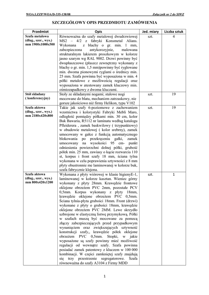 Załącznik nr 2 do SIWZ WOA.I.ZZP/WOA/D-335-138/08 SZCZEGÓŁOWY OPIS PRZEDMIOTU ZAMÓWIENIA Przedmiot Szafa metalowa (dług., szer., wys.) mm 1900x1000x500 Stół składany ( konferencyjny) Szafa aktowa (dług., szer., wys.) mm 2180x420x800 Szafa aktowa (dług., szer., wys.) mm 800x420x1200 Opis Równoważna do szafy metalowej dwudrzwiowej MS2 – 4/2 z fabryki Konsmetal Alians. Wykonana z blachy o gr. min. 1 mm, zabezpieczona antykorozyjnie, malowana strukturalnym lakierem proszkowym w kolorze jasno szarym wg RAL 9002. Drzwi powinny być dwupłaszczowe (płaszcz zewnętrzny wykonany z blachy o gr. min. 1,5 mm)powinny być ryglowane min. dwoma pionowymi ryglami o średnicy min. 25 mm. Szafa powinna być wyposażona w min. 4 półki metalowe z możliwością regulacji oraz wyposażona w atestowany zamek kluczowy min. ośmiozapadkowy z dwoma kluczami. Stoły ze składanymi nogami; stalowe nogi mocowane do blatu, mechanizm zatrzaskowy, nie gorsze jakościowo niż firmy Helikon, typu V102 Takie jak szafy 6-poziomowe z zachowaniem wzornictwa i kolorystyki Fabryki Mebli Maro, odległość pomiędzy półkami min. 30 cm, kolor Buk Bawaria, R5112 nr laminatu według katalogu Pfleiderera , zamek baskwilowy ( trzypunktowy) w obudowie metalowej ( kolor srebrny), zamek umocowany w gałce z funkcją automatycznego blokowania po przekręceniu gałki, zamek umocowany na wysokości 95 cm- punkt odniesienia powierzchni dolnej półki, grubość półek min. 25 mm, zawiasy o kącie rozwarcia 110 st, korpus i front szafy 18 mm, ściana tylna wykonana w celu poprawienia sztywności z 8 mm płyty obustronnie me laminowanej w kolorze buk, szafa fabrycznie klejona. Wykonana z płyty wiórowej w klasie higienyE-1, laminowanej w kolorze kasztan. Wieniec górny wykonany z płyty 28mm. Krawędzie frontowe oklejone obrzeżem PVC 2mm, pozostałe PCV 0,5mm. Korpus wykonany z płyty 18mm, krawędzie oklejone obrzeżem PVC 0,5mm. Ściana tylnia-płyta grubości 18mm. Front (drzwi) wykonane z płyty o grubości 18mm, krawędzie oklejone obrzeżem PVC 2MM. Lewe skrzydło uzbrojone w elastyczną listwę przymykową. Półki w szafach muszą być mocowane za pomocą złączy zabezpieczających przed przypadkowym wysunięciem oraz zwiększających sztywność konstrukcji szafy,, krawędzie półek oklejone obrzeżem PVC 0,5mm. Stopki, w jakie wyposażone są szafy powinny mieć możliwość regulacji od wewnątrz szafy. Szafa powinna posiadać zamek patentowy z kluczem w 100 000 kombinacji. W części zamkniętej szafy znajdują się trzy przestrzenie segregatorowe. Szafa równoważna do szafy A3104 z Firmy MDD 1 Jed. miary szt. Liczba sztuk 4 szt. 19 szt. 19 szt. 1 Załącznik nr 2 do SIWZ WOA.I.ZZP/WOA/D-335-138/08 Szafa aktowa (dług., szer., wys.) mm 800x420x800 Szafka z szufladami (dług., szer., wys.) mm 800x420x400 Szafka na klucze do montażu na ścianie 1300x730x250 ilość haków 780 Wykonana z płyty wiórowej w klasie higieny E-1, laminowanej w kolorze kasztan. Wieniec górny wykonany z płyty 28mm. Krawędzie frontowe oklejone obrzeżem PVC 2mm, pozostałe PCV 0,5mm. Korpus wykonany z płyty 18mm, krawędzie oklejone obrzeżem PVC 0,5mm. Ściana tylnia-płyta grubości 18mm. Front (drzwi) wykonane z płyty o grubości 18mm, krawędzie oklejone obrzeżem PVC 2MM. Lewe skrzydło uzbrojone w elastyczną listwę przymykową. Półki w szafach muszą być mocowane za pomocą złączy zabezpieczających przed przypadkowym wysunięciem oraz zwiększających sztywność konstrukcji szafy, krawędzie półek oklejone obrzeżem PVC 0,5mm. Stopki, w jakie wyposażone są szafy powinny mieć możliwość regulacji od wewnątrz szafy. Szafa powinna posiadać zamek patentowy z kluczem w 100 000 kombinacji. W części zamkniętej szafy znajdują się dwie przestrzenie segregatorowe. \ Szafa równoważna do szafy A2104 z Firmy MDD szafka wykonana z płyty wiórowej w klasie higieny E-1 laminowanej w kolorze kasztan lub zbliżony. Blat kontenera wykonany z płyty grubości, co najmniej 28 mm, korpus również z płyty o grubości, co najmniej 18mm Krawędzie wieńców, czoła szuflad oklejone obrzeżem 2 mm lub grubszym w celu zabezpieczenia krawędzi przed uderzeniem. Pozostałe krawędzie muszą być oklejone obrzeżem PCV o grubości, co najmniej 0,5 mm. Ściana tylna wykonana z płyty laminowanej grubości co najmniej 18 mm. Kontener powinien być wyposażony w trzy szuflady wykonane z płyty laminowanej. Szuflady zamocowane na prowadnicach kulkowych o nośności 35kg. Kontener powinien posiadać centralny zamek z blokadą drugiej szuflady oraz łamany klucz. Korpus kontenera trwale sklejony w celu zapewnienia długotrwałej, precyzyjnej pracy kontenera bez dodatkowych regulacji. Wieniec górny nakładany. W czołach szuflad zamocowane metalowe uchwyty dwupunktowe gwarantujące trwałość oraz wygodę użytkowania. Kontener równoważny do kontenera KW13 z Firmy MDD. Szafka dwudrzwiowa, korpus jednościanowy z wpuszczonymi drzwiami, dwie lub cztery ścianki ruchome, listwy hakowe przestawiane, kolorowe i numerowane, drzwi zamykane zamkiem cylindrycznym, w ścianie tylnej cztery otwory do mocowania, kolor szary. Równoważna do 06007 Model Passau z firmy Inter-Sicherheits-Service 2 szt. 1 szt. 1 Szt. 1