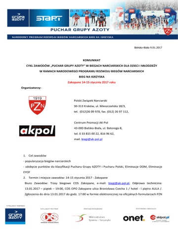 Bielsko-Biała 9.01.2017 KOMUNIKAT CYKL ZAWODÓW „PUCHAR GRUPY AZOTY” W BIEGACH NARCIARSKICH DLA DZIECI I MŁODZIEŻY W RAMACH NARODOWEGO PROGRAMU ROZWOJU BIEGÓW NARCIARSKICH BIEG NA IGRZYSKA Zakopane 14-15 stycznia 2017 roku Organizatorzy: Polski Związek Narciarski 30-313 Kraków, ul. Mieszczańska 18/3, tel. (012)26 09 970, fax. (012) 26 97 112, Centrum Promocji AK-Pol 43-000 Bielsko-Biała, ul. Batorego 8, tel. 0 33 815 00 22, 816 96 62, mail. [email protected] 1. Cel zawodów - popularyzacja biegów narciarskich - zdobycie punktów do klasyfikacji Pucharu Grupy AZOTY i Pucharu Polski, Eliminacje OOM, Eliminacje EYOF 2. Termin i miejsce zawodów: 14-15 stycznia 2017 - Zakopane Biuro Zawodów: Trasy biegowe COS Zakopane, e-mail: [email protected], Odprawa techniczna: 13.01.2017 – piątek – 19:00, COS OPO Zakopane ulica Bronisława Czecha 1 / hotel - I piętro AULA /. Zgłoszenia do dnia 13.01.2017 do godz. 17:00 w formie elektronicznej na oficjalnych formularzach PZN na adres [email protected]. Weryfikacja zgłoszonych zawodników będzie odbywać się w godzinach od 17:00 do 19:00 przez delegata technicznego. Kierownikiem zawodów będzie Pani Barbara Sobańska. 3. Uczestnictwo – prawo startu mają zawodnicy posiadający licencje zgodnie z wytycznymi PZN. W Pucharze Grupy AZOTY /za wyjątkiem zawodów finałowych/ nie startują juniorzy E, dla których startem głównym w sezonie 2017 są Ligi Regionalne Grupy AZOTY /zgodnie z odrębnym regulaminem/. 4. Ekipy poszczególnych klubów narciarskich przyjeżdżają na zawody na własny koszt (wyżywienie i noclegi). 5. Program zawodów: l.p. miejsce data senior A B C D 1 Zakopane 14.01.2017 10 km CL (M) 5 km CL (K) 10 km CL (M) 5 km CL (K) 5 km CL (M) 5 km CL (K) 3 km CL (M) 3 km CL (K) 3 km CL (M) 3 km CL (K) 2 Zakopane 15.01.2017 15 km F (M) 10 km F (K) 15 km F (M) 10 km F (K) 7,5 km F (M) 7,5 km F(K) 5 km F (M) 5 km F (K) 3 km F (M) 3 km F (K) Start zawodów o godzinie 10:00. 6. Zawodnicy biorący udział w zawodach muszą posiadać ważne badania lekarskie zezwalające na start w imprezie oraz ubezpieczenie od następstw nieszczęśliwych wypadków. 7. Organizator nie ponosi odpowiedzialności za ewentualne zaistniałe nieszczęśliwe wypadki podczas trwania imprezy oraz zastrzega sobie prawo zmiany programu zawodów 8. Zawody zostaną rozegrane zgodnie z Narciarskim Regulaminem Sportowym PZN, oraz regulaminem „Puchar Grupy AZOTY”. 9. Organizator zapewnia w trakcie trwania zawodów posiłek oraz gorące napoje dla wszystkich zawodników, trenerów, opiekunów oraz sędziów biorących udział w zawodach. Ze sportowym pozdrowieniem Dyrektor „Bieg na Igrzyska” Sławomir Strzelczyk