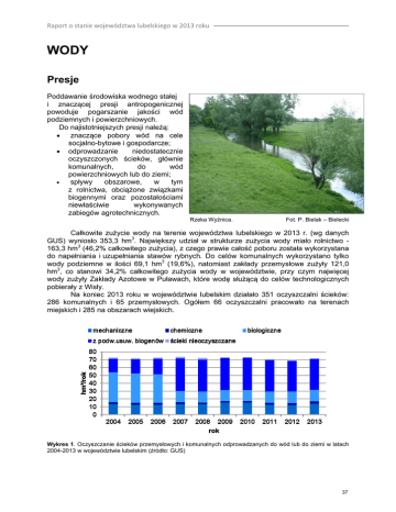 Raport o stanie województwa lubelskiego w 2013 roku WODY Presje Poddawanie środowiska wodnego stałej i znaczącej presji antropogenicznej powoduje pogarszanie jakości wód podziemnych i powierzchniowych. Do najistotniejszych presji należą: znaczące pobory wód na cele socjalno-bytowe i gospodarcze; odprowadzanie niedostatecznie oczyszczonych ścieków, głównie komunalnych, do wód powierzchniowych lub do ziemi; spływy obszarowe, w tym z rolnictwa, obciążone związkami biogennymi oraz pozostałościami niewłaściwie wykonywanych zabiegów agrotechnicznych. Rzeka Wyżnica. Fot. P. Bielak – Bielecki Całkowite zużycie wody na terenie województwa lubelskiego w 2013 r. (wg danych GUS) wyniosło 353,3 hm3. Największy udział w strukturze zużycia wody miało rolnictwo 163,3 hm3 (46,2% całkowitego zużycia), z czego prawie całość poboru została wykorzystana do napełniania i uzupełniania stawów rybnych. Do celów komunalnych wykorzystano tylko wody podziemne w ilości 69,1 hm3 (19,6%), natomiast zakłady przemysłowe zużyły 121,0 hm3, co stanowi 34,2% całkowitego zużycia wody w województwie, przy czym najwięcej wody zużyły Zakłady Azotowe w Puławach, które wodę służącą do celów technologicznych pobierały z Wisły. Na koniec 2013 roku w województwie lubelskim działało 351 oczyszczalni ścieków: 286 komunalnych i 65 przemysłowych. Ogółem 66 oczyszczalni pracowało na terenach miejskich i 285 na obszarach wiejskich. Wykres 1. Oczyszczanie ścieków przemysłowych i komunalnych odprowadzanych do wód lub do ziemi w latach 2004-2013 w województwie lubelskim (źródło: GUS) 37 Raport o stanie województwa lubelskiego w 2013 roku W 2013 r. z terenu województwa lubelskiego odprowadzono do wód lub do ziemi 71,28 hm3 ścieków komunalnych i przemysłowych wymagających oczyszczania. Z tej liczby 71,01 hm3 (99,6%) było oczyszczanych, a tylko 0,27 hm3 odprowadzono bez oczyszczania. Struktura oczyszczania ścieków w 2013 r. przedstawiała się następująco: oczyszczane mechanicznie - 13,83 hm3 (19,5%), oczyszczane chemicznie (tylko ścieki przemysłowe) - 2,66 hm3 (3,7%), oczyszczane biologicznie - 15,05 hm3 (21,2%), oczyszczane z podwyższonym usuwaniem biogenów 39,47 hm3 (55,6%). Od 2007 r. w strukturze oczyszczania ścieków nastąpiły pozytywne zmiany, wzrosła ilość ścieków oczyszczanych z podwyższanym usuwaniem substancji biogennych (wykres 1). Z uwagi na poprawę jakości oczyszczania ścieków, znacznie zmniejszyły się ładunki wprowadzanych zanieczyszczeń do wód lub do ziemi. W stosunku do 2004 roku ładunek fosforu ogólnego zmniejszył się o około 81%, ładunek azotu ogólnego o 47%, natomiast ładunki BZT5 i zawiesiny ogólnej o około 30%. BZT5 CHZT zawiesina ogólna azot ogólny fosfor ogólny 7000000 6000000 [kg/rok] 5000000 4000000 3000000 2000000 1000000 0 2004 2005 2006 2007 2008 2009 2010 2011 2012 2013 rok Wykres 2. Ładunki wprowadzanych zanieczyszczeń do wód lub do ziemi w latach 2004-2013 w województwie lubelskim (źródło: GUS) Z oczyszczalni ścieków korzystało 55,5% ludności województwa lubelskiego, przy czym 94,5%, korzystających to mieszkańcy miast, a 22% to mieszkańcy wsi. Długość sieci kanalizacyjnej na koniec roku 2013 wynosiła 5 538 km, a sieci wodociągowej 20 583 km. W stosunku do roku poprzedniego przybyło 214,0 km kanalizacji i 257,6 km wodociągów. Wykres 3. Sieć kanalizacyjna i wodociągowa w województwie lubelskim w latach 2004-2013 (źródło: GUS) 38 Raport o stanie województwa lubelskiego w 2013 roku Analiza danych GUS wskazuje na sukcesywny wzrost infrastruktury wodno-ściekowej oraz wzrost liczby mieszkańców korzystających z oczyszczalni ścieków. Niemniej jednak niedostateczna sanitacja, szczególnie obszarów wiejskich, przejawiająca się wyraźnymi dysproporcjami między wyposażeniem w sieć wodociągową i kanalizacyjną, ma istotny wpływ na stan jakościowy wód powierzchniowych. Według danych GUS na koniec 2013 roku, długość sieci kanalizacyjnej na obszarze województwa lubelskiego stanowiła 27% długości sieci wodociągowej. Istotnym źródłem presji na środowisko wodne jest rolnictwo, w szczególności stosowanie nawozów mineralnych i naturalnych oraz środków ochrony roślin. Wpływ na jakość wód powierzchniowych mają spływy powierzchniowe z terenów użytkowanych rolniczo, zawierające związki azotu i fosforu, będące pozostałością po stosowanych nawozach sztucznych i naturalnych. Zanieczyszczenia biogenami powodują nadmierny rozwój glonów i prowadzą do eutrofizacji wód. Intensywnie rozwijające się glony zużywają duże ilości tlenu, którego niedobór hamuje rozwój innych organizmów wodnych. Zużycie nawozów mineralnych (NPK) w roku gospodarczym 2011/2012 w województwie lubelskim wynosiło 122,8kg na 1 ha i było wyższe o 6,4% w stosunku do roku poprzedniego (wykres 4). Wzrosło głównie zużycie nawozów azotowych, przy zaobserwowanym dużym spadku stosowania nawozów wapniowych: z 40,3 kg na 1ha w roku gospodarczym 2010/2011 do 26,8 kg na 1ha użytków rolnych w roku gospodarczym 2011/2012. Stosowanie obornika kształtowało się na zbliżonym poziomie około 40 kg na 1ha użytków rolnych. Wzrost zużycia nawozów sztucznych i środków ochrony roślin związane było z rozwojem produkcji rolnej. Presję rolnictwa na środowisko wodne powinno jednak w znacznym stopniu ograniczyć stosowanie dobrych praktyk rolniczych. mineralne ogółem (NPK) wapniowe obornik (NPK) kg/ha użytków rolnych 140 120 100 80 60 40 20 0 2003/2004 2004/2005 2005/2006 2006/2007 2007/2008 2008/2009 2009/2010 2010/2011 2011/2012 rok gospodarczy Wykres 4. Zużycie nawozów sztucznych( NPK), wapniowych i obornika w przeliczeniu na czysty składnik w latach 2004-2012 w województwie lubelskim (źródło: GUS) 39