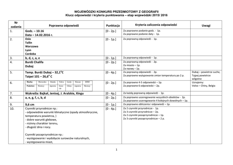 WOJEWÓDZKI KONKURS PRZEDMIOTOWY Z GEOGRAFII Klucz odpowiedzi i kryteria punktowania – etap wojewódzki 2015/ 2016 Nr zadania 1. Poprawna odpowiedź Punktacja Kryteria zaliczenia odpowiedzi Godz. – 10.16 Data – 14.02.2016 r. [0 - 2p.] Za poprawne podanie godz. - 1p. Za poprawne podanie daty - 1p. 2. Oslo Tallin Warszawa Lyon Cordoba [0 - 1p.] Za poprawną odpowiedź - 1p. 3. 4. b, d, c, a, e Burdż Chalifa Dubaj [0 - 1p.] [0 - 2p.] Za poprawną odpowiedź - 1p. 5. Temp. Burdż Dubaj – 32,1oC Taipei 101 – 26,6o C [0 - 4p.] 6. Marka Mercedes Honda Volvo Geely Nissan BMW Państwo Niemcy Japonia Szwe cja Chiny Japonia Niemcy [0 - 2p.] Za poprawne 4-5 odpowiedzi – 1p. Za poprawne 6 odpowiedzi – 2p. Za każdą poprawną odpowiedź - 1p. 7. 8. Wykreśla: Bajkał, Jenisej, J. Aralskie, Xingu a, e, g, f, c, b, d [0 - 4p.] [0 - 2p.] 9. 10. 9,6 cm [0 - 1p.] [0 - 4p.] Czynniki przyrodnicze np.: - odpowiednie warunki klimatyczne (opady atmosferyczne, temperatura powietrza, ) - dobre warunki glebowe, - nizinny charakter terenu, - długość dnia i nocy. Za poprawną odpowiedź - 2p. Za miasto – 1p. Za nazwę – 1p. Za poprawną odpowiedź - 2p. Za poprawne wytypowanie zmian temperatury po 2 p. Czynniki pozaprzyrodnicze np.: - występowanie i wydobycie surowców naturalnych, - występowania miast, 1 Za poprawne uszeregowanie wszystkich obiektów - 2p. Za poprawne uszeregowanie 4 kolejnych dowolnych – 1p. Za poprawne obliczenia i odpowiedź – 1p. Za 2 czynniki przyrodnicze - 1p. Za 3 czynniki przyrodnicze – 2p. Za 2 czynniki pozaprzyrodnicze – 1p. Za 3 czynniki pozaprzyrodnicze – 2 p. Uwagi Dubaj – powietrze suche, Tajpej powietrze wilgotne Uznajemy: Volvo – Chiny, Belgia - dobrze rozwinięty przemysł, - dobrze rozwinięta infrastruktura drogowa 11. 1-6 – Prawda 7-10 – Fałsz [0 - 10p.] Za każdą poprawną odpowiedź - 1p. 12. - wojny i konflikty zbrojne, - brak żywności i wody, - klęski żywiołowe, - poszukiwanie pracy i lepszego standardu życia, - cele edukacyjne, - prześladowania religijne i światopoglądowe. [0 - 3p.] Za każdą poprawną odpowiedź - 1p. [0 - 2p.] Za poprawne obliczenia - 1p. Za poprawny wynik z jednostką – 1p. C 3 [0 - 3p.] Za każde dwie poprawne odpowiedzi - 1p. Zastosowanie wzoru na szerokość geograficzną w dniu przesilenia letniego na półkuli północnej. [0 – 4p.] Za zastosowanie wzoru na obliczenie szer. geograf. – 1p. Za poprawne obliczenie i wynik z jednostką szerokości geograficznej – 1p. Za poprawne obliczenie różnicy długości geograficznej – 1p. Za poprawny wynik z jednostką długości – 1p. W sumie maksymalnie 4p. [0 – 1p.] [0 – 4p.] Za prawidłową odpowiedź – 1 p. [0 – 6 p.] Za każdą prawidłowo rozpoznaną parę państwo i stolica po 1p. Za każde prawidłowo rozpoznane dwa państwa – 3p. 13. 5042 m n.p.m. – 0 m n.p.m. = 5042 m 5042m/ 6300km= 0,8 ‰ 14. 15. Lp. 1. 2. 3. 4. 5. 6. Parametr Powierzchnia Liczba ludności Wydobycie węgla kamiennego Produkcja samochodów osobowych Produkcja owoców Produkt Krajowy Brutto A B 1 1 1 1 2 Szerokość geograficzna – 53o27’ N Długość geograficzna – 15oE 60o/4’ = 15 o 16. 17. 18. 4 A. B. C. D. d. Kanada e. Afganistan e. Filipiny e. Nowa Zelandia A. Turcja – Ankara B. Wenezuela – Caracas C. Namibia – Windhuk 2 Za każde poprawne wykreślenie – 1 p. D. Mongolia – Ułan Bator E. Sudan Południowy – Dżuba F. Madagaskar – Antananarywa Lp. 1. 2. 19. 3. 4. 5. 6. 7. 8. 20. Lp. 1 2 3 4 5 6 Forma Grzyb skalny Dolina lodowcowa Dolina rzeczna Delta Gołoborza Jaskinia Mogot Batolit Proces Wietrzenie fizyczne Erozja lodowcowa [0 – 4p.] Za każde dwa prawidłowe przypisanie procesu po 1p. W sumie maksymalnie 4p. Erozja rzeczna Akumulacja rzeczna Wietrzenie fizyczne Wietrzenie chemiczne Wietrzenie chemiczne Plutonizm Roślina uprawna [0 – 6p.] Za każde prawidłowe przyporządkowanie uprawy – 1p. [0 – 1p.] Za prawidłowe wykreślenie dat – 1p. [0 – 4p.] Za każde prawidłowe rozpoznanie piramidy po 1p. Porzeczka Soja Pszenżyto Jabłka Agrest Ryż 21. Wykreślone daty: 1700, 1900, 2100 22. 23. A. Chiny B. ZEA C. Japonia D. Iran C. Indie E. Indonezja A. Brazylia F. Filipiny D. Iran B. Francja W sumie maksymalnie 4p. [0 – 2p.] 3 Za prawidłowe uszeregowanie wszystkich państw – 1p. Za prawidłowe uszeregowanie 4 państw – 1p. Za wykreślenie więcej niż 3 dat -0 p. 24. 25. 26. 27. Lp. 1. 2. 3. 4. 5. 6. 7. 8. 9. 10. Odp. [0 – 10p.] Za każdą prawidłową odpowiedź po 1p. [0 – 4p.] Za każda poprawna fazę Księżyca po 1p. [0 – 1p.] [0 – 12p.] Za prawidłowe obliczenia i wynik – 1p. X X X X X X 2. pierwsza kwadra 4. pełnia 6. ostatnia kwadra 8. nów Ok. 10000 km Lp. 1. 2. 3. 4. 5. 6. 7. 8. Obiekt Rzeka Rzeka Rzeka Rzeka Morze Morze Morze Morze Nazwa Żółta Eufrat Lena Brahmaputra Ochockie Żółte Sulu Jawajskie Lp. 14. 15. 16. 17. 18. 19. 20. 21. Obiekt Pustynia Kotlina Wyspa Wyspa Wyżyna Góry Góry Wyżyna 9. 10. 11. 12. 13. Zatoka Zatoka Zatoka Półwysep Półwysep Tonkińska Tajlandzka Omańska Kathijawar Malajski 22. 23. 24. 25. 26. Półwysep Państwo Państwo Państwo Wyspa Nazwa Ałaszan Dżungarska Kiusiu Luzon Dekan Zagros Arakańskie ŚrodkowoSyberyjska Kamczatka Uzbekistan Jemen Korea Pd. Celebes Za 26 obiektów – 12 p. Za 25-24 – 11p. Za 23-22 – 10p. Za 21-20 – 9p. Za 19-18 – 8p. Za 17-16 – 7p. Za 15-14 – 6p. Za 13-12– 5p. Za 11-10 – 4p. Za 9- 3p. Za 8 – 2p. Za 7 – 1p. Za 6 i mniej obiektów 0 p. Razem: 100 p. 80% punktów - 80 p. 4