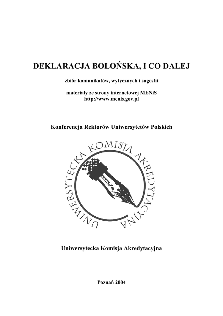 DEKLARACJA BOLOŃSKA, I CO DALEJ zbiór komunikatów, wytycznych i sugestii materiały ze strony internetowej MENiS http://www.menis.gov.pl Konferencja Rektorów Uniwersytetów Polskich Uniwersytecka Komisja Akredytacyjna Poznań 2004 Słowo wstępne Ponad 10 lat temu na polskich uniwersytetach rozpoczęły się bardzo istotne procesy restrukturyzacyjne obejmujące stopniowo całokształt życia akademickiego, badania naukowe, nauczanie i zarządzanie. Od samego początku procesy te były realizowane dzięki różnorodnym programom pomocowym stworzonym przez Unię Europejską - Jean Monett, Tempus, Sokrates, Erasmus, Leonardo. Nasze uczelnie umiejętnie wykorzystały tę niezwykłą szansę do szybkiego dostosowania się do standardów funkcjonowania dobrych uniwersytetów europejskich. Równocześnie pod koniec lat 90 ubiegłego stulecia 4 kraje Unii Europejskiej Francja, Niemcy, Wielka Brytania i Włochy podpisały Deklarację Sorbońską (25.05.1998 r.), w której sformułowano idee harmonizacji systemów szkolnictwa wyższego w krajach unijnych. Ogromne znaczenie tej idei dla przyspieszonego rozwoju Europy dostrzeżono natychmiast. Już rok później ministrowie edukacji aż z 29 Krajów Europy w tym także z Polski podpisali tak zwaną Deklarację Bolońską, która zapoczątkowała realizację Procesu Bolońskiego. Na kolejnych spotkaniach ministrów (Praga 2001 - 33 państwa, Berlin 2003 - 40 państw), sformułowano ideę tworzenia Europejskiej Przestrzeni Szkolnictwa Wyższego i Europejskiej Przestrzeni Badawczej (Rada Europejska Lizbona marzec 2000 r.) Oba te procesy zmierzają do osiągnięcia w roku 2010 wizji Europy Wiedzy (Europe of Knowledge). Proces Boloński jest w warunkach europejskich zjawiskiem wyjątkowym. Po pierwsze wykracza daleko poza Kraje Unii Europejskiej (15+10) bo dziś obejmuje już ponad 40 krajów. Zmierza do harmonizacji a nie ujednolicenia przyjmując, że w różnorodności zharmonizowanych systemów będzie tkwiła potężna siła prorozwojowa, z pełnym poszanowaniem autonomii uczelni. Deklaracja Bolońska wskazuje tylko ogólnie sposoby realizacji głównych celów: - wprowadzenie systemu porównywalnych dyplomów; - wprowadzenie studiów 2 i 3 stopniowych; - wprowadzenie ECTS czyli punktowego systemu rozliczania osiągnięć studentów - wdrażanie mobilności studentów i pracowników w skali europejskiej; - współdziałanie w zakresie wysokiej jakości edukacji; - propagowanie problematyki europejskiej w kształceniu; - wdrażanie systemów kształcenia ustawicznego (Life Long Learning); - czynny udział we wdrażaniu Procesu władz uczelni, pracowników i studentów jako podstawowy warunek sukcesu. Nasze uniwersyteckie doświadczenia z realizacji programów pomocowych pozwoliły na włączenie się - niejako w biegu - do realizacji Procesu Bolońskiego. Jesteśmy zaawansowani we wdrożenie systemu ECTS, na wielu kierunkach realizowane są programy studiów w systemie 3+2 w coraz większym stopniu uzupełnione +4 (studia doktoranckie). Wdrażamy z coraz lepszymi rezultatami program mobilności studentów w skali miedzyuniwersyteckiej – Most, nasze uczelnie poprzez wprowadzanie studiów w języku angielskim przygotowują się do europejskiej mobilności studentów (przy wykorzystaniu w szerokim zakresie doświadczeń z programów pomocowych Tempus i Sokrates). W ścisłej współpracy z MENiS przygotowujemy się do wydawania suplementów do dyplomu. Wypracowany przez Uniwersytety system wewnętrznej (miedzyuniwersyteckiej) oceny jakości kształcenia (UKA) jest wysoko oceniany w skali europejskiej. W naszej ocenie jest bardzo dobrym uzupełnieniem akredytacji realizowanej przez Państwową Komisję Akredytacyjną. Zmieniamy systemy nauczania języków obcych w celu poprawy ich efektywności, rozwijamy kształcenie miedzyuniwersyteckie interdyscyplinarne (Academia Artes Liberales i inne inicjatywy). Mamy pełną świadomość, że nie we wszystkich kierunkach studiów uniwersyteckich procesy te przebiegają jednakowo, że pojawiają się trudności wynikające zarówno z problemów finan- sowych i organizacyjnych jak i niezrozumienia i braku akceptacji ze strony części środowiska akademickiego. Dlatego też z inicjatywy Konferencji Rektorów Uniwersytetów Polskich rozpoczęliśmy przegląd stopnia wdrażania Procesu Bolońskiego na wszystkich uniwersytetach. Już wstępna analiza ankiety pozwala nam na sformułowanie tezy, że polskie uniwersytety odgrywają czołową rolę we wdrażaniu procesu bolońskiego nie tylko w skali krajowej ale także europejskiej. Dzięki wdrożeniu Procesu Bolońskiego mamy niezwykłą szansę na szybką modernizację naszych Uczelni. Cieszy nas fakt, że w tych procesach mamy coraz większe wsparcie ze strony Ministerstwa Edukacji Narodowej i Sportu. Głęboko wierzę, że tę wielką szansę naszym zbiorowym wysiłkiem potrafimy wykorzystać. Marian Harasimiuk Przewodniczący Konferencji Rektorów Uniwersytetów Polskich Wprowadzenie Marek Wąsowicz Realizacja Procesu Bolońskiego weszła w fazę istotnego przyspieszenia. Konferencja Ministrów, która odbyła się w Berlinie we wrześniu 2003 r., podjęła decyzję o wdrożeniu do końca 2005 r. postanowień Deklaracji dotyczących wprowadzenia 2-cyklowego systemu studiów, punktowego systemu zaliczania osiągnięć studentów (ECTS), suplementu do dyplomu oraz systemu oceny jakości studiów. Przyspieszenie terminów realizacji postanowień Deklaracji rodzi konieczność pilnego podjęcia dyskusji w naszym środowisku uniwersyteckim nad stopniem ich wdrożenia. Pomocą w zainicjowaniu takiej dyskusji jest Ankieta przeprowadzona przez UKA z inicjatywy KRUP. Materiał przesłany przez 18 wyższych uczelni uniwersyteckich stanowi dobry materiał pozwalający zorientować się jak przebiega proces realizacji procesu bolońskiego, w których jego obszarach jesteśmy zaawansowani, a w których pozostajemy opóźnieni. Wskazanie tych obszarów i próbę dokonania b