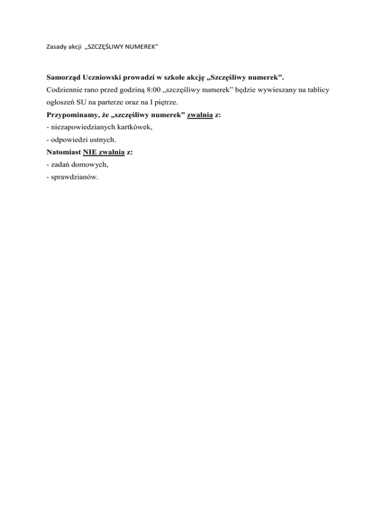 Zasady akcji „SZCZĘŚLIWY NUMEREK” Samorząd Uczniowski prowadzi w szkole akcję „Szczęśliwy numerek”. Codziennie rano przed godziną 8:00 „szczęśliwy numerek” będzie wywieszany na tablicy ogłoszeń SU na parterze oraz na I piętrze. Przypominamy, że „szczęśliwy numerek” zwalnia z: - niezapowiedzianych kartkówek, - odpowiedzi ustnych. Natomiast NIE zwalnia z: - zadań domowych, - sprawdzianów.