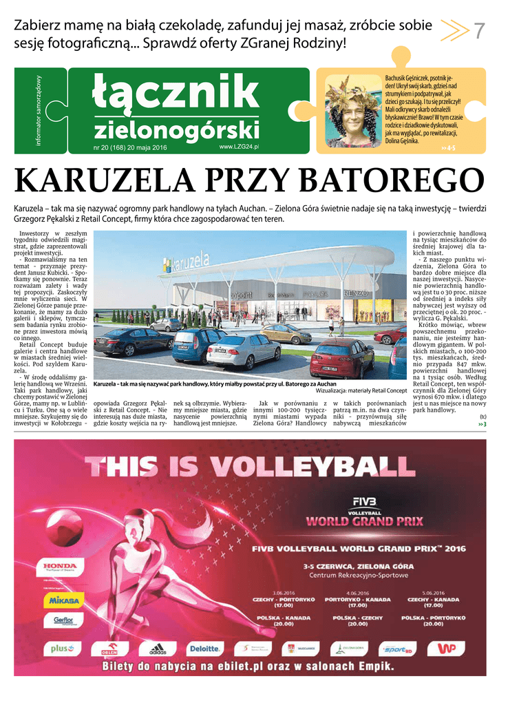 Zabierz mamę na białą czekoladę, zafunduj jej masaż, zróbcie sobie sesję fotograficzną... Sprawdź oferty ZGranej Rodziny! nr 20 (168) 20 maja 2016 7 Bachusik Gęśniczek, psotnik jeden! Ukrył swój skarb, gdzieś nad strumykiem i podpatrywał, jak dzieci go szukają. I tu się przeliczył! Mali odkrywcy skarb odnaleźli błyskawicznie! Brawo! W tym czasie rodzice i dziadkowie dyskutowali, jak ma wyglądać, po rewitalizacji, Dolina Gęśnika. >> 4-5 KARUZELA PRZY BATOREGO Karuzela – tak ma się nazywać ogromny park handlowy na tyłach Auchan. – Zielona Góra świetnie nadaje się na taką inwestycję – twierdzi Grzegorz Pękalski z Retail Concept, firmy która chce zagospodarować ten teren. Inwestorzy w zeszłym tygodniu odwiedzili magistrat, gdzie zaprezentowali projekt inwestycji. - Rozmawialiśmy na ten temat – przyznaje prezydent Janusz Kubicki. – Spotkamy się ponownie. Teraz rozważam zalety i wady tej propozycji. Zaskoczyły mnie wyliczenia sieci. W Zielonej Górze panuje przekonanie, że mamy za dużo galerii i sklepów, tymczasem badania rynku zrobione przez inwestora mówią co innego. Retail Concept buduje galerie i centra handlowe w miastach średniej wielkości. Pod szyldem Karuzela. - W środę oddaliśmy galerię handlową we Wrześni. Taki park handlowy, jaki chcemy postawić w Zielonej Górze, mamy np. w Lublińcu i Turku. One są o wiele mniejsze. Szykujemy się do inwestycji w Kołobrzegu – i powierzchnię handlową na tysiąc mieszkańców do średniej krajowej dla takich miast. - Z naszego punktu widzenia, Zielona Góra to bardzo dobre miejsce dla naszej inwestycji. Nasycenie powierzchnią handlową jest tu o 30 proc. niższe od średniej a indeks siły nabywczej jest wyższy od przeciętnej o ok. 20 proc. – wylicza G. Pękalski. Krótko mówiąc, wbrew powszechnemu przekonaniu, nie jesteśmy handlowym gigantem. W polskich miastach, o 100-200 tys. mieszkańcach, średnio przypada 847 mkw. powierzchni handlowej na 1 tysiąc osób. Według Retail Concept, ten współKaruzela – tak ma się nazywać park handlowy, który miałby powstać przy ul. Batorego za Auchan Wizualizacja: materiały Retail Concept czynnik dla Zielonej Góry wynosi 670 mkw. i dlatego opowiada Grzegorz Pękal- nek są olbrzymie. WybieraJak w porównaniu z w takich porównaniach jest u nas miejsce na nowy ski z Retail Concept. – Nie my mniejsze miasta, gdzie innymi 100-200 tysięcz- patrzą m.in. na dwa czyn- park handlowy. interesują nas duże miasta, nasycenie powierzchnią nymi miastami wypada niki – przyrównują siłę (tc) gdzie koszty wejścia na ry- handlową jest mniejsze. Zielona Góra? Handlowcy nabywczą mieszkańców >> 3 2 łącznik zielonogórski 20 maja 2016 www.Lzg24.pl Z ŻYCIA MIASTA >>> Studenci przejęli władzę w Zielonej Górze! Prezydent trochę opierał się z oddaniem klucza do bram miasta, ale w końcu odpuścił i chyba nie ma czego żałować. Bachanalia kręcą się aż miło! A ze studentami bawi się całe miasto! Nasz fotoreporter podpatrywał żaków przez trzy pierwsze dni imprezy. Na zdjęciach: przekazanie klucza, zjazd na byle czym i po raz pierwszy w programie – turniej FootBubbleBall. Dni Kultury Studenckiej potrwają aż do soboty. Zdjęcia Krzysztof Grabowski W ZIELONEJ GÓRZE Konwaliowe urodziny Zielonogórska Szkoła Ta�ca Gracja świętuje 30. urodziny! Jubileusz pięknie zbiega się w czasie z tradycyjnym Konwaliowym Turniejem Ta�ca. Ten weekend należy do Gracji! Koszykarska twierdza CRS na dwa dni zapomni o twardej męskiej walce i zamieni się w świat pełen powabu, gracji, tanecznego kunsztu, zapachnie może konwaliami... Co nie znaczy, że na parkiecie hali będzie lekko! Wszak to Konwaliowy Turniej Tańca, gdzie prezentują się najlepsi tancerze z Polski. Zapowiada się poważna rywalizacja! Widownia, oprócz zmagań turniejowych, zobaczy też popisy dzieci uczących się w znanej zielonogórskiej szkole tańca. – Moja Aga, choć nie bierze udziału w turnieju, nie może się doczekać weekendu! Tańczy, ćwiczy, czasem w najmniej spodziewanym miejscu i czasie – przyznaje ze śmiechem, ale i z dumą Joanna Warzywoda, mama 11-letniej tancerki z Gracji. Agnieszka specjalizuje się w tańcu nowoczesnym, wraz z koleżankami wystąpią w niedzielę jako straszliwe zombie. Trzeba się jeszcze odpowiednio ucharakteryzować! Cała rodzina szykuje się do kibicowania! Organizatorzy zapraszają nie tylko rodziców, rodzeństwo i dziadków, ale wszystkich mieszkańców do współuczestniczenia w tanecznym święcie. W sobotę od godz. 9.00, w niedzielę od 10.00. Koncert galowy w pierwszy dzień, o 18.00. Szczegóły na www. gracja-taniec.pl. (dsp) PIÓRKIEM CEPERA >>>>> Łącznik Zielonogórski - bezpłatny informator samorządowy ISSN 2299-761X Redakcja: al. Niepodległości 13, 65-048 Zielona Góra e-mail: [email protected], tel. 68 415 22 44 Redaktor naczelny: Tomasz Czyżniewski Redaktor prowadząca: Daria Śliwińska-Pawlak Wydawca: Urząd Miasta Zielona Góra, ul. Podgórna 22, 65-424 Zielona Góra Nakład: 40 tys. Spędź noc w muzeum. Do wyboru masz... trzy! Tego jeszcze nie było! Na noc muzeów zapraszają wspólnie trzy placówki. Czeka Was podróż do Grecji, pojedynki rycerskie i odkrywanie skarbów. Rezerwujcie sobotni wieczór! Od bezpłatnych atrakcji przygotowanych na tę noc może zakręcić się w głowie! Kuszą nas wspólnie: Muzeum Ziemi Lubuskiej w Zielonej Górze, Lubuskie Muzeum Wojskowe w Drzonowie oraz Muzeum Archeologiczne Środkowego Nadodrza w Świdnicy. Co wybrać? Noc tylko jedna! – Bez obaw! O tym też pomyśleliśmy – uspokaja Leszek Kania, dyrektor MZL. - Bezpłatne autobusy MZK będą kursować między muzeami w Zielonej Górze i Drzonowie. Każdy będzie mógł wybierać w programie, nie przejmując się czasem i odległością (kursy w ramce – red.). W roli gospodarza nocnych atrakcji debiutuje świdnicka placówka. – U nas nie będzie takich fajerwerków jak u kolegó