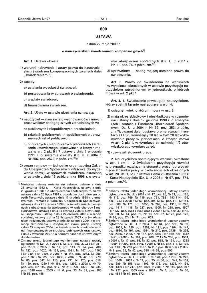 Dziennik Ustaw Nr 97 — 7211 — Poz. 800 800 USTAWA z dnia 22 maja 2009 r. o nauczycielskich Êwiadczeniach kompensacyjnych1) mie ubezpieczeƒ spo∏ecznych (Dz. U. z 2007 r. Nr 11, poz. 74, z póên. zm.3)); Art. 1. Ustawa okreÊla: 1) warunki nabywania i utraty prawa do nauczycielskich Êwiadczeƒ kompensacyjnych zwanych dalej „Êwiadczeniami”; 2) zasady: a) ustalania wysokoÊci Êwiadczeƒ, b) post´powania w sprawach o Êwiadczenia, c) wyp∏aty Êwiadczeƒ, d) finansowania Êwiadczeƒ. Art. 2. U˝yte w ustawie okreÊlenia oznaczajà: 1) nauczyciel — nauczycieli, wychowawców i innych pracowników pedagogicznych zatrudnionych w: a) publicznych i niepublicznych przedszkolach, b) szko∏ach publicznych i niepublicznych o uprawnieniach szkó∏ publicznych, c) publicznych i niepublicznych placówkach kszta∏cenia ustawicznego i placówkach, o których mowa w art. 2 pkt 5 i 7 ustawy z dnia 7 wrzeÊnia 1991 r. o systemie oÊwiaty (Dz. U. z 2004 r. Nr 256, poz. 2572, z póên. zm.2)); 2) organ rentowy — jednostk´ organizacyjnà Zak∏adu Ubezpieczeƒ Spo∏ecznych w∏aÊciwà do wydawania decyzji w sprawach Êwiadczeƒ, okreÊlonà w ustawie z dnia 13 paêdziernika 1998 r. o syste——————— 1) 2) Niniejszà ustawà zmienia si´ ustawy: ustaw´ z dnia 26 stycznia 1982 r. — Karta Nauczyciela, ustaw´ z dnia 20 grudnia 1990 r. o ubezpieczeniu spo∏ecznym rolników, ustaw´ z dnia 26 lipca 1991 r. o podatku dochodowym od osób fizycznych, ustaw´ z dnia 17 grudnia 1998 r. o emeryturach i rentach z Funduszu Ubezpieczeƒ Spo∏ecznych, ustaw´ z dnia 25 czerwca 1999 r. o Êwiadczeniach pieni´˝nych z ubezpieczenia spo∏ecznego w razie choroby i macierzyƒstwa, ustaw´ z dnia 13 czerwca 2003 r. o zatrudnieniu socjalnym, ustaw´ z dnia 27 czerwca 2003 r. o rencie socjalnej, ustaw´ z dnia 28 listopada 2003 r. o Êwiadczeniach rodzinnych, ustaw´ z dnia 20 kwietnia 2004 r. o promocji zatrudnienia i instytucjach rynku pracy, ustaw´ z dnia 27 sierpnia 2004 r. o Êwiadczeniach opieki zdrowotnej finansowanych ze Êrodków publicznych oraz ustaw´ z dnia 7 wrzeÊnia 2007 r. o pomocy osobom uprawnionym do alimentów. Zmiany tekstu jednolitego wymienionej ustawy zosta∏y og∏oszone w Dz. U. z 2004 r. Nr 273, poz. 2703 i Nr 281, poz. 2781, z 2005 r. Nr 17, poz. 141, Nr 94, poz. 788, Nr 122, poz. 1020, Nr 131, poz. 1091, Nr 167, poz. 1400 i Nr 249, poz. 2104, z 2006 r. Nr 144, poz. 1043, Nr 208, poz. 1532 i Nr 227, poz. 1658, z 2007 r. Nr 42, poz. 273, Nr 80, poz. 542, Nr 115, poz. 791, Nr 120, poz. 818, Nr 180, poz. 1280 i Nr 181, poz. 1292, z 2008 r. Nr 70, poz. 416, Nr 145, poz. 917, Nr 216, poz. 1370 i Nr 235, poz. 1618 oraz z 2009 r. Nr 6, poz. 33, Nr 31, poz. 206 i Nr 56, poz. 458. 3) uprawniony — osob´ majàcà ustalone prawo do Êwiadczenia. Art. 3. Prawo do Êwiadczenia na warunkach i w wysokoÊci okreÊlonych w ustawie przys∏uguje nauczycielom zatrudnionym w jednostkach, o których mowa w art. 2 pkt 1. Art. 4. 1. Âwiadczenie przys∏uguje nauczycielom, którzy spe∏nili ∏àcznie nast´pujàce warunki: 1) osiàgn´li wiek, o którym mowa w ust. 3; 2) majà okres sk∏adkowy i niesk∏adkowy w rozumieniu ustawy z dnia 17 grudnia 1998 r. o emeryturach i rentach z Funduszu Ubezpieczeƒ Spo∏ecznych (Dz. U. z 2004 r. Nr 39, poz. 353, z póên. zm.4)), zwanej dalej „ustawà o emeryturach i rentach z FUS”, wynoszàcy 30 lat, w tym 20 lat wykonywania pracy w jednostkach, o których mowa w art. 2 pkt 1, w wymiarze co najmniej 1/2 obowiàzkowego wymiaru zaj´ç; 3) rozwiàzali stosunek pracy. 2. Nauczycielom spe∏niajàcym warunki okreÊlone w ust. 1 pkt 1 i 2 Êwiadczenie przys∏uguje równie˝ w przypadku rozwiàzania stosunku pracy lub wygaÊni´cia stosunku pracy w okolicznoÊciach okreÊlonych w art. 20 ust. 1, 5c i 7 ustawy z dnia 26 stycznia 1982 r. — Karta Nauczyciela (Dz. U. z 2006 r. Nr 97, poz. 674, z póên. zm.5)). ——————— 3) 4) 5) Zmiany tekstu jednolitego wymienionej ustawy zosta∏y og∏oszone w Dz. U. z 2007 r. Nr 17, poz. 95, Nr 21, poz. 125, Nr 112, poz. 769, Nr 115, poz. 791, 792 i 793 i Nr 176, poz. 1243, z 2008 r. Nr 63, poz. 394, Nr 67, poz. 411, Nr 141, poz. 888, Nr 171, poz. 1056, Nr 209, poz. 1318, Nr 220, poz. 1417 i 1418, Nr 227, poz. 1505, Nr 228, poz. 1507 i Nr 237, poz. 1654 i 1656 oraz z 2009 r. Nr 6, poz. 33, Nr 8, poz. 38, Nr 14, poz. 75, Nr 18, poz. 97, Nr 22, poz. 120, Nr 68, poz. 574 i Nr 71, poz. 609. Zmiany tekstu jednolitego wymienionej ustawy zosta∏y og∏oszone w Dz. U. z 2004 r. Nr 64, poz. 593, Nr 99, poz. 1001, Nr 120, poz. 1252, Nr 121, poz. 1264, Nr 144, poz. 1530, Nr 191, poz. 1954, Nr 210, poz. 2135 i Nr 236, poz. 2355, z 2005 r. Nr 167, poz. 1397 i Nr 169, poz. 1412 i 1421, z 2006 r. Nr 104, poz. 708 i 711 i Nr 208, poz. 1534, z 2007 r. Nr 17, poz. 95, Nr 82, poz. 558, Nr 191, poz. 1368 i 1369 i Nr 200, poz. 1445, z 2008 r. Nr 67, poz. 411, Nr 192, poz. 1180, Nr 228, poz. 1507 i Nr 237, poz. 1656 oraz z 2009 r. Nr 8, poz. 38, Nr 42, poz. 338 i Nr 69, poz. 596. Zmiany tekstu jednolitego wymienionej ustawy zosta∏y og∏oszone w Dz. U. z 2006 r. Nr 170, poz. 1218 i Nr 220, poz. 1600, z 2007 r. Nr 17, poz. 95, Nr 80, poz. 542, Nr 102, poz. 689, Nr 158, poz. 1103, Nr 176, poz. 1238, Nr 191, poz. 1369 i Nr 247, poz. 1821, z 2008 r. Nr 145, poz. 917 i Nr 227, poz. 1505 oraz z 2009 r. Nr 1, poz. 1, Nr 56, poz. 458 i Nr 67, poz. 572. Dziennik Ustaw Nr 97 — 7212 — 3. Nauczyciel ma prawo do Êwiadczenia, je˝eli ukoƒczy∏: 1) 55 lat — w latach 2009—2014; 2) 55 lat w przypadku kobiet i 56 lat w przypadku m´˝czyzn — w latach 2015—2016; 3) 55 lat w przypadku kobiet i 57 lat w przypadku m´˝czyzn — w latach 2017—2018; 4) 55 lat w przypadku kobiet i 58 lat w przypadku m´˝czyzn — w latach 2019—2020; 5) 55 lat w przypadku kobiet i 59 lat w przypadku m´˝czyzn — w latach 2021—2022; 6) 55 lat w przypadku kobiet i 60 lat w przypadku m´˝czyzn — w latach 2023—2024; 7) 56 lat 