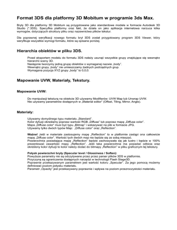 Format 3DS dla platformy 3D Mobitum w programie 3ds Max. Bryły 3D dla platformy 3D Mobitum są przygotowane jako standardowe modele w formacie Autodesk 3D Studio (*.3DS). Specyfika platformy oraz fakt, że działa on jako aplikacja internetowa narzuca kilka wymogów, dotyczących struktury pliku oraz nazewnictwa plików tekstur. Dla poprawnej weryfikacji nowego formatu brył 3DS został przygotowany program 3DS Viewer, który weryfikuje wszystkie wymogi formatu, które są opisane poniżej. Hierarchia obiektów w pliku 3DS. Przed eksportem modelu do formatu 3DS należy usunąć wszystkie grupy znajdujące się wewnątrz hierarchii sceny 3D. Następnie tworzymy jedną grupę obiektów o wymaganej nazwie „body”. Wewnątrz grupy „body” nie umieszczamy żadnych podrzędnych grup. Wymagana pozycja XYZ grupy „body” to 0,0,0. Mapowanie UVW, Materiały, Tekstury. Mapowanie UVW: Do manipulacji teksturą na obiekcie 3D używamy Modifierów: UVW Map lub Unwrap UVW. Nie używamy parametrów dostępnych w „Material editor” (Offset, Tiling, Mirror, Angle). Materiały: Używamy domyślnego typu materiału „Standard”. Kolor dyfuzji określamy poprzez wartość RGB „Diffuse” lub poprzez mapę „Diffuse color”. Mapa „Diffuse color” musi być typu „Bitmap” i wskazywać na plik w formacie JPG. Używamy tylko dwóch typów Map: „Diffuse color” oraz „Reflection”. Ważne! Jeśli w materiale zastosujemy mapę „Reflection” to w platformie zastąpi ona całkowicie mapę „Diffuse color”. Wartość tych dwóch map nie będzie się ze sobą mieszać. Powierzchnia posiadająca mapę „Reflection” będzie zachowywała się jak lustro i będzie w 100% prezentować zawartość mapy „Reflection”. Jeśli taka powierzchnia ma posiadać odbicia oraz określony kolor dyfuzji to kolor należy dodać do bitmapy „Reflection” w pliku graficznym tej tekstury. Połysk powierzchni bryły (Specular level / Glossiness / Soften): Powyższe parametry nie są odczytywane przez przez parser plików 3DS w platformie. Przyczyną są ograniczenia dostępnych narzędzi w technologii Flash Stage3D. Poprawnie przekazywanym parametrem jest wartość koloru „Specular”. Za jego pomocą możemy definiować poziom połysku materiału. Parametr „Opacity” jest przekazywany poprawnie i wpływa na poziom przezroczystości materiału. Aby uniknąć konieczności definiowania wartości Specular we wszystkich bryłach, w platformie został utworzony warunek, który w specjalny sposób traktuje domyślną wartość Specular z programu 3ds Max. Domyślna wartość koloru Specular w 3ds Max to RGB(230,230,230). Jeśli dokładnie taka wartość zostanie użyta w materiale to jego połysk zostanie ustalony na domyślnym, niskim poziomie (specularPower = 20%). Jeśli wartość będzie inna to zostanie ona uwzględniona jako właściwość materiału. Kolor czarny RGB(0,0,0) to domyślny minimalny połysk. Kolor biały RGB(255,255,255) to maksymalny połysk. Przeliczona zostanie tylko jasność użytego koloru. Należy używać kolorów w skali szarości. Inne kolory zostaną przeliczone na skalę szarości w Aplikacji. Tekstury: Nazwy plików: platforma 3D Mobitum działa jako program internetowy. Wszystkie pliki pobierane przez program muszą posiadać nazwy zgodne z internetowym standardem HTTP. Dodatkowym ograniczeniem jest format 3DS, który przenosi tylko pliki w formacie ASCII o długości nazw do ośmiu znaków. Te ograniczenia muszą być ściśle przestrzegane przy tworzeniu nazw plików tekstur. Pliki tekstur nie są osadzane bezpośrednio w modelu 3DS. Będą one pobierane z serwera na podstawie nazw użytych w modelu 3DS. Zasady tworzenia nazw są następujące: Pliki tekstur są plikami JPG. Długość nazwy nie przekracza ośmiu znaków + trzy znaki rozszerzenia: xxxxxxxx.xxx Nazwy składają się tylko z małych liter alfabetu angielskiego oraz cyfr. Dodatkowe, dopuszczalne znaki to „-” oraz „_” Nie używamy znaków diakrytycznych (ąść...), specjalnych (!@#$%...) oraz spacji Nie używamy dużych liter Przykładowe, poprawne nazwa plików: wenge.jpg wenge-li.jpg reflecti.jpg Przykładowe, niepoprawne nazwy plików: Wenge.jpg (duża litera w nazwie) wenge.JPG (duże litery w rozszerzeniu) wenge#3.jpg (znak specjalny) wenge-luizjana.jpg (zbyt długa nazwa) kokesh 2.jpg (spacja w nazwie) biały.jpg (znak diakrytyczny) Program 3DS Viewer weryfikuje niepoprawne nazwy i w przypadku ich wystąpienia wyświetli komunikat o błędzie. Wymiary tekstur: Technologia Flash Stage3D operuje tylko na bitmapach których wymiary są potęgą liczby 2. Dodatkowo, dla uzyskania maksymalnej kompatybilności z kartami graficznymi użytkowników platforma ogranicza dopuszczalną wielkość tekstur do wymiarów 1024x1024px. Szerokość i wysokość bitmap musi odpowiadać powyższym regułom. Dopuszczalne wymiary tekstur to: 2,4,8,16,32,64,128,256,512,1024px Szerokość i wysokość tekstury nie musi być proporcjonalna, ale wymiary muszą odpowiadać powyższej regule. Przykładowe, poprawne wymiary: 128px x 512px 512px x 512px 2px x 1024px 1024px x 1024px Przykładowe, niepoprawne wymiary: 500px x 256px (500px nie jest potęgą liczby 2) 1024 x 2048px (2048px jest potęgą liczby 2 ale przekracza maksymalną wartość 1024px) Kompresja tekstur: Dla potrzeb transferu danych poprzez internet ograniczamy do minimum ilość danych w plikach JPG. Usuwamy z nich wszystkie informacje typu MetaData (orientacja, profil kolorów, thumb, itp). Przy zapisie pliku tekstury z programu Adobe Photoshop używamy opcji „Save for Web & Devices”. Nie używamy opcji „Save As”. Maksymalny poziom kompresji (Quality) to 60. Nie używamy opcji „Progressive” i „Embed color profile”. Metadata ustawiamy na „None”. Struktura plików i folderów: Wszystkie pliki 3DS dla kolekcji muszą być umieszczone w jednym folderze, np. C:\3D\models\room\ Wszystkie pliki tekstur dla kolekcji muszą być umiesz