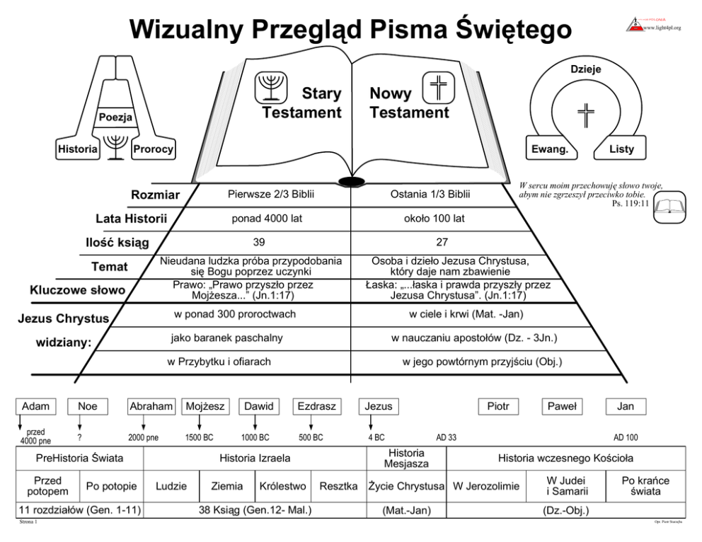 Wizualny Przegląd Pisma Świętego li g ht f or p o l oni a www.light4pl.org Dzieje Stary Testament Poezja Historia Nowy Testament Prorocy Ewang. Rozmiar Pierwsze 2/3 Biblii Lata Historii Ilość ksiąg około 100 lat 39 27 Nieudana ludzka próba przypodobania się Bogu poprzez uczynki Prawo: „Prawo przyszło przez Mojżesza...” (Jn.1:17) Temat Kluczowe słowo Osoba i dzieło Jezusa Chrystusa, który daje nam zbawienie Łaska: „...łaska i prawda przyszły przez Jezusa Chrystusa”. (Jn.1:17) w ponad 300 proroctwach Jezus Chrystus w ciele i krwi (Mat. -Jan) jako baranek paschalny widziany: w nauczaniu apostołów (Dz. - 3Jn.) w Przybytku i ofiarach Adam Noe Abraham Mojżesz przed 4000 pne ? 2000 pne 1500 BC PreHistoria Świata Przed potopem Po potopie 11 rozdziałów (Gen. 1-11) Strona 1 Dawid 1000 BC w jego powtórnym przyjściu (Obj.) Ezdrasz 500 BC Historia Izraela Ludzie Ziemia W sercu moim przechowuję słowo twoje, abym nie zgrzeszył przeciwko tobie. Ps. 119:11 Ostania 1/3 Biblii ponad 4000 lat Listy Królestwo 38 Ksiąg (Gen.12- Mal.) Jezus 4 BC Historia Mesjasza Piotr AD 33 Jan AD 100 Historia wczesnego Kościoła Resztka Życie Chrystusa W Jerozolimie (Mat.-Jan) Paweł W Judei i Samarii Po krańce świata (Dz.-Obj.) Opr. Piotr Starzęba li g ht f or p o l oni a www.light4pl.org Historia wczesnego Świata Poezja Historia przed 4000 BC 2000 BC Jezus Prorocy Adam Noe Abraham przed 4000 BC 2500 BC ? 2000 BC Przed potopem Po potopie Stworzenie Upadek Rozwój grzechu Potop Rozwój narodów Gen. 1-2 Gen. 3 Gen. 4-9 Gen. 6-9 Gen. 10-11 Sprawiedliwość jest twórcza a grzech niszczycielski. Rz.6:23 Twórcza praca Boga w: Genesis 2 Bóg Przymierza Jahwe Osobisty Bóg Stworzenie człowieka Uwieńczeniem małżeństwo Szósty dzień stworzenia 1000 Metuszelach 969 Noe 950 Adam 930 900 800 700 Sem 600 600 500 Potop Genesis 1 Bóg Stworzenia Elohim Wszechmocny Bóg Stworzenie wszechświata Uwieńczeniem człowiek Sześć dni stworzenia Henoch 385 400 300 Pokusa: pierwszy i ostatni Adam 1 Jn.2:16 Genesis 3:6 Genesis 2 „że drzewo to ma owoce „powiedz kamieniowi, dobre” aby się stał chlebem” „wszystkie królestwa „pożądliwość oczu” „że były miłe dla oczu” świata dam ci” „godne pożądania dla „rzuć się w dół; aniołom „pycha życia” zdobycia mądrości” będą cię strzegli” „pożądliwość ciała” Strona 2 Heber 464 Abraham 175 200 100 1 2 3 4 5 6 7 8 9 10 11 12 13 14 pokolenie Wiek ludzi przed i po potopie Opr. Piotr Starzęba li g ht f or p o l oni a www.light4pl.org Historia Izraela - Ludzie Poezja Historia 2000 1500 Ludzie 1000 Jezus 500 Ziemia Królestwo Resztka Prorocy Abraham Józef Mojżesz 2000 1914 1500 Ludzie Patriarchowie 2166 Narodziny Abrama Niewola w Egipcie 1991 1876 Egipt Początek Izrael wchodzi Środkowego do Egiptu Królestwa 1750 1760 Kodeks Hammurabiego Początek Hittytów Przymierze z Abrahamem Gen. 12:1-3 1550 Egipt Początek Nowego Królestwa Żyzny Półksiężyc Odnowienie przymierza i zmiana imienia oraz znak obrzezanie. Gen. 22:15-18 Fundament następnych przymierz Potwierdzenie przymierza z powodu posłuszeństwa. Niniwa Mezopotamia Mari Morze Śródziemne Damaszek Akad Ziemia: Palestyńskie przymierze: Deut. 30 Nasienie: Dawidowe przymierze 2Sm. 7 Błogosławieństwo: „stare” Ex.19 i „nowe” przymierze Jer.31. Jeruzalem 2 pokolenie 3 pokolenie 4 pokolenie Abraham Ismael i Izaak Ezaw i Jakub Józef i 12 braci Rodzina Abrahama wzrosła do 70 osób Józef: Boży człowiek, Ezaw: światowy człowiek, mała wiara ufający Bogu obietnicy Bracia: niemoralność, Izaak wołał do Boga i Jakub: pod koniec brak oddzielenia od uwierzył Bogu szukał Boga światowości Ismael nie był synem Zbudował ołtarz. Izaak zbudował ołtarz: Jakub zbudował ołtarz: Nikt nie wybudował Gen.12:7-8; 13:4; 22:9. Gen. 26:25. Gen.33:20; 35:1,3,7. ołtarza Powołanie Abrahama Egipt Synaj Józef sprzedany jako niewolnik do Egiptu. Nil głodu Izrael Podczas przeniósł się do Egiptu. Morze Czerwone Elam Babilon Jordan Uz 1 pokolenie ys Gen. 17:1-27 Urartu PaddanAram Cypr Wyjście gr Odnowienie przymierza poprzez ofiarę ze zwierząt. 1445 Ty Gen. 15:1-21 1525 Narodziny Mojżesz Śmierć Teraha t fra Eu Po odejściu Lota, Bóg znów obiecał mu: ziemię i potomków. Duchowy upadek Patriarchów Strona 3 Hara n W Ur, Bóg obiecał mu: ziemię, potomków i błogosławieństwo. Gen. 13:14-17 Abraham człowiek wiary, uwierzył Bogu 430 lat Ex.12:40; Gal.3:17 Pustynia Arabska Ur Sumer Zatoka Perska Zwycięstwem nad grzechem jest wiara, która bierze Boga za Słowo i jest niezależna od okoliczności. Hbr.11:8-22. 1Jn.5:4. Opr. Piotr Starzęba li g ht f or p o l oni a www.light4pl.org Historia Izraela - Ziemia Poezja Historia 2000 1500 Ludzie 1000 Jezus 500 Ziemia Królestwo Resztka Prorocy Mojżesz Samuel Dawid 1500 1105-1020 1000 Ziemia Wyjście 1405 7 lat podboju ziemi: 1. wejście klinem 2. południowy podbój 3. północny podbój 2 10 plag Kadesz Barnea 3 1 12 szpiegów Góra Nebo Śmierć Mojżesza 10 Przykazań - podsumowanie Prawa Moralnego 1-4 Obowiązki względem Boga Będziesz miłował Pana, Boga swego.. Mt.22:37. 5-10 Obowiązki względem człowieka Będziesz miłował bliźniego... Mt.22:39 Ponowne danie Prawa Edom Sędziowie: studium nieposłuszeństwa Każdy z 7 cyklów (Sędz.3:5-16:31) zawiera: bunt, odpłatę, skruchę, odnowienie i ciszę. Te cykle są jak spirala grzechu 2:19. Cykl Midian Prawo Boże rz Mo eC r ze Góra Synaj ne wo Strona 4 1043 Saul namaszczony na Króla PRAWO Przygotować nas na spotkanie z Chrystusem. (Gal.3:24). 38 lat wędrowania po pustyni Egipt 1191 Gedeon pokonał Midianitów Prawo było dane by ludzie nauczyli się chodzić ze świętym Bogiem. aan Morze Śródziemne Czas Sędziów 1398 Kan 1445 Podbój Objawienie wymaga posłuszeństwa, a posłuszeństwo przynosi błogosławieństwo Deut.6:1-15; Joz.1:8; Jn.15:12-17. Opresor Niewola Sędzia Lata Pokoju 1. (3:7-11) Mezopotamia 8 lat O