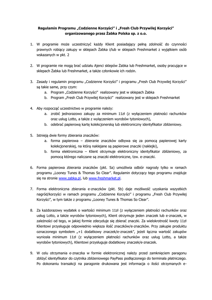 Regulamin Programu „Codzienne Korzyści” i „Fresh Club Przywilej Korzyści” organizowanego przez Żabka Polska sp. z o.o. 1. W programie może uczestniczyć każdy Klient posiadający pełną zdolność do czynności prawnych robiący zakupy w sklepach Żabka i/lub w sklepach Freshmarket z wyjątkiem osób wskazanych w pkt. 2 2. W programie nie mogą brać udziału Ajenci sklepów Żabka lub Freshmarket, osoby pracujące w sklepach Żabka lub Freshmarket, a także członkowie ich rodzin. 3. Zasady i regulamin programu „Codzienne Korzyści” i programu „Fresh Club Przywilej Korzyści” są takie same, przy czym: a. Program „Codzienne Korzyści” realizowany jest w sklepach Żabka b. Program „Fresh Club Przywilej Korzyści” realizowany jest w sklepach Freshmarket 4. Aby rozpocząć uczestnictwo w programie należy: a. zrobić jednorazowo zakupy za minimum 11zł (z wyłączeniem płatności rachunków oraz usług Lotto, a także z wyłączeniem wyrobów tytoniowych), b. odebrać papierową kartę kolekcjonerską lub elektroniczny identyfikator zbliżeniowy. 5. Istnieją dwie formy zbierania znaczków: a. forma papierowa – zbieranie znaczków odbywa się za pomocą papierowej karty kolekcjonerskiej, na którą naklejane są papierowe znaczki (naklejki), b. forma elektroniczna – Klient otrzymuje elektroniczny identyfikator zbliżeniowy, za pomocą którego naliczane są znaczki elektroniczne, tzw. e-znaczki. 6. Forma papierowa zbierania znaczków (pkt. 5a) umożliwia odbiór nagrody tylko w ramach programu „Looney Tunes & Thomas So Clear”. Regulamin dotyczący tego programu znajduje się na stronie www.zabka.pl, lub www.freshmarket.pl. 7. Forma elektroniczna zbierania e-znaczków (pkt. 5b) daje możliwość uzyskania wszystkich nagród/korzyści w ramach programu „Codzienne Korzyści” i programu „Fresh Club Przywilej Korzyści”, w tym także z programu „Looney Tunes & Thomas So Clear”. 8. Za każdorazowy wydatek o wartości minimum 11zł (z wyłączeniem płatności rachunków oraz usług Lotto, a także wyrobów tytoniowych), Klient otrzymuje jeden znaczek lub e-znaczek, w zależności od tego, w jakiej formie zdecyduje się zbierać znaczki. Za wielokrotność kwoty 11zł Klientowi przysługuje odpowiednio większa ilość znaczków/e-znaczków. Przy zakupie produktu oznaczonego symbolem „+1 dodatkowy znaczek/e-znaczek”, jeżeli łączna wartość zakupów wyniosła minimum 11zł (z wyłączeniem płatności rachunków oraz usług Lotto, a także wyrobów tytoniowych), Klientowi przysługuje dodatkowy znaczek/e-znaczek. 9. W celu otrzymania e-znaczka w formie elektronicznej należy przed zamknięciem paragonu zbliżyć identyfikator do czytnika zbliżeniowego PayPass podłączonego do terminala płatniczego. Po dokonaniu transakcji na paragonie drukowana jest informacja o ilości otrzymanych e- znaczków na podstawie dokonanej transakcji oraz o sumie uzbieranych e-znaczków znajdujących się na danym koncie. 10. Organizator zastrzega sobie możliwość przyznawania dodatkowych e-znaczków za inne czynności związane z programem wykonane przez Uczestnika. Lista czynności, za które są przyznawane dodatkowe e-znaczki jest dostępna na www.zabka.pl lub www.freshmarket.pl, a także w aplikacji mobilnej „Żabka Codzienne Korzyści” lub „Freshmarket”. 11. Klient, który w trakcie trwania programu zdecyduje się na przejście z papierowej formy zbierania znaczków na formę elektroniczną, ma możliwość jednorazowego przeniesienia znaczków z jednej karty kolekcjonerskiej na jeden identyfikator zbliżeniowy (tzw. zamiana znaczków papierowych na e-znaczki). Zamiana znaczków papierowych na e-znaczki zostaje potwierdzona podpisem Klienta na wydruku potwierdzenia zamiany formy znaczków. Karta kolekcjonerska, na podstawie której dokonano zamiany znaczków pozostaje w sklepie Żabka lub Freshmarket. Nie ma możliwości łącznego przenoszenia znaczków z kilku kart papierowych na jeden identyfikator zbliżeniowy. 12. Nie ma możliwości zamiany e-znaczków na znaczki papierowe. 13. Nie można dokonywać wymiany kart kolekcjonerskich na e-znaczki posługując się kartami kolekcjonerskimi, które zostały zmienione, przerobione, zamazane, skserowane. 14. Maksymalna liczba e-znaczków, która może być jednorazowo wymieniona na nagrody wynosi 150. 15. Znaczki/e-znaczki nie podlegają wymianie na gotówkę. Nadwyżka znaczków pozostała na karcie kolekcjonerskiej lub nadwyżka e-znaczków na identyfikatorze/koncie po wymianie na nagrody nie podlega zwrotowi ani rozliczeniu rzeczowemu lub pieniężnemu. 16. Do odebrania nagrody wymagana jest: a. karta kolekcjonerska w formie papierowej z wymaganą ilością znaczków (dotyczy tylko nagród z programu „Looney Tunes & Thomas So Clear”), lub b. w przypadku identyfikatora niezarejestrowanego: identyfikator zbliżeniowy z wymaganą ilością e-znaczków, lub c. w przypadku identyfikatora zarejestrowanego: identyfikator zbliżeniowy z wymaganą ilością e-znaczków oraz data urodzin podana w trakcie procesu rejestracji konta „Codzienne Korzyści” lub „Fresh Club Przywilej Korzyści” Klient zobowiązany jest do potwierdzenia odbioru nagrody poprzez złożenie podpisu na dokumencie potwierdzenia odbioru nagrody. W przypadku formy papierowej, karta kolekcjonerska zostanie zatrzymana przez Sprzedawcę przy kasie. W przypadku formy elektronicznej identyfikator zbliżeniowy pozostaje u Klienta i może służyć dalszemu zbieraniu eznaczków w okresie trwania Programu lub w czasie trwania kolejnych programów. 17. Nie można dokonywać odbioru nagród lub/albo zakupu po obniżonej cenie towarów posługując się kartami kolekcjonerskimi, które zostały zmienione, przerobione, zamazane, skserowane lub nie zawierają wystarczającej liczby znaczków. 18. Nie można dokonywać odbioru nagród lub zakupu po obniżonej cenie posługując się identyfikatorem, który został zmodyfikowany w obszar