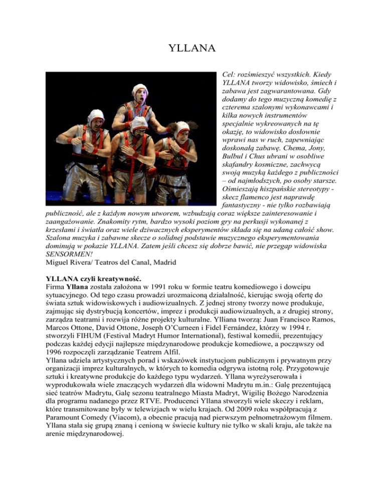 YLLANA Cel: rozśmieszyć wszystkich. Kiedy YLLANA tworzy widowisko, śmiech i zabawa jest zagwarantowana. Gdy dodamy do tego muzyczną komedię z czterema szalonymi wykonawcami i kilka nowych instrumentów specjalnie wykreowanych na tę okazję, to widowisko dosłownie wprawi nas w ruch, zapewniając doskonałą zabawę. Chema, Jony, Bulbul i Chus ubrani w osobliwe skafandry kosmiczne, zachwycą swoją muzyką każdego z publiczności – od najmłodszych, po osoby starsze. Ośmieszają hiszpańskie stereotypy skecz flamenco jest naprawdę fantastyczny - nie tylko rozbawiają publiczność, ale z każdym nowym utworem, wzbudzają coraz większe zainteresowanie i zaangażowanie. Znakomity rytm, bardzo wysoki poziom gry na perkusji wykonanej z krzesłami i światła oraz wiele dziwacznych eksperymentów składa się na udaną całość show. Szalona muzyka i zabawne skecze o solidnej podstawie muzycznego eksperymentowania dominują w pokazie YLLANA. Zatem jeśli chcesz się dobrze bawić, nie przegap widowiska SENSORMEN! Miguel Rivera/ Teatros del Canal, Madrid YLLANA czyli kreatywność. Firma Yllana została założona w 1991 roku w formie teatru komediowego i dowcipu sytuacyjnego. Od tego czasu prowadzi urozmaiconą działalność, kierując swoją ofertę do świata sztuk widowiskowych i audiowizualnych. Z jednej strony tworzy nowe produkuje, zajmując się dystrybucją koncertów, imprez i produkcji audiowizualnych, a z drugiej strony, zarządza teatrami i rozwija różne projekty kulturalne. Ylliana tworzą: Juan Francisco Ramos, Marcos Ottone, David Ottone, Joseph O’Curneen i Fidel Fernández, którzy w 1994 r. stworzyli FIHUM (Festival Madryt Humor International), festiwal komedii, prezentujący podczas każdej edycji najlepsze międzynarodowe produkcje komediowe, a począwszy od 1996 rozpoczęli zarządzanie Teatrem Alfil. Yllana udziela artystycznych porad i wskazówek instytucjom publicznym i prywatnym przy organizacji imprez kulturalnych, w których to komedia odgrywa istotną rolę. Przygotowuje sztuki i kreatywne produkcje do każdego typu wydarzeń. Yllana wyreżyserowała i wyprodukowała wiele znaczących wydarzeń dla widowni Madrytu m.in.: Galę prezentującą sieć teatrów Madrytu, Galę sezonu teatralnego Miasta Madryt, Wigilię Bożego Narodzenia dla programu nadanego przez RTVE. Producenci Yllana stworzyli wiele skeczy i reklam, które transmitowane były w telewizjach w wielu krajach. Od 2009 roku współpracują z Paramount Comedy (Viacom), a obecnie pracują nad pierwszym pełnometrażowym filmem. Yllana stała się grupą znaną i cenioną w świecie kultury nie tylko w skali kraju, ale także na arenie międzynarodowej.