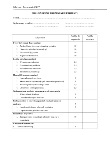 Odkrywcy Przeszłości- ZSiPP ARKUSZ OCENY PREZENTACJI