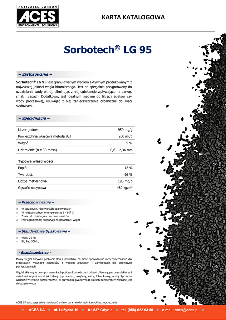 KARTA KATALOGOWA Sorbotech® LG 95 – Zastosowanie – Sorbotech® LG 95 jest granulowanym węglem aktywnym produkowanym z najwyższej jakości węgla bitumicznego. Jest on specjalnie przygotowany do uzdatniania wody pitnej, eliminując z niej substancje wpływające na barwę, smak i zapach. Dodatkowo, jest idealnym medium do filtracji ścieków czy wody procesowej, usuwając z niej zanieczyszczenia organiczne do ilości śladowych. – Specyfikacja – Liczba jodowa 950 mg/g Powierzchnia właściwa metodą BET 950 m2/g Wilgoć 5% Uziarnienie (8 x 30 mesh) 0,6 – 2,36 mm Typowe właściwości Popiół 12 % Twardość 96 % Liczba metylenowa 195 mg/g Gęstość nasypowa 480 kg/m3 – Przechowywanie – • • • • W szczelnych, nieotwartych opakowaniach W miejscu suchym o temperaturze 5 - 80O C Zdala od źródeł ognia i rozpuszczalników Przy ograniczonej ekspozycji na powietrze i wilgoć – Standardowe Opakowanie – • • Worki 20 kg Big Bag 500 kg - Bezpieczeństwo Mokry węgiel aktywny pochłania tlen z powietrza, co może spowodować niebezpieczeństwo dla pracujących wewnątrz zbiorników z węglem aktywnym i zamkniętych lub osłoniętych pomieszczeniach. Węgiel aktywny w pewnych warunkach podczas kontaktu ze środkami utleniającymi oraz niektórymi związkami organicznymi jak ketony (np. aceton), akrylany, estry, lotne kwasy, aminy itp. może wchodzić w reakcje egzotermiczne. W przypadku gwałtownego wzrostu temperatury zalecane jest chłodzenie wodą. ACES SA zastrzega sobie możliwość zmiany parametrów technicznych bez uprzedzenia ● ACES SA ● ul. Łużycka 10 ● 81-537 Gdynia ● tel. (058) 622 63 50 ● e-mail: [email protected] ●