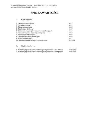 PRZEDSZKOLE PUBLICZNE NR 3 W BRZEGU PRZY UL. ZIELONEJ 23 WENTYLACJA POMIESZCZEŃ KUCHNI 1 1. Podstawa opracowania 2. Cel opracowania 3. Zakres opracowania 4. Założenia wyjściowe 5. Obliczenia przekrojów kanałów wentylacyjnych 6. Opis rozwiązania instalacji wentylacji 7. Przewody wentylacyjne 8. Zabezpieczenia antykorozyjne 9. Wytyczne branżowe 10. Spis elementów instalacji wentylacyjnej str. 2 str. 2 str. 2 str. 3 str. 3 str. 3 str. 6 str. 6 str. 7 str. 8-10 1. Wentylacja pomieszczeń technologicznych kuchni-rzut piwnic 2. Wentylacja pomieszczeń technologicznych kuchni -rzut parteru skala 1:50 skala 1:50 PRZEDSZKOLE PUBLICZNE NR 3 W BRZEGU PRZY UL. ZIELONEJ 23 WENTYLACJA POMIESZCZEŃ KUCHNI 2 1. Zlecenie inwestora na wykonanie projektu adaptacji kuchni 2. Wymogi higieniczno-sanitarne i BHP 3. Normy i wytyczne projektowania instalacji wentylacyjnych 4. Katalogi armatury, przewodów i wyposażenia wentylacji 5. Inwentaryzacja budowlana dostarczona przez inwestora Celem opracowania jest dostosowanie do obowiązujących przepisów pomieszczeń kuchni wraz z zapleczem znajdującej się w Przedszkolu Publicznym nr 3 w Brzegu przy ul. Zielonej w zakresie obejmującym wentylację tych pomieszczeń. Na dzień dzisiejszy kuchnia znajduje się w pomieszczeniach piwnicznych przedszkola i nie spełnia wielu wymogów sanitarnych i BHP. W celu spełnienia przepisów sanitarnych i BHP zaprojektowano układ pomieszczeń kuchni na parterze przedszkola, wykorzystując pomieszczenia po byłym gabinecie lekarskim, pomieszczenia magazynowe, część komunikacyjną oraz sanitariaty. Zakres opracowania obejmuje projekt wykonawczy wentylacji mechanicznej pomieszczeń kuchni wraz z pomieszczeniami towarzyszącymi. Niniejsze opracowanie obejmuje: -obliczenia ilości powietrza wentylacyjnego zgodnie z wymogami -dobór urządzeń wentylacyjnych nawiewno-wywiewnych -usytuowanie urządzeń, przewodów i kratek wentylacyjnych. PRZEDSZKOLE PUBLICZNE NR 3 W BRZEGU PRZY UL. ZIELONEJ 23 WENTYLACJA POMIESZCZEŃ KUCHNI 3 Na podstawie obowiązujących przepisów i wytycznych przyjęto następujące wyjściowe założenia projektowe dotyczące układów wentylacyjnych dla rozpatrywanego obiektu: ! " # $ % & Kuchnia 72,80 15 1092 2. Przygotowalnia 21,20 8 170 3. Zmywalnia 9,00 15 135 4. Jadalnia 103,33 5 517 5. Magazyn 17,83 8 143 6. Szatnia odzieży własnej 7,62 4 31 7. Szatnia odzieży roboczej 17,57 4 70 8. Natrysk 4,23 5 21 9. WC 5,70 - 50 10. Pom. dezynfekcji jaj 36,28 8 290 11. Pom. porządkowe 8,16 8 65 ) * + + , ' 1. ( Przekroje kanałów wentylacyjnych zostały określone w oparciu o zachowanie niskiej prędkości przepływu: -prędkość przepływu między elementami tłumika hałasu – maksymalnie 5 m/s -prędkość przepływu na czerpni powietrza – maksymalnie 3 m/s -prędkość przepływu przez nagrzewnicę – maksymalnie 3 m/s -przewód główny – maksymalnie 3-4 m/s -prędkość na kratce nawiewnej – maksymalnie 0,3 m/s ) . We wszystkich rozpatrywanych pomieszczeniach zastosowano wentylację mechaniczną z nawiewem powietrza z centrali wentylacyjnej i wywiewem indywidualnymi wentylatorami kanałowymi. Zastosowano centralę nawiewną firmy VBW Engineering typu SKN-3-1800, wyposażona w: PRZEDSZKOLE PUBLICZNE NR 3 W BRZEGU PRZY UL. ZIELONEJ 23 WENTYLACJA POMIESZCZEŃ KUCHNI 4 -przepustnicę powietrza -filtr kasetowy G4 -nagrzewnicę wodną o parametrach 80/60ºC mocy 18 kW -wentylator o wydatku 1800 m3/h i sprężu 200 Pa -automatykę sterująco-zabezpieczającą z falownikiem Do wywiewu zastosowano wentylatory kanałowe firmy Danfoss i wentylator dachowy firmy Uniwersal. 6.1 Kuchnia: W pomieszczeniu kuchni zastosowano układ wentylacji z podciśnieniem w granicach 10-15% w stosunku do pozostałych pomieszczeń. Nawiew zrealizowano z centrali nawiewnej, sześcioma kratkami nawiewnymi. Wywiew poprzez okap centralny o wymiarach 1600x2000 mm do istniejących kanałów murowanych za pomocą wentylatora dachowego typu Das-200 z tłumikiem TLO-200 firmy Uniwersal. Dodatkowy wywiew grawitacyjny – murowanym przewodem wentylacyjnym z kratką wywiewną. Ilość powietrza nawiewanego: 900 m3/h Ilość powietrza wywiewanego: 1100 m3/h 6.2 Przygotowalnia: Zastosowano układ wentylacji z podciśnieniem około 15% w stosunku do pozostałych pomieszczeń. Nawiew zrealizowano z centrali nawiewnej, jedną kratką nawiewną. Wywiew wentylatorem kanałowym, umieszczonym w ścianie zewnętrznej pomieszczenia na wysokości 150 mm pod stropem. Ilość powietrza nawiewanego: 150 m3/h Ilość powietrza wywiewanego: 180 m3/h 6.3 Zmywalnia: Zastosowano układ wentylacji z podciśnieniem około 15% w stosunku do pozostałych pomieszczeń. PRZEDSZKOLE PUBLICZNE NR 3 W BRZEGU PRZY UL. ZIELONEJ 23 WENTYLACJA POMIESZCZEŃ KUCHNI 5 Nawiew zrealizowano z centrali nawiewnej, jedną kratka nawiewną. Wywiew wentylatorem kanałowym, umieszczonym w ścianie zewnętrznej pomieszczenia na wysokości 150 mm pod obudową kanału nawiewnego. Ilość powietrza nawiewanego: 150 m3/h Ilość powietrza wywiewanego: 180 m3/h 6.4 Jadalnia: Zastosowano układ wentylacji z nadciśnieniem w stosunku do pozostałych pomieszczeń. Nawiew zrealizowano z centrali nawiewnej, czterema kratkami nawiewnymi. Wywiew wentylatorem kanałowym, umieszczonym w ścianie zewnętrznej pomieszczenia na wysokości 150 mm pod stropem. Ilość powietrza nawiewanego: 600 m3/h Ilość powietrza wywiewanego: 320 m3/h 6.5 Magazyn: Wywiew wentylatorem kanałowym, umieszczonym w ścianie zewnętrznej pomieszczenia na wysokości 150 mm pod stropem. Nawiew nawiewnikami okiennymi i przez nieszczelności. Ilość powietrza wywiewanego: 180 m3/h 6.6 Szatnie i natrysk: Wywiew wentylatorem kanałowym do istniejącego przewodu murowanego. Kanał wywiewny prowadzony pod stropem pomieszczeń. Nawiew nawiewnikami okiennymi i przez nieszczelności. Ilość powietrza wywiewanego: 180 m3/h 6.7 WC: Wywiew wentylatorem kanałowym do istniejącego przewodu murowanego. Kanał wywiewny prowa