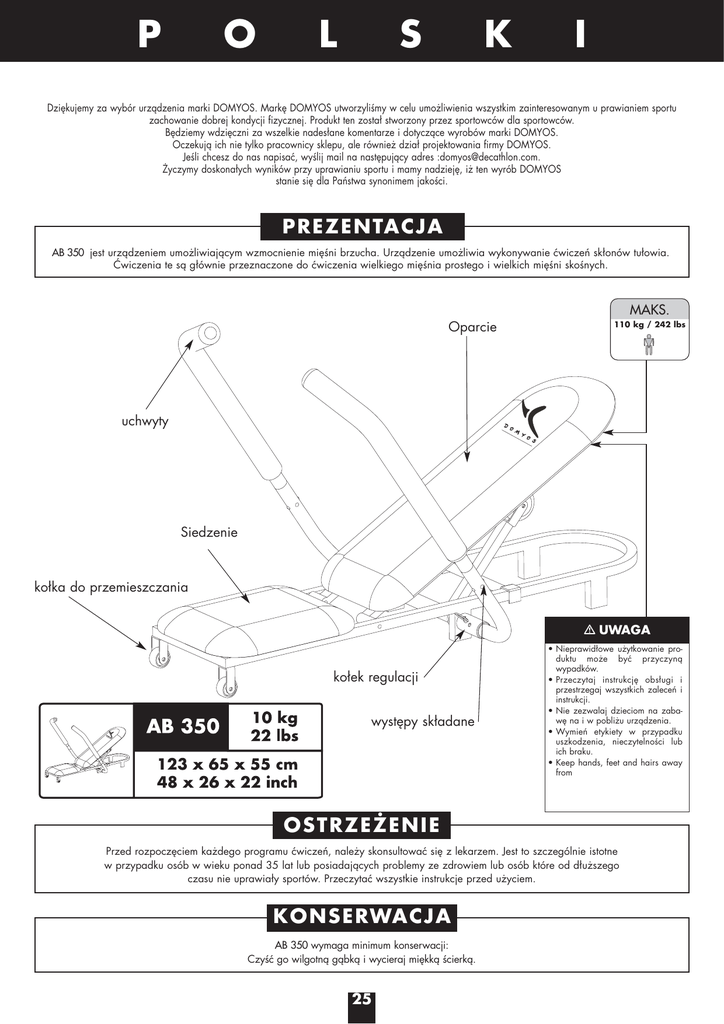P O L S K I Dziękujemy za wybór urządzenia marki DOMYOS. Markę DOMYOS utworzyliśmy w celu umożliwienia wszystkim zainteresowanym u prawianiem sportu zachowanie dobrej kondycji fizycznej. Produkt ten został stworzony przez sportowców dla sportowców. Będziemy wdzięczni za wszelkie nadesłane komentarze i dotyczące wyrobów marki DOMYOS. Oczekują ich nie tylko pracownicy sklepu, ale również dział projektowania firmy DOMYOS. Jeśli chcesz do nas napisać, wyślij mail na następujący adres :[email protected]. Życzymy doskonałych wyników przy uprawianiu sportu i mamy nadzieję, iż ten wyrób DOMYOS stanie się dla Państwa synonimem jakości. P R E Z E N TA C J A AB 350 jest urządzeniem umożliwiającym wzmocnienie mięśni brzucha. Urządzenie umożliwia wykonywanie ćwiczeń skłonów tułowia. Ćwiczenia te są głównie przeznaczone do ćwiczenia wielkiego mięśnia prostego i wielkich mięśni skośnych. MAKS. Oparcie 110 kg / 242 lbs uchwyty Siedzenie kołka do przemieszczania UWAGA kołek regulacji występy składane • Nieprawidłowe użytkowanie produktu może być przyczyną wypadków. • Przeczytaj instrukcję obsługi i przestrzegaj wszystkich zaleceń i instrukcji. • Nie zezwalaj dzieciom na zabawę na i w pobliżu urządzenia. • Wymień etykiety w przypadku uszkodzenia, nieczytelności lub ich braku. • Keep hands, feet and hairs away from OSTRZEŻENIE Przed rozpoczęciem każdego programu ćwiczeń, należy skonsultować się z lekarzem. Jest to szczególnie istotne w przypadku osób w wieku ponad 35 lat lub posiadających problemy ze zdrowiem lub osób które od dłuższego czasu nie uprawiały sportów. Przeczytać wszystkie instrukcje przed użyciem. K O N S E RWA C J A AB 350 wymaga minimum konserwacji: Czyść go wilgotną gąbką i wycieraj miękką ścierką. 25 P O L S K I BEZPIECZEŃSTWO Ostrzeżenie: aby zmniejszyć ryzyko poważnych obrażeń, należy przeczytać zalecenia obsługi zamieszczone w dalszej części przed użyciem produktu. 1. Należy przeczytać wszystkie instrukcje w podręczniku przed użyciem produktu. Używać produkt tylko zgodnie z przeznaczeniem opisanym w niniejszej instrukcji. Zachować instrukcję przez cały okres użytkowania produktu. 9. Zakładać zawsze obuwie sportowe dla zabezpieczenia nóg w czasie wykonywania ćwiczenia. Zakładaj właściwe ubranie. NIE ZAKŁADAĆ obszernych lub zwisających ubrań, które mogą zaczepić się o elementy urządzenia. Zdjąć całą biżuterię. 2. Montaż urządzenia musi wykonać osoba dorosła. 10. Spiąć włosy, tak, aby nie przeszkadzały w czasie ćwiczenia. 3. Właściciel urządzenia powinien poinformować wszystkich użytkowników produktu o zaleceniach obsługi produktu. 11. Jeżeli w czasie ćwiczenia odczuwają Państwo ból lub zawroty głowy, należy natychmiast przerwać ćwiczenie i skonsultować się z lekarzem. 4. Domyos nie ponosi żadnej odpowiedzialności za uszkodzenia ciała lub szkody dla osób trzecich lub szkody materialne spowodowane przez użytkowaniem lub nieprawidłowym użytkowaniem produktu przez nabywcę lub inne osoby (dotyczy tylko terytorium USA). 12. Jeżeli zaczynasz odczuwać zmęczenie mięśni, odpocznij przez chwilę zanim zaczniesz kontynuować. Nie doprowadzaj do przemęczenia mięśni! Może to spowodować uszkodzenie lub ewentualne kontuzje. 5. Produkt jest przeznaczony wyłącznie do użytkowania w gospodarstwie domowym. Nie używać produktu do celów komercyjnych, usługowych i innych. 13. Przez cały czas, dzieci i zwierzęta domowe muszą przebywać z dala od produktu. 14. Nie zbliżać rąk i nóg do elementów w ruchu. 6. Używać produkt w pomieszczeniach, z dala od wilgoci i pyłów, na płaskiej, stabilnej powierzchni zapewniającej wystarczającą ilość wolnego miejsca. Upewnij się, że dookoła produktu znajduje się wystarczająca ilość miejsca, aby umożliwić swobodne poruszanie się dookoła. Zabezpieczyć podłogę, przykryć ją wykładziną w miejscu ustawienia produktu. 15. Nie majsterkować przy produkcie. 16. W razie uszkodzenia AB 350, należy oddać produkt do sklepu Décathlon i nie używać AB 350 do pełnej naprawy. Używać wyłącznie części zamiennych Décathlon. 7. Nie przechowywać produktu w miejscu wilgotnym (brzeg basenu, łazienka…). 17. Wykonaj rozgrzewkę przed ćwiczeniem. Rozpocznij ćwiczenie łagodnie i ustal sobie realne założenia. 8. Użytkownik ponosi odpowiedzialność za kontrolowanie i dokręcanie wszystkich elementów po montażu i przed każdym użyciem produktu. Zapobiegać wystawaniu elementów regulacyjnych. Wymieniać natychmiast wszystkie zużyte lub uszkodzone części. 18. Wykonuj ciągły i regularny ruch w czasie ćwiczenia. 19. Zachować ostrożność w czasie montażu/demontażu produktu. U S TAW I E N I A Istnieją 3 rodzaje ustawień AB 350. REGULACJA OPARCIA: (rys. A) Istnieją dwa poziomy nachylenia oparcia. Ogranicznik metalowy pod siedzeniem umożliwia podnoszenie siedzenia. W najwyższej pozycji ruch jest najłatwiejszy. USTAWIENIE UCHWYTÓW: (rys. B) Istnieją dwa ustawienia uchwytów. Aby wyregulować pozycje uchwytów wystarczy nacisnąć występy, następnie ustawić uchwyty w wybranej pozycji i umożliwić powrót występów na miejsce. Pozycja klasyczna: nacisk ramion ułatwia ćwiczenie i zapewnia prace mięśni skośnych. Pozycja - młot: Zwiększa trudność ruchu. REGULACJA NACHYLENIA RAMION: (rys. C) Do regulacji nachylenia ramion należy użyć kołków przewidzianych do tego celu. Wyjąć kołek, wyregulować ustawienie na ramieniu i podstawie. Po wyrównaniu, założyć kołek. Istnieją trzy poziomy nachylenia, które wpływają na trudność wykonywania ćwiczenia. Im bardziej ramiona są ustawione w poziomie tym trudniejsze jest ćwiczenie. Odwrotnie, ćwiczenia są ułatwione kiedy ramiona są ustawione poziomo. UWAGA: zawsze ustawiać ramiona z tym samym nachyleniem. 26 P O L S K I OBSŁUGA Usiąść na siedzeniu AB 350, placy op