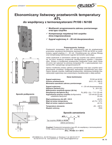 2016/2017 Ekonomiczny listwowy przetwornik temperatury ATL do wspó³pracy z termorezystorami Pt100 i Ni100 ü Mo¿liwoœæ programowania zakresu pomiarowego oraz typu czujnika ü Kompensacja rezystancji linii czujnika (linia trójprzewodowa) ü Sygna³ wyjœciowy 4 ¸ 20 mA dwuprzewodowo Przeznaczenie, funkcja Przetwornik temperatury typu ATL przeznaczony jest do przetwarzania przyrostów rezystancji termometrów oporowych Pt100 lub Ni100 na zunifikowany sygna³ pr¹dowy 4 ¸ 20 mA. Charakteryzuje siê cyfrow¹ filtracj¹ oraz kompensacj¹ nieliniowoœci sygna³u termometru oporowego. 8 Je¿eli u¿ytkownik w zamówieniu okreœli typ czujnika oraz zakres pomiarowy, APLISENS dostarczy przetwornik skonfigurowany zgodnie z zamówieniem. Zmiany w konfiguracji przetwornika u¿ytkownik mo¿e zleciæ firmie APLISENS lub wykonaæ za pomoc¹ komputera PC z wykorzystaniem konwertera RS i specjalnego oprogramowania AT. 62 91 Oprócz mo¿liwoœci zmiany zakresu pomiarowego oraz typu czujnika oprogramowanie umo¿liwia: konfiguracjê zachowania przetwornika przy przerwaniu obwodu czujnika, kalibracjê przetwornika, odcinkow¹ korekcjê charakterystyki wyjœciowej oraz przesuniêcie charakterystyki o sta³¹ wartoœæ. Dane techniczne Sygna³ wejœciowy Granice przetwarzania Minimalna szerokoœæ zakresu pomiarowego Pt100 lub Ni100 20 Ù L RL 380 Ù 10 Ù Sygna³ wyjœciowy 4¸ 20 mA dwuprzewodowo Napiêcie zasilania (UZ) 6…29 V DC Maksymalna amplituda têtnieñ (50 Hz) 1V Rezystancja obci¹¿enia (RO) RO [kÙ] L (UZ - 7 V) / 25 mA Sygnalizacja przerwy czujnika (konfigurowalna) 3,8 mA lub 23 mA ustawienie fabryczne 23 mA Sposób pod³¹czenia B³¹d podstawowy dla ÄR > 20 Ù B³¹d od zmian temperatury B³¹d od zmian napiêcia zasilania RS232 ±0,2% ±0,1% / 10°C ±0,1% Konwerter GND Rx Temperatura otoczenia Stopieñ ochrony Tx -25…+80°C IP20 Sposób zamawiania I + 3 2 _ Ucc + WY _ 7 8 ATL /___/__÷__°C Rt WE 1 Typ czujnika: Pt100 lub Ni100 Zakres pomiarowy Ro Przyk³ad: Przetwornik temperatury typu ATL do wspó³pracy z termorezystorem Pt100, zakres pomiarowy od 0 do 50°C ATL / Pt100 / 0 ÷ 50°C APLISENS S.A., 03-192 Warszawa, ul. Morelowa 7, tel. 022 814-07-77 fax 022 814-07-78, www.aplisens.pl, e-mail: [email protected] IX. 13