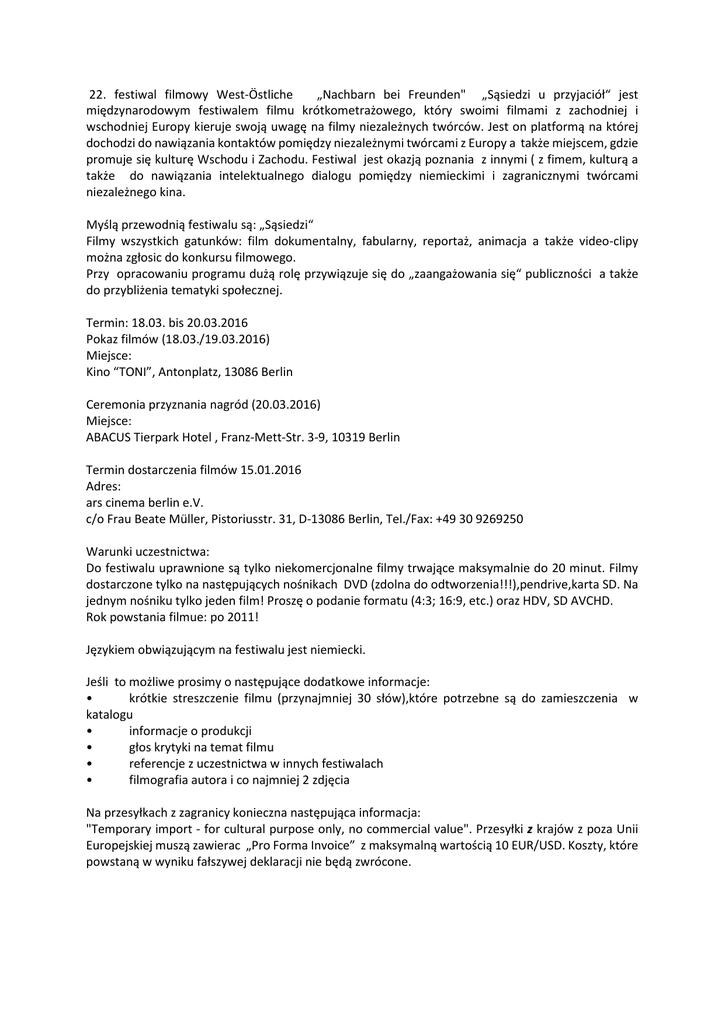 22. festiwal filmowy West-Östliche „Nachbarn bei Freunden" „Sąsiedzi u przyjaciół“ jest międzynarodowym festiwalem filmu krótkometrażowego, który swoimi filmami z zachodniej i wschodniej Europy kieruje swoją uwagę na filmy niezależnych twórców. Jest on platformą na której dochodzi do nawiązania kontaktów pomiędzy niezależnymi twórcami z Europy a także miejscem, gdzie promuje się kulturę Wschodu i Zachodu. Festiwal jest okazją poznania z innymi ( z fimem, kulturą a także do nawiązania intelektualnego dialogu pomiędzy niemieckimi i zagranicznymi twórcami niezależnego kina. Myślą przewodnią festiwalu są: „Sąsiedzi“ Filmy wszystkich gatunków: film dokumentalny, fabularny, reportaż, animacja a także video-clipy można zgłosic do konkursu filmowego. Przy opracowaniu programu dużą rolę przywiązuje się do „zaangażowania się“ publiczności a także do przybliżenia tematyki społecznej. Termin: 18.03. bis 20.03.2016 Pokaz filmów (18.03./19.03.2016) Miejsce: Kino “TONI”, Antonplatz, 13086 Berlin Ceremonia przyznania nagród (20.03.2016) Miejsce: ABACUS Tierpark Hotel , Franz-Mett-Str. 3-9, 10319 Berlin Termin dostarczenia filmów 15.01.2016 Adres: ars cinema berlin e.V. c/o Frau Beate Müller, Pistoriusstr. 31, D-13086 Berlin, Tel./Fax: +49 30 9269250 Warunki uczestnictwa: Do festiwalu uprawnione są tylko niekomercjonalne filmy trwające maksymalnie do 20 minut. Filmy dostarczone tylko na następujących nośnikach DVD (zdolna do odtworzenia!!!),pendrive,karta SD. Na jednym nośniku tylko jeden film! Proszę o podanie formatu (4:3; 16:9, etc.) oraz HDV, SD AVCHD. Rok powstania filmue: po 2011! Językiem obwiązującym na festiwalu jest niemiecki. Jeśli to możliwe prosimy o następujące dodatkowe informacje: • krótkie streszczenie filmu (przynajmniej 30 słów),które potrzebne są do zamieszczenia w katalogu • informacje o produkcji • głos krytyki na temat filmu • referencje z uczestnictwa w innych festiwalach • filmografia autora i co najmniej 2 zdjęcia Na przesyłkach z zagranicy konieczna następująca informacja: "Temporary import - for cultural purpose only, no commercial value". Przesyłki z krajów z poza Unii Europejskiej muszą zawierac „Pro Forma Invoice” z maksymalną wartością 10 EUR/USD. Koszty, które powstaną w wyniku fałszywej deklaracji nie będą zwrócone. O dopuszczeniu filmu decyduje komisja kwalifikacyjna. Renomowane Jury podejmuje się oceny filmów. Ocena Jury jest nie podważalna.. Dostarcznoe filmy objęte będą najwyższą troską.. Nie ponosi się odpowiedzialności za stratę lub uszkodzenie filmu. Filmy festiwalowe będą udostępnione od 15.02.2016 na stronie internetowej ars cinema berlin e.V. W przypadku odesłania filmu pamiętajmy koniecznie o dostarczeniu Porto w wysokości 5,00 € W innym przypadku filmy zostaną przekazane do archiwums ars cinema berlin e.V. Aktualne informacje znajdują się na stronie internetowej: www.ars-cinema.de