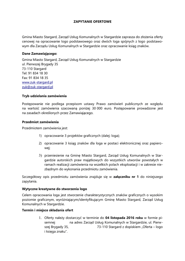 ZAPYTANIE OFERTOWE Gmina Miasto Stargard, Zarząd Usług Komunalnych w Stargardzie zaprasza do złożenia oferty cenowej na opracowanie logo podstawowego oraz dwóch loga spójnych z logo podstawowym dla Zarządu Usług Komunalnych w Stargardzie oraz opracowanie ksiąg znaków. Dane Zamawiającego: Gmina Miasto Stargard, Zarząd Usług Komunalnych w Stargardzie ul. Pierwszej Brygady 35 73-110 Stargard Tel: 91 834 18 30 Fax: 91 834 18 35 www.zuk-stargard.pl [email protected] Tryb udzielania zamówienia Postępowanie nie podlega przepisom ustawy Prawo zamówień publicznych ze względu na wartość zamówienia szacowaną poniżej 30 000 euro. Postępowanie prowadzone jest na zasadach określonych przez Zamawiającego. Przedmiot zamówienia Przedmiotem zamówienia jest: 1) opracowanie 3 projektów graficznych (dalej: loga); 2) opracowanie 3 ksiąg znaków dla loga w postaci elektronicznej oraz papierowej; 3) przeniesienie na Gminę Miasto Stargard, Zarząd Usług Komunalnych w Stargardzie autorskich praw majątkowych do wszystkich utworów powstałych w ramach realizacji zamówienia na wszelkich polach eksploatacji i w zakresie niezbędnym do wykonania przedmiotu zamówienia. Szczegółowy opis przedmiotu zamówienia znajduje się w załączniku nr 1 do niniejszego zapytania. Wytyczne kreatywne do stworzenia logo Celem opracowania loga jest stworzenie charakterystycznych znaków graficznych o wysokim poziomie graficznym, wyróżniającym/identyfikującym Gminę Miasto Stargard, Zarząd Usług Komunalnych w Stargardzie. Termin i miejsce składania ofert 1. Oferty należy dostarczyć w terminie do 04 listopada 2016 roku w formie pisemnej na adres Zarząd Usług Komunalnych w Stargardzie, ul. Pierwszej Brygady 35, 73-110 Stargard z dopiskiem „Oferta – logo i księga znaku”. 2. Wykonawca ma prawo złożyć ofertę z dowolną liczbą projektów graficznych logo. Złożenie przez Wykonawcę oferty, w formie innej niż określona powyżej lub po terminie (liczy się data doręczenia oferty do siedziby Zamawiającego) spowoduje jej odrzucenie. Opis zawartości oferty Oferta powinna zawierać wypełniony i podpisany przez osoby upoważnione do reprezentowania Wykonawcy, Formularz ofertowy (załącznik nr 2 do niniejszego zapytania) wraz z załączonymi projektami graficznymi loga, spełniającymi następujące warunki: 1) Projekty loga należy sporządzić techniką komputerową i powinny zawierać pliki graficzne w formacie jpg, cdr, tiff, png w wersji ko lorowej oraz czarno-białej, 2) Każdy projekt należy załączyć do oferty na oddzielnej płycie cd lub dvd albo na nośniku pamięci zewnętrznej. Kryteria oceny 1. Zamawiający dokona oceny każdego logo oddzielnie z ważnych ofert na podstawie następujących kryteriów: 1) Odzwierciedlenie profilu działania Zarządu Usług Komunalnych w Stargardzie w projekcie: logo: 50% (wartość wyrażona w procentach będzie oceniana w punktach: 1% = 1 pkt), 2) Wartość artystyczna projektu logo: 30% (wartość wyrażona w procentach będzie oceniana w punktach: 1% = 1 pkt). Wartość artystyczna projektu logo zostanie oceniona za: - Estetykę – 5 pkt - Innowacyjność – 10 pkt - Spójność logo z marką Miasta Stargard oraz logo spółek miejskich Gminy Miasto Stargard – 15 pkt 3) Cena oferty brutto, rozumiana jako koszt wykonania przedmiotu zamówienia (w tym, podatki i opłaty): 20 % W kryterium „cena” zostanie zastosowany wzór: Najniższa cena z rozpatrywanych ofert Ocena punktowa = ………………………………………………………………. * 100 punktów * 20% Cena badanej oferty 2. Ocenie podlegać będzie każdy projekt oddzielnie. 3. Za najkorzystniejszą zostanie uznana oferta, której projekt logo otrzyma najwyższą liczbę punktów, obliczonych jako suma punktów za kryteria: „odzwierciedlenie profilu działania Zarządu Usług Komunalnych”, „wartość artystyczna projektu logo” i „cena”. Termin realizacji przedmiotu zamówienia Postępowanie ofertowe zostanie rozstrzygnięte w dniu 07 listopada 2016 r. O wynikach postępowania jego uczestnicy zostaną poinformowani w formie emaila najpóźniej w dniu 08 listopada 2016 r. na adres mailowy podany w ofercie cenowej. W terminie 5 dni od daty rozstrzygnięcia postępowania zostanie podpisana umowa z wyłonionym w wyniku postępowania wykonawcą zamówienia. Informacje dodatkowe 1. Zamawiający w żadnym wypadku nie odpowiada za koszty poniesione przez Wykonawców w związku z przygotowaniem i złożeniem oferty. Wykonawcy zobowiązują się nie podnosić jakichkolwiek roszczeń z tego tytułu względem Zamawiającego. 2. Zamawiający prześle Wykonawcy informację o wyborze oferty, ze wskazaniem wybranego projektu logo do realizacji. 3. Zamawiający zapewnia, że przesłane przez Wykonawców, a nie wybrane w tym postępowaniu projekty nie będą wykorzystywane do innych celów. 4. Zamawiający zastrzega sobie prawo unieważnienia przedmiotowego zapytania ofertowego na każdym jego etapie, bez podania przyczyny. Załącznik nr 1 do zapytania ofertowego za opracowanie loga Zarządu Usług Komunalnych w Stargardzie Przedmiotem zamówienia jest: 1. Opracowanie 3 loga, których zadaniem jest odzwierciedlenie głównego profilu działalności Zarząd Usług Komunalnych w Stargardzie, a w szczególności do odbioru i zagospodarowania odpadów oraz utrzymania zieleni. 2. Logo podstawowe musi składać się z sygnetu, który jest symbolem graficznym oraz logotypu, który jest tekstowym przedstawieniem nazwy ZUK Stargard. Logo podstawowe powinno zawierać elementy graficzne pozostałych 2 loga zależnych. Proponujemy rozważyć możliwość zastosowania w sygnecie wizerunku liścia/drzewa i znaku recyklingu. 3. Pozostałe 2 loga muszą zawierać sygnety oraz logotypy o nazwie: zielonySTARGARD i ekoSTARGARD. 4. Wszystkie loga muszą nawiązywać graficznie i kolorystycznie do istniejących: marki Miasta Stargard oraz loga spółek miejskich, tj. MPGK Stargard, 