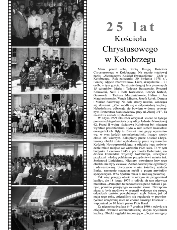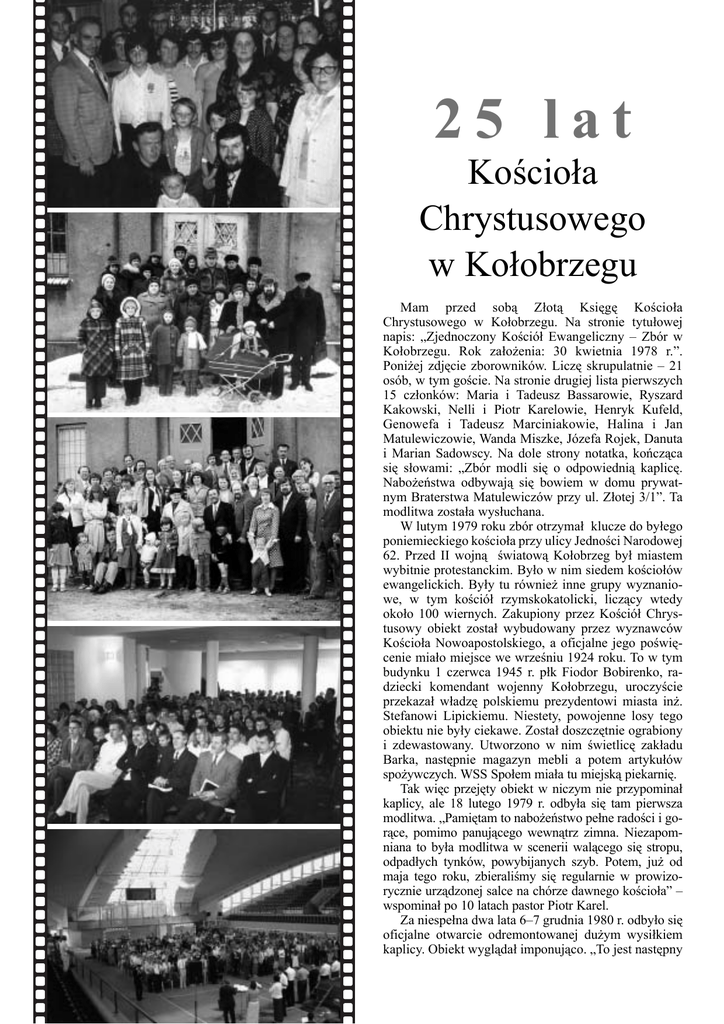 25 lat Kościoła Chrystusowego w Kołobrzegu Mam przed sobą Złotą Księgę Kościoła Chrystusowego w Kołobrzegu. Na stronie tytułowej napis: „Zjednoczony Kościół Ewangeliczny – Zbór w Kołobrzegu. Rok założenia: 30 kwietnia 1978 r.”. Poniżej zdjęcie zborowników. Liczę skrupulatnie – 21 osób, w tym goście. Na stronie drugiej lista pierwszych 15 członków: Maria i Tadeusz Bassarowie, Ryszard Kakowski, Nelli i Piotr Karelowie, Henryk Kufeld, Genowefa i Tadeusz Marciniakowie, Halina i Jan Matulewiczowie, Wanda Miszke, Józefa Rojek, Danuta i Marian Sadowscy. Na dole strony notatka, kończąca się słowami: „Zbór modli się o odpowiednią kaplicę. Nabożeństwa odbywają się bowiem w domu prywatnym Braterstwa Matulewiczów przy ul. Złotej 3/1”. Ta modlitwa została wysłuchana. W lutym 1979 roku zbór otrzymał klucze do byłego poniemieckiego kościoła przy ulicy Jedności Narodowej 62. Przed II wojną światową Kołobrzeg był miastem wybitnie protestanckim. Było w nim siedem kościołów ewangelickich. Były tu również inne grupy wyznaniowe, w tym kościół rzymskokatolicki, liczący wtedy około 100 wiernych. Zakupiony przez Kościół Chrystusowy obiekt został wybudowany przez wyznawców Kościoła Nowoapostolskiego, a oficjalne jego poświęcenie miało miejsce we wrześniu 1924 roku. To w tym budynku 1 czerwca 1945 r. płk Fiodor Bobirenko, radziecki komendant wojenny Kołobrzegu, uroczyście przekazał władzę polskiemu prezydentowi miasta inż. Stefanowi Lipickiemu. Niestety, powojenne losy tego obiektu nie były ciekawe. Został doszczętnie ograbiony i zdewastowany. Utworzono w nim świetlicę zakładu Barka, następnie magazyn mebli a potem artykułów spożywczych. WSS Społem miała tu miejską piekarnię. Tak więc przejęty obiekt w niczym nie przypominał kaplicy, ale 18 lutego 1979 r. odbyła się tam pierwsza modlitwa. „Pamiętam to nabożeństwo pełne radości i gorące, pomimo panującego wewnątrz zimna. Niezapomniana to była modlitwa w scenerii walącego się stropu, odpadłych tynków, powybijanych szyb. Potem, już od maja tego roku, zbieraliśmy się regularnie w prowizorycznie urządzonej salce na chórze dawnego kościoła” – wspominał po 10 latach pastor Piotr Karel. Za niespełna dwa lata 6–7 grudnia 1980 r. odbyło się oficjalne otwarcie odremontowanej dużym wysiłkiem kaplicy. Obiekt wyglądał imponująco. „To jest następny 8 S£O WO i ¯ YCI E nr 3/2003 Pierwsza modlitwa w nabytym obiekcie, 18 lutego 1979 r. Otwarcie kaplicy, 7 grudnia 1980 r. cud. Mówię poważnie, gdyż tego rodzaju cudów nie ma dowano istniejący budynek. Pozwoliło to podwoić posię w zwyczaju dostrzegać. Nie mieliśmy pieniędzy, by wierzchnię użytkową. Nowa kaplica pomieści 200 osób kupić budynek, cóż dopiero odremontować. Ale pomoc, swobodnie siedzących, maksymalnie 300. Póki co, jest jaką otrzymaliśmy od zborów z całego kraju, jak rów- to przestrzeń wystarczająca dla zboru. Ale bywa już cianież z Department of Mission [dziś Polish Christian sno. Ministries – red.], kierowanego przez brata Pawła Bajko, pozwoliła w krótkim czasie odbudować kaplicę. Przewracam kolejne kartki Złotej Księgi. Kolejne (...) Aż trudno uwierzyć, że na budowie było zatrudnio- zapiski: pierwsze błogosławieństwo dzieci, pierwsza nych społecznie tylko trzech braci, tj. Matulewicz, ewangelizacja, pierwszy chrzest, pierwszy ślub. Chrzty Sadowski i ja, oraz odpłatnie w Parsęcie, w Bałtyku, we własjeszcze tylko jedna osoba jako nym baptysterium. Obozy i zjazdy murarz” – komentował Piotr młodzieżowe. Akcje ewangelizaKarel. Uroczystość poświęcenia cyjne. Kluby Biblijne dla dzieci. kaplicy odnotowano w lokalnej Wycieczki zborowe. Ordynacje. prasie. Była połączona z naboSynod i sesje Kolegium Pastorów. żeństwem ewangelizacyjnym Koncerty. Programy świąteczne. i chrztem. Zjechali na nią goście Spotkania sylwestrowe. Święta z całej Polski, w tym ówczesne Żniw. Wpisy najróżniejszych gośwładze Zjednoczonego Kościoła ci z kraju i zagranicy... Gdyby Ewangelicznego: Konstanty Saceskrupulatność i zapał w dokumenwicz, Edward Czajko, Kazimierz towaniu wydarzeń pozostały na Muranty. Przyjechał chór z War- Pierwszy chrzest w nowej kaplicy, 7.12.1980 r. poziomie sprzed 20 lat, dziś byłaszawy z Puławskiej i zespół wokalno-instrumentalny by to pokaźna już biblioteczka, licząca kilkanaście albo z Katowic. Nowa kaplica z trudem mieściła zebranych, kilkadziesiąt tomów. choć – jak stwierdza Piotr Karel – „z całą pewnością Trudno określić moment, kiedy zaczęto używać rozówczesny zbór zmieściłby się w jednej ławce”. Tak było budowaną kaplicę. Po wyburzeniu ściany i połączeniu wtedy. Ale już w 1991 roku przystąpiono do rozbudowy z częścią dobudowaną, nabożeństwa przez lata odbywakaplicy. Symboliczne „złamanie gruntu” odbyło się ły się „na budowie”. Nie było zatem oficjalnego nowe23 czerwca 1991 r. Dobudowano sporą część i nadbu- go obiektu. Uroczyście natomiast obchodzono 25-lecie Kaplica w trakcie rozbudowy... ...i obecnie S£ OW O i ¯ YCI E nr 3/2003 9 zboru. Miało to miejsce 14–15 czerwca 2003 roku. To było wspólne rodzinne święto całego Regionu PółnocnoZachodniego. Sobota była dniem dziękczynno-wspomnieniowym. Podczas wieczornego bankietu w kaplicy przypominano Boże błogosławieństwa i dziękowano za nie. Odczytano liczne życzenia, nadesłane z okazji jubileuszu. Rozbrzmiewało radosne uwielbienie – gromki śpiew starych pieśni i nowych refrenów, w tym specjalnie skomponowanej na tę okoliczność pieśni „25 lat”. A potem uwielbialiśmy Boga donośnym wspólnym radosnym śpiewaniem. Był też czas na okolicznościowe życzenia gości z USA, Kanady i Niemiec. Pastor Paweł Wróbel odczytał list od Prezbitera Naczelnego W. Andrzeja Bajeńskiego. W imieniu pastorów Regionu głos zabrał pastor Waldemar 