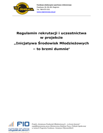 Fundacja edukacyjno-sportowa reGeneracja Pawłowo 18, 06-461 Regimin Tel. 780-073-252 www.regeneracja.org.pl Regulamin rekrutacji i uczestnictwa w projekcie „Inicjatywa Środowisk Młodzieżowych – to brzmi dumnie” Projekt „Inicjatywa Środowisk Młodzieżowych – to brzmi dumnie” współfinansowany przez Ministerstwo Rodziny Pracy i Polityki Społecznej w ramach Programu Funduszu Inicjatyw Obywatelskich Fundacja edukacyjno-sportowa reGeneracja Pawłowo 18, 06-461 Regimin Tel. 780-073-252 www.regeneracja.org.pl Spis treści: I. II. Postanowienia ogólne Definicje III. Cele projektu oraz zadania Inicjatywa Środowisk Młodzieżowych – to brzmi dumnie IV. Warunki uczestnictwa w projekcie V. VI. VII. Rekrutacja Prawa i obowiązki uczestników projektu Postanowienia końcowe Projekt „Inicjatywa Środowisk Młodzieżowych – to brzmi dumnie” współfinansowany przez Ministerstwo Rodziny Pracy i Polityki Społecznej w ramach Programu Funduszu Inicjatyw Obywatelskich Fundacja edukacyjno-sportowa reGeneracja Pawłowo 18, 06-461 Regimin Tel. 780-073-252 www.regeneracja.org.pl I. Postanowienia ogólne 1. Niniejszy Regulamin określa zasady rekrutacji i warunki uczestnictwa w projekcie pt. „Inicjatywa Środowisk Młodzieżowych – to brzmi dumnie”. Realizatorem projektu jest Fundacja edukacyjno – sportowa reGeneracja, Pawłowo 18, 06-461 Regimin. 2. Projekt „Inicjatywa Środowisk Młodzieżowych – to brzmi dumnie” jest współfinansowany ze środków Ministerstwa Rodziny Pracy i Polityki Społecznej w ramach programu Fundusz Inicjatyw Obywatelskich – FIO 2016 Projekt jest realizowany w okresie od 01.03.2016r. do 31.12.2016r. II. Definicje Program – oznacza Program Fundusz Inicjatyw Obywatelskich Priorytet – oznacza to Priorytet 3 Aktywni obywatele Działanie – oznacza to Działanie 2 Rozwijanie edukacji obywatelskiej i kompetencji społecznych Projekt – oznacza to brzmi dumnie”. projekt pt. „Inicjatywa Środowisk Młodzieżowych – to Uczestnik projektu – uczeń - gimnazjalista, spełniający kryteria uczestnictwa w projekcie określone w części IV niniejszego Regulaminu zamieszkały na terenie terytorium z trzech gmin powiatu ciechanowskiego: Ciechanów, Grudusk, Glinojeck i dwóch powiatu przasnyskiego: Czernice Borowe i Krasne. Realizator projektu – Fundacja edukacyjno – sportowa reGeneracja Biuro projektu – znajduje się przy ul. 17 Stycznia 13, pok. 44, 06-400 Ciechanów Projekt „Inicjatywa Środowisk Młodzieżowych – to brzmi dumnie” współfinansowany przez Ministerstwo Rodziny Pracy i Polityki Społecznej w ramach Programu Funduszu Inicjatyw Obywatelskich Fundacja edukacyjno-sportowa reGeneracja Pawłowo 18, 06-461 Regimin Tel. 780-073-252 www.regeneracja.org.pl III. Cele projektu Inicjatywa Środowisk Młodzieżowych – to brzmi dumnie 1. Cel ogólny projektu Głównym celem jaki zamierzamy osiągnąć za sprawą realizacji działań projektowych jest zwiększenie aktywności społecznej młodzieży wiejskiej w wieku gimnazjalnym z terenów trzech gmin powiatu ciechanowskiego i dwóch powiatu przasnyskiego poprzez zaangażowanie ich w życie publiczne i realizację działań na rzecz własnych społeczności lokalnych. Cele szczegółowe projektu to przede wszystkim: aktywizacja społeczna młodzieży wiejskiej w wieku gimnazjalnym z terenu 5 gmin; podniesienie świadomości młodzieży wiejskiej w zakresie możliwości realizacji oddolnych inicjatyw młodzieżowych; wyrównywanie szans młodzieży z terenów wiejskich w zakresie dostępu do infrastruktury społecznej; zbudowanie środowiska lokalnych liderów młodzieżowych na terenie gmin powiatu ciechanowskiego i przasnyskiego; wyposażenie młodzieży w wiedzę z zakresu demokracji obywatelskiej; zrealizowanie autorskich inicjatyw przeprowadzonych przez młodzież na rzecz własnej społeczności lokalnej; podniesienie wiedzy młodzieży z zakresu funkcjonowania organizacji młodzieżowych działających w najbliższej okolicy; integracja młodzieży z terenów wiejskich z własną społecznością lokalną; podniesienie umiejętności pracy w grupie i pracy metodą projektową wśród młodzieży; wyposażenie młodzieży wiejskiej w wiedzę i umiejętności umożliwiające tworzenie młodzieżowych organizacji społecznych; wyposażenie młodzieży w umiejętności organizacyjne, liderskie i komunikacyjne; wyposażenie młodzieży w kompetencje niezbędne do skutecznego działania; zniwelowanie biernej postawy młodzieży wiejskiej w stosunku do środowiska lokalnego i społeczeństwa. 2. Poszczególne działania w Młodzieżowych – to brzmi dumnie” ramach projektu „Inicjatywa Środowisk Zgodnie z celem projektu w ramach realizacji zadania publicznego będą realizowane następujące działania: Projekt „Inicjatywa Środowisk Młodzieżowych – to brzmi dumnie” współfinansowany przez Ministerstwo Rodziny Pracy i Polityki Społecznej w ramach Programu Funduszu Inicjatyw Obywatelskich Fundacja edukacyjno-sportowa reGeneracja Pawłowo 18, 06-461 Regimin Tel. 780-073-252 www.regeneracja.org.pl 1. Akademia Liderów Lokalnych – Celem zadania jest rekrutacja wśród młodzieży gimnazjalnej z terenu realizacji projektu grupy lokalnych liderów młodzieżowych – po dwóch z każdej ze szkół, łącznie 10 osób, która następnie będzie organizować na terenie swoich środowisk grupy inicjatywne odpowiedzialne za organizacje i przeprowadzenie inicjatywy w odpowiedzi na potrzeby swojego środowiska. Liderzy zostaną przygotowani merytorycznie do zadań poprzez udział w warsztatach „Akademia Liderów Lokalnych”. Program warsztatów „Akademia Liderów Lokalnych” 1. Jestem liderem? – autodiagnoza (8 godzin) a) Moje mocne i słabe strony, b) Co mogę udoskonalić, c) Jak wykorzystać swój potencjał. 2. Jak skutecznie działać na swoim „podwórku”? (16 godzin) a) Diagnoza środowiska lokalnego, b) Techniki motywacji, c) Organizacja pracy w grupie,