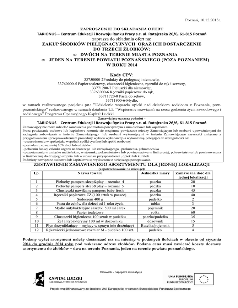 Poznań, 10.12.2013r. ZAPROSZENIE DO SKŁADANIA OFERT TARIONUS – Centrum Edukacji i Rozwoju Rynku Pracy s.c. ul. Ratajczaka 26/6, 61-815 Poznań zaprasza do składania ofert na: ZAKUP ŚRODKÓW PIELĘGNACYJNYCH ORAZ ICH DOSTARCZENIE DO TRZECH śŁOBKÓW: • DWÓCH NA TERENIE MIASTA POZNANIA • JEDEN NA TERENIE POWIATU POZNAŃSKIEGO (POZA POZNANIEM) W ROKU 2014 Kody CPV: 33750000-2Produkty do pielęgnacji niemowląt 33760000-5 Papier toaletowy, chusteczki higieniczne, ręczniki do rąk i serwety, 33771200-7 Pieluszki dla niemowląt, 33763000-6 Ręczniki papierowe do rąk, 33711720-0 Pasta do zębów, 33711900-6-Mydło, w ramach realizowanego projektu pn.: ”Udzielenie wsparcia opieki nad dzieckiem rodzicom z Poznania, pow. poznańskiego” realizowanego w ramach działania 1.5. ”Wspieranie rozwiązań na rzecz godzenia Ŝycia zawodowego i rodzinnego” Programu Operacyjnego Kapitał Ludzki. Zamawiający oznacza podmiot – TARIONUS – Centrum Edukacji i Rozwoju Rynku Pracy s.c. ul. Ratajczaka 26/6, 61-815 Poznań Zamawiający nie moŜe udzielać zamówienia podmiotom powiązanym z nim osobowo lub kapitałowo. Przez powiązanie osobowe lub kapitałowe rozumie się wzajemne powiązanie między Zamawiającym lub osobami upowaŜnionymi do zaciągania zobowiązań w imieniu Zamawiającego lub osobami wykonującymi w imieniu Zamawiającego czynności związane z przygotowaniem i przeprowadzeniem procedury wyboru wykonawcy, a wykonawcą, polegające w szczególności na: - uczestniczeniu w spółce jako wspólnik spółki cywilnej lub spółki osobowej - posiadaniu co najmniej 10% akcji lub udziałów - pełnieniu funkcji członka organu nadzorczego lub zarządzającego , prokurenta, pełnomocnika - pozostawaniu w związku małŜeńskim, w stosunku pokrewieństwa lub powinowactwa w linii prostej, pokrewieństwa lub powinowactwa w linii bocznej do drugiego stopnia lub w stosunku przysposobienia , opieki lub kurateli. Podmioty powiązane osobowo lub kapitałowo są wykluczone z niniejszego postępowania. ZESTAWIENIE ZAMAWIANEGO ASORTYMENTU DLA JEDNEJ LOKALIZACJI (zapotrzebowanie na miesiąc): Lp. Nazwa towaru Jednostka miary 1 2 3 4 5 6 7 8 9 10 11 12 Pieluchy pampers sleep&play – rozmiar 4 Pieluchy pampers sleep&play – rozmiar 5 Chusteczki nawilŜane pampers baby fresh Ręczniki papierowe ZZ (100 sztuk w paczce) Sudocrem 400 g Pasta do zębów dla dzieci od 1 roku Ŝycia Mydło antybakteryjne saszetki 500 ml carex Papier toaletowy Chusteczki higieniczne 100 sztuk w pudełku śel antybakteryjny 100 ml w dozowniku Płyn dezynfekujący – myjący w sprayu (nie draŜniący) Rękawiczki jednorazowe rozmiar M - pudełko 100 szt. paczka paczka paczka paczka pudełko tubka pojemnik rolka paczka/pudełko dozownik Butelka/pojemnik pudełko Zamawiana ilość dla jednej lokalizacji 20 10 45 40 2 3 20 60 35 15 5 4 Podany wyŜej asortyment naleŜy dostarczać raz na miesiąc w podanych ilościach w okresie od stycznia 2014 do grudnia 2014 roku pod wskazane adresy Ŝłobków. Podana cena musi zawierać koszty dostawy asortymentu do Ŝłobków – dwa na terenie Poznania, jeden na terenie powiatu poznańskiego. Oferty naleŜy składać wyłącznie na formularzu stanowiącym załącznik nr 1 do zapytania ofertowego. ZłoŜona oferta – stanowiąca załącznik nr 1 do zapytania ofertowego musi zawierać : 1. nazwę oferenta 2. oferowana cenę brutto wraz z kosztami dostawy za wskazany w zapytaniu ofertowym asortyment – według załącznika nr 1 do zapytania ofertowego 3. oświadczenie o braku powiązań – według załącznika nr 2 do zapytania ofertowego Zamawiający nie dopuszcza moŜliwości składania ofert częściowych. Oferty naleŜy składać w terminie do 27.12.2013r. na adresy : 1. e-mail: [email protected] lub 2. pocztą : TARIONUS – Centrum Edukacji i Rozwoju Rynku Pracy s.c. ul. Ratajczaka 26/6, 61-815 Poznań Wybór najkorzystniejszej oferty nastąpi w oparciu o następujące kryterium – łączna cena zakupu wszystkich elementów zamówienia z wagą 100 %. Punkty przyznawane za podane kryterium będą liczone wg. następującego wzoru: liczba punktów = (Cmin/Cof) x 100 x waga ; gdzie: Cmin oznacza najniŜszą cenę spośród wszystkich ofert, Cof oznacza cenę podaną w ofercie. Będą brane pod uwagę tylko oferty spełniające wymogi określone w niniejszym zapytaniu ofertowym. Zamawiający dokona łącznego zamówienia u tego oferenta, który złoŜy najkorzystniejszą cenowo ofertę łącznie na wszystkie elementy zamówienia. Załącznik nr 1 do zapytania ofertowego z 10.12.13 - zakup środków pielęgnacyjnych do trzech żłobków – TARIONUS – Centrum Edukacji i Rozwoju Rynku Pracy s.c. ul. Ratajczaka 26/6, 61-815 Poznań Oferta na dostawę środków pielęgnacyjnych do trzech Ŝłobków z ………………… (data) OFERENT: …………………………………….. ……………………………………. …………………………………….. Lp. Nazwa towaru Jednostk a miary Zamawian a ilość dla jednej lokalizacji 1 Pieluchy pampers sleep&play – rozmiar 4 Pieluchy pampers sleep&play – rozmiar 5 Chusteczki nawilżane pampers baby fresh Ręczniki papierowe ZZ (100 sztuk w paczce) Sudocrem 400 g Pasta do zębów dla dzieci od 1 roku życia Mydło antybakteryjne saszetki 500 ml carex Papier toaletowy Chusteczki higieniczne 100 sztuk w pudełku Żel antybakteryjny 100 ml w dozowniku Płyn dezynfekujący – myjący w sprayu (nie drażniący) Rękawiczki jednorazowe rozmiar M - pudełko 100 szt. paczka 20 paczka 10 paczka 45 paczka 40 pudełko tubka 2 3 pojemnik 20 rolka paczka/ pudełko dozownik 60 35 2 3 4 5 6 7 8 9 10 11 12 Oferowana cena jednostkowa brutto sprzedaŜy Całkowita oferowana cena sprzedaŜy brutto dla jednej lokalizacji 15 Butelka/ pojemnik 5 pudełko 4 RAZEM …………………………………………….. Podpis oferenta Całkowita oferowana cena sprzedaŜy brutto dla trzech lokalizacji Uwagi Załącznik nr 2 do zapytania oferto