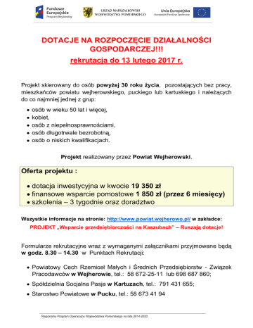DOTACJE NA ROZPOCZĘCIE DZIAŁALNOŚCI GOSPODARCZEJ!!! rekrutacja do 13 lutego 2017 r. Projekt skierowany do osób powyżej 30 roku życia, pozostających bez pracy, mieszkańców powiatu wejherowskiego, puckiego lub kartuskiego i należących do co najmniej jednej z grup: osób w wieku 50 lat i więcej, kobiet, osób z niepełnosprawnościami, osób długotrwale bezrobotną, osób o niskich kwalifikacjach. Projekt realizowany przez Powiat Wejherowski. Oferta projektu : dotacja inwestycyjna w kwocie 19 350 zł finansowe wsparcie pomostowe 1 850 zł (przez 6 miesięcy) szkolenia – 3 tygodnie oraz doradztwo Wszystkie informacje na stronie: http://www.powiat.wejherowo.pl/ w zakładce: PROJEKT „Wsparcie przedsiębiorczości na Kaszubach” – Ruszają dotacje! Formularze rekrutacyjne wraz z wymaganymi załącznikami przyjmowane będą w godz. 8.30 – 14.30 w Punktach Rekrutacji: Powiatowy Cech Rzemiosł Małych i Średnich Przedsiębiorstw - Związek Pracodawców w Wejherowie, tel.: 58 672-25-11 lub 698 687 860; Spółdzielnia Socjalna Pasja w Kartuzach, tel.: 791 431 655; Starostwo Powiatowe w Pucku, tel.: 58 673 41 94