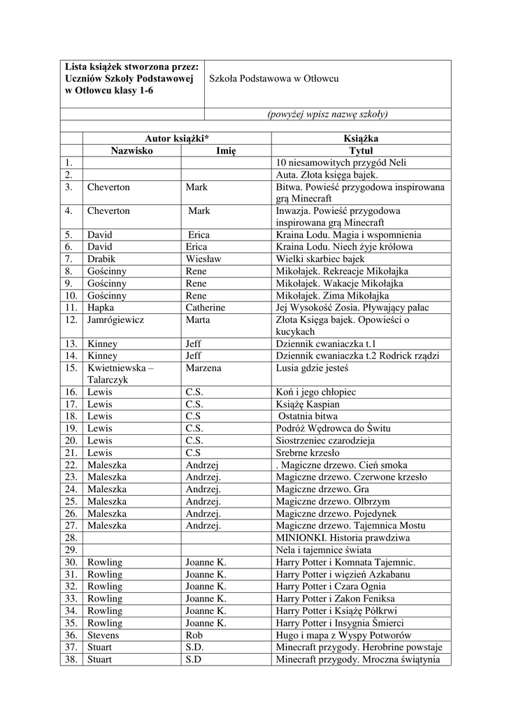 Lista książek stworzona przez: Uczniów Szkoły Podstawowej w Otłowcu klasy 1-6 Szkoła Podstawowa w Otłowcu (powyżej wpisz nazwę szkoły) Autor książki* Nazwisko Imię 1. 2. 3. Cheverton Mark 4. Cheverton Mark 5. 6. 7. 8. 9. 10. 11. 12. David David Drabik żo cinny żo cinny żo cinny Hapka Jamrógiewicz Erica Erica Wiesław Rene Rene Rene Catherine Marta 13. Kinney 14. Kinney 15. Kwietniewska – Talarczyk 16. Lewis 17. Lewis 18. Lewis 19. Lewis 20. Lewis 21. Lewis 22. Maleszka 23. Maleszka 24. Maleszka 25. Maleszka 26. Maleszka 27. Maleszka 28. 29. 30. Rowling 31. Rowling 32. Rowling 33. Rowling 34. Rowling 35. Rowling 36. Stevens 37. Stuart 38. Stuart Jeff Jeff Marzena C.S. C.S. C.S C.S. C.S. C.S Andrzej Andrzej. Andrzej. Andrzej. Andrzej. Andrzej. Joanne K. Joanne K. Joanne K. Joanne K. Joanne K. Joanne K. Rob S.D. S.D Książka Tytuł 10 niesamowitych przygód Neli Auta. Złota księga bajek. Bitwa. Powie ć przygodowa inspirowana grą Minecraft Inwazja. Powie ć przygodowa inspirowana grą Minecraft Kraina Lodu. Magia i wspomnienia Kraina Lodu. Niech yje królowa Wielki skarbiec bajek Mikołajek. Rekreacje Mikołajka Mikołajek. Wakacje Mikołajka Mikołajek. Zima Mikołajka Jej Wysoko ć Zosia. Pływający pałac Złota Księga bajek. Opowie ci o kucykach Dziennik cwaniaczka t.1 Dziennik cwaniaczka t.2 Rodrick rządzi Lusia gdzie jeste Koń i jego chłopiec Ksią ę Kaspian Ostatnia bitwa Podró Wędrowca do witu Siostrzeniec czarodzieja Srebrne krzesło . Magiczne drzewo. Cień smoka Magiczne drzewo. Czerwone krzesło Magiczne drzewo. Gra Magiczne drzewo. Olbrzym Magiczne drzewo. Pojedynek Magiczne drzewo. Tajemnica Mostu MINIONKI. Historia prawdziwa Nela i tajemnice wiata Harry Potter i Komnata Tajemnic. Harry Potter i więzień Azkabanu Harry Potter i Czara Ognia Harry Potter i Zakon Feniksa Harry Potter i Ksią ę Półkrwi Harry Potter i Insygnia mierci Hugo i mapa z Wyspy Potworów Minecraft przygody. Herobrine powstaje Minecraft przygody. Mroczna wiątynia 39. Stuart S.D. 40. Stuart 41. Stuart S.D S.D. 42. Stuart . S.D 43. Stuart S.D. 44. Stuart S.D. 45. Stuart S.D 46. Webb Holly 47. Webb 48. Zett 49. ółtowska-Darska Holly Sabine Yvette ółtowska-Darska Yvette 50. Przygody w wiecie Minecrafta. Dzień Creeperów Przygody w wiecie Minecrafta. Portal Przygody w wiecie Minecrafta. Przeniesione królestwo Przygody w wiecie Minecrafta. Zapomniany restart Przygody w wiecie Minecrafta. Zniszczć Withera Przygody w wiecie Minecrafta. Nie miertelny zombie Przygody w wiecie Minecrafta. Kraina zombie Zaopiekuj się mną. Samotne więta Oskara Zaopiekuj się mną. Zagubiona w niegu Geniusz Kuba Ronaldo. Chłopiec, który wiedział czego chce Messi. Mały chłopiec który stał się wielkim piłkarzem *Uprzejmie prosimy wpisywać nazwisko autora w porządku alfabetycznym.