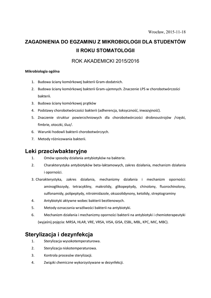 Wrocław, 2015-11-18 ZAGADNIENIA DO EGZAMINU Z MIKROBIOLOGII DLA STUDENTÓW II ROKU STOMATOLOGII ROK AKADEMICKI 2015/2016 Mikrobiologia ogólna 1. Budowa ściany komórkowej bakterii Gram-dodatnich. 2. Budowa ściany komórkowej bakterii Gram-ujemnych. Znaczenie LPS w chorobotwórczości bakterii. 3. Budowa ściany komórkowej prątków 4. Podstawy chorobotwórczości bakterii (adherencja, toksyczność, inwazyjność). 5. Znaczenie struktur powierzchniowych dla chorobotwórczości drobnoustrojów /rzęski, fimbrie, otoczki, śluz/. 6. Warunki hodowli bakterii chorobotwórczych. 7. Metody różnicowania bakterii. Leki przeciwbakteryjne 1. Omów sposoby działania antybiotyków na bakterie. 2. Charakterystyka antybiotyków beta-laktamowych, zakres działania, mechanizm działania i oporności. 3. Charakterystyka, zakres działania, mechanizmy działania i mechanizm oporności: aminoglikozydy, tetracykliny, makrolidy, glikopeptydy, chinolony, fluorochinolony, sulfonamidy, polipeptydy, nitroimidazole, oksazolidynony, ketolidy, streptograminy 4. Antybiotyki aktywne wobec bakterii beztlenowych. 5. Metody oznaczania wrażliwości bakterii na antybiotyki. 6. Mechanizm działania i mechanizmy oporności bakterii na antybiotyki i chemioterapeutyki (wyjaśnij pojęcia: MRSA, HLAR, VRE, VRSA, VISA, GISA, ESBL, MBL, KPC, MIC, MBC). Sterylizacja i dezynfekcja 1. Sterylizacja wysokotemperaturowa. 2. Sterylizacja niskotemperaturowa. 3. Kontrola procesów sterylizacji. 4. Związki chemiczne wykorzystywane w dezynfekcji. Flora jamy ustnej, jej udział w zakażeniach 1. Udział bakterii w próchnicy zębów. 2. Udział bakterii w chorobach przyzębia. 3. Promienica – czynnik etiologiczny, diagnostyka i leczenie. 4. Gram-ujemne pałeczki bezwzględnie beztlenowe – udział w zakażeniach jamy ustnej. 5. Zakażenia jamy ustnej o etiologii grzybiczej. 6. Flora fizjologiczna organizmu człowieka 7. Klasyfikacja chorób przyzębia 8. Zakażenia błony śluzowej jamy ustnej i gruczołów ślinowych Zakażenia układu oddechowego 1. Cechy chorobotwórcze Staphylococcus aureus, Streptococcus pneumoniae, Klebsiella pneumoniae 2. Zakażenia powodowane przez paciorkowce grupy serologicznej A (S. pyogenes )i B ( S. agalactiae) 3. Postacie kliniczne i etiologia anginy. 4. Diagnostyka błonicy. 5. Chorobotwórczość pałeczek Haemphilus. 6. Czynniki wirulencyjne i chorobotwórczość Pseudomonas aeruginosa. 7. Chlamydophila pneumoniae, Mycoplasma pneumoniae 8. Etiologia i diagnostyka gruźlicy. 9. Profilaktyka gruźlicy: BCG – wyjaśnij akronim, znaczenie w profilaktyce gruźlicy 10. Zakażenia układu oddechowego o etiologii wirusowej. Zakażenia przewodu pokarmowego 1. Chorobotwórczość pałeczek Salmonella – dur brzuszny, zatrucia pokarmowe. 2. Chorobotwórczość pałeczek Shigella – czerwonka bakteryjna. 3. Zakażenia przewodu pokarmowego – cholera, kampylobakterioza, chorobotwórczość Escherichia coli, Campylobacter, Vibrio, Clostridium difficile, Bacillus cereus Laseczki Gram-dodatnie 1. Tężec – etiologia i zapobieganie. 2. Botulinizm – etiologia i zapobieganie. 3. Zgorzel gazowa – chorobotwórczość Clostridium perfringens. 4. Charakterystyka Clostridium difficile 5. promienica –Bacillus anthracis Choroby przenoszone drogą płciową 1. Diagnostyka kiły I, II i III-rzędowej. 2. Kliniczne objawy kiły w jamie ustnej. 3. Etiologia i diagnostyka rzeżączki. 4. Chlamydia trachomatis – charakterystyka i chorobotwórczość. 5. Wymień i omów czynniki etiologiczne chorób przenoszonych drogą płciową (czynnik etiologiczny –choroba) Wybrane zagadnienia z wirusologii lekarskiej 1. Charakterystyka wirusów, w jaki sposób wirusy wywołują choroby? 2. Wirusowe zakażenia jamy ustnej. 3. Wirus HIV, epidemiologia zakażeń. 4. Zakażenia oportunistyczne w przebiegu AIDS. 5. WZW – etiologia – typy wirusów HAV(Hepatitis A Virus), HBV, HCV, HDV, HEV – ryzyko infekcji, profilaktyka. 6. Wirusy wywołujące zapalenie żołądka i jelit: rotawirusy, adenowirusy, norowirusy, kalici-, korona- i astrowirusy 7. Herpeswirusy – Herpes simplex typ I i II, wirus cytomegalii (CMV), wirus Epsteina-Baar (EBV), wirus ospy wietrznej i półpaśca (VZV). 8. Adenowirusy, Papilomawirusy, Picornawirusy (Poliowirusy, Coxsackie, Enterowirusy, Rhinowirusy), Paramyxowirusy 9. Ortomyksowirusy 10. Wirusy onkogenne. Grzyby jako czynniki infekcyjne – kandydoza, aspergiloza Grzyby o szczególnym znaczeniu w praktyce stomatologicznej (klasyfikacja, morfologia, rozmnażanie), grzyby drożdżopodobne, grzyby pleśniowe Candida albicans Cryptococcus neoformans Aspergillus spp Pneumocystis jiroveci (dawniej Pneumocystis carinii) Drobnoustroje o szczególnym znaczeniu w praktyce stomatologicznej Charakterystyka bakterii, podstawy chorobotwórczości, postacie kliniczne i epidemiologia zakażeń, diagnostyka, wrażliwość i oporność na antybiotyki Rodzaj: Staphylococcus, Steptococcus, Enterococcus Rodzaje: Lactobacillus, Corynebacterium, Propionibacterium Promieniowce i Gram-dodatnie laseczki (rodzaje Bacillus, Clostridium) Rodzina Neisseriaceae Pałeczki jelitowe (Salmonella , Shigella, Escherichia coli, Klebsiella, Pseudomonas) Rodzaj Vibrio, Campylobacter, Helicobacter Rodzaj Bacteroides, Porphyromonas, Prevotella, Fusobacterium Bakterie kapnofilne – Rodzaj: Actinobacillus, Capnocytophaga, Eikenella Bakterie spiralne: Treponema, Borrelia, Leptospira Legionella Chlamydia, Mycoplasma, Ureaplasma Wykładowca dr hab. Grażyna Gościniak prof. nadzw