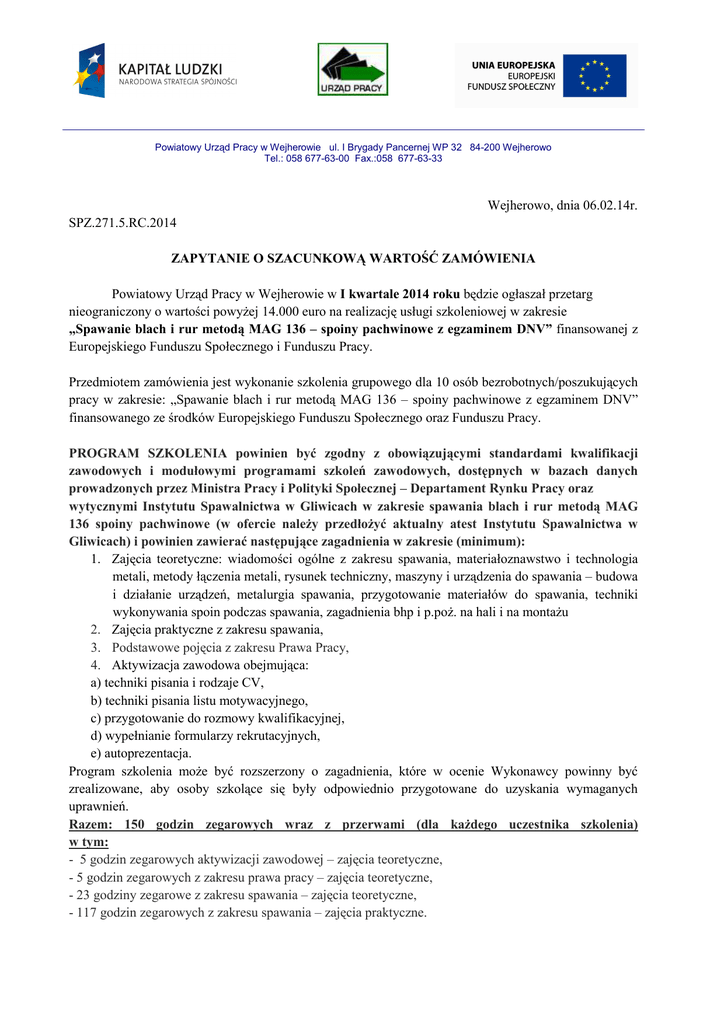 Powiatowy Urząd Pracy w Wejherowie ul. I Brygady Pancernej WP 32 84-200 Wejherowo Tel.: 058 677-63-00 Fax.:058 677-63-33 Wejherowo, dnia 06.02.14r. SPZ.271.5.RC.2014 ZAPYTANIE O SZACUNKOWĄ WARTOŚĆ ZAMÓWIENIA Powiatowy Urząd Pracy w Wejherowie w I kwartale 2014 roku będzie ogłaszał przetarg nieograniczony o wartości powyżej 14.000 euro na realizację usługi szkoleniowej w zakresie „Spawanie blach i rur metodą MAG 136 – spoiny pachwinowe z egzaminem DNV” finansowanej z Europejskiego Funduszu Społecznego i Funduszu Pracy. Przedmiotem zamówienia jest wykonanie szkolenia grupowego dla 10 osób bezrobotnych/poszukujących pracy w zakresie: „Spawanie blach i rur metodą MAG 136 – spoiny pachwinowe z egzaminem DNV” finansowanego ze środków Europejskiego Funduszu Społecznego oraz Funduszu Pracy. PROGRAM SZKOLENIA powinien być zgodny z obowiązującymi standardami kwalifikacji zawodowych i modułowymi programami szkoleń zawodowych, dostępnych w bazach danych prowadzonych przez Ministra Pracy i Polityki Społecznej – Departament Rynku Pracy oraz wytycznymi Instytutu Spawalnictwa w Gliwicach w zakresie spawania blach i rur metodą MAG 136 spoiny pachwinowe (w ofercie należy przedłożyć aktualny atest Instytutu Spawalnictwa w Gliwicach) i powinien zawierać następujące zagadnienia w zakresie (minimum): 1. Zajęcia teoretyczne: wiadomości ogólne z zakresu spawania, materiałoznawstwo i technologia metali, metody łączenia metali, rysunek techniczny, maszyny i urządzenia do spawania – budowa i działanie urządzeń, metalurgia spawania, przygotowanie materiałów do spawania, techniki wykonywania spoin podczas spawania, zagadnienia bhp i p.poż. na hali i na montażu 2. Zajęcia praktyczne z zakresu spawania, 3. Podstawowe pojęcia z zakresu Prawa Pracy, 4. Aktywizacja zawodowa obejmująca: a) techniki pisania i rodzaje CV, b) techniki pisania listu motywacyjnego, c) przygotowanie do rozmowy kwalifikacyjnej, d) wypełnianie formularzy rekrutacyjnych, e) autoprezentacja. Program szkolenia może być rozszerzony o zagadnienia, które w ocenie Wykonawcy powinny być zrealizowane, aby osoby szkolące się były odpowiednio przygotowane do uzyskania wymaganych uprawnień. Razem: 150 godzin zegarowych wraz z przerwami (dla każdego uczestnika szkolenia) w tym: - 5 godzin zegarowych aktywizacji zawodowej – zajęcia teoretyczne, - 5 godzin zegarowych z zakresu prawa pracy – zajęcia teoretyczne, - 23 godziny zegarowe z zakresu spawania – zajęcia teoretyczne, - 117 godzin zegarowych z zakresu spawania – zajęcia praktyczne. Powiatowy Urząd Pracy w Wejherowie ul. I Brygady Pancernej WP 32 84-200 Wejherowo Tel.: 058 677-63-00 Fax.:058 677-63-33 1. 2. 3. 4. Liczba osób objętych szkoleniem: 10 Szkolenie zostanie przeprowadzone w dwóch grupach szkoleniowych liczących po 5 osób. Czas trwania szkolenia: nie dłużej niż 2 miesiące. Termin realizacji zamówienia: kwiecień – grudzień 2014r. • jedna grupa szkoleniowa (5 os.) – II kwartał 2014r. • jedna grupa szkoleniowa (5 os.) – III kwartał 2014 r. 5. Zamawiający skieruje wyłonionych kandydatów do Poradni Medycyny Pracy na wymagane badania lekarskie. 6. Uczestników szkolenia należy obowiązkowo wyposażyć w następujące materiały szkoleniowe w postaci: • zeszyt, • długopis, • identyfikator, • podręcznik lub inną literaturę (skrypt autorski) z zakresu tematyki objętej programem szkolenia, • płyta CD – zawierająca materiały edukacyjne, • odpowiednią odzież ochronną, buty oraz rękawice zgodnie z przepisami bhp i przedmiotem zamówienia – niezbędną do realizacji zajęć praktycznych. Wymienione powyżej materiały każdy uczestnik szkolenia otrzyma na własność. Koszt niniejszych materiałów należy uwzględnić w kalkulacji kosztów szkolenia. 7. Wykonawca zapewni każdemu uczestnikowi szkolenia poczęstunek w postaci: kawy, herbaty, napoi, ciastek w każdym dniu realizacji szkolenia. Koszt niniejszego poczęstunku należy uwzględnić w kalkulacji kosztów szkolenia. 8. Szkolenie powinno mieć opiekuna z ramienia Wykonawcy czyli osobę odpowiedzialną za organizację szkolenia, wskazaną do kontaktu z uczestnikami szkolenia oraz z Zamawiającym. 9. Wykonawca zapewni osobę posiadającą niezbędne kwalifikacje, która sprawować będzie nadzór nad uczestnikami szkolenia oraz prawidłowością wykonania prac podczas zajęć praktycznych. 10. Wykonawca ubezpieczy uczestników szkolenia od następstw nieszczęśliwych wypadków powstałych w związku ze szkoleniem oraz w drodze do miejsca szkolenia i z powrotem. Ubezpieczenie obejmuje okres trwania szkolenia. Kserokopię polisy ubezpieczeniowej należy przedłożyć Zamawiającemu. 11. Lokal/pomieszczenia w którym będą przeprowadzane zajęcia teoretyczne oraz praktyczne powinien być przestronny i przewiewny, posiadać dostęp do pomieszczeń sanitarnych oraz winien gwarantować w trakcie szkolenia wymogi bezpieczeństwa i higieny pracy w tym zakresie. Ponadto lokal powinien być wyposażony w pomoce techniczno - dydaktyczne i sprzęt umożliwiający wykonywanie prac związanych ze spawaniem. Sala do zajęć praktycznych powinna mieć 5 stanowisk dydaktycznych do praktycznej nauki zawodu. Przy jednym stanowisku szkoli się jedna osoba. Wykonawca zapewni odpowiednie ilości materiału spawalniczego pozwalającego na samodzielne ćwiczenie przez cały okres trwania szkolenia. 12. Miejscem wykonania zamówienia w części teoretycznej i praktycznej jest województwo pomorskie. 13. Wykonawca zobowiązany jest do zorganizowania i opłacenia uczestnikom szkolenia dwóch egzaminów pod nadzorem jednostki certyfikującej: Instytutu Spawalnictwa w Gliwicach oraz DNV. Powiatowy Urząd Pracy w Wejherowie ul. I Brygady Pancernej WP 32 84-200 Wejherowo Tel.: 058 677-63-00 Fax.:058 677-63-33 Wykonawca dopełni wszelkich formalności związanych ze zgłoszeniem uczestników do egzaminów zewnętrznych i ich przeprowadze