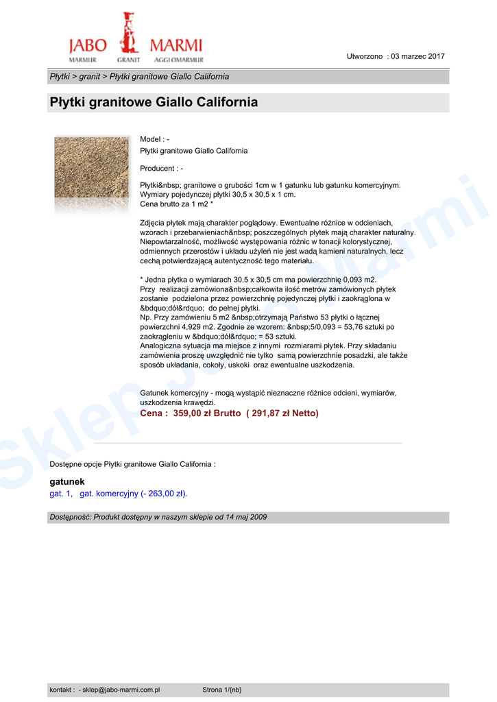 Utworzono : 03 marzec 2017 Płytki > granit > Płytki granitowe Giallo California Płytki granitowe Giallo California Model : Płytki granitowe Giallo California Producent : Płytki granitowe o grubości 1cm w 1 gatunku lub gatunku komercyjnym. Wymiary pojedynczej płytki 30,5 x 30,5 x 1 cm. Cena brutto za 1 m2 * r a Zdjęcia płytek mają charakter poglądowy. Ewentualne różnice w odcieniach, wzorach i przebarwieniach poszczególnych płytek mają charakter naturalny. Niepowtarzalność, możliwość występowania różnic w tonacji kolorystycznej, odmiennych przerostów i układu użyleń nie jest wadą kamieni naturalnych, lecz cechą potwierdzającą autentyczność tego materiału. M o * Jedna płytka o wymiarach 30,5 x 30,5 cm ma powierzchnię 0,093 m2. Przy realizacji zamówiona całkowita ilość metrów zamówionych płytek zostanie podzielona przez powierzchnię pojedynczej płytki i zaokrąglona w „dół” do pełnej płytki. Np. Przy zamówieniu 5 m2 otrzymają Państwo 53 płytki o łącznej powierzchni 4,929 m2. Zgodnie ze wzorem: 5/0,093 = 53,76 sztuki po zaokrągleniu w „dół” = 53 sztuki. Analogiczna sytuacja ma miejsce z innymi rozmiarami płytek. Przy składaniu zamówienia proszę uwzględnić nie tylko samą powierzchnie posadzki, ale także sposób układania, cokoły, uskoki oraz ewentualne uszkodzenia. p e l k S b a J Gatunek komercyjny - mogą wystąpić nieznaczne różnice odcieni, wymiarów, uszkodzenia krawędzi. Cena : 359,00 zł Brutto ( 291,87 zł Netto) Dostępne opcje Płytki granitowe Giallo California : gatunek gat. 1, gat. komercyjny (- 263,00 zł). Dostępność: Produkt dostępny w naszym sklepie od 14 maj 2009 kontakt : - [email protected] Strona 1/{nb} i m