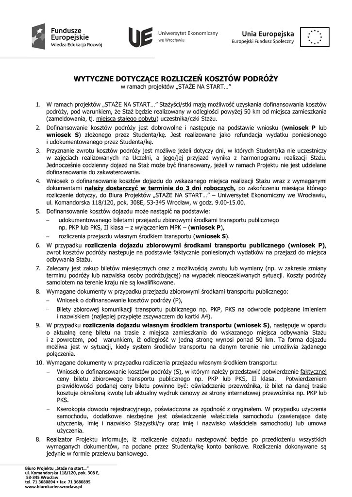 WYTYCZNE DOTYCZĄCE ROZLICZEŃ KOSZTÓW PODRÓŻY w ramach projektów „STAŻE NA START…” 1. W ramach projektów „STAŻE NA START…” Stażyści/stki mają możliwość uzyskania dofinansowania kosztów podróży, pod warunkiem, że Staż będzie realizowany w odległości powyżej 50 km od miejsca zamieszkania (zameldowania, tj. miejsca stałego pobytu) uczestnika/czki Stażu. 2. Dofinansowanie kosztów podróży jest dobrowolne i następuje na podstawie wniosku (wniosek P lub wniosek S) złożonego przez Studenta/kę. Jest realizowane jako refundacja wydatku poniesionego i udokumentowanego przez Studenta/kę. 3. Przyznanie zwrotu kosztów podróży jest możliwe jeżeli dotyczy dni, w których Student/ka nie uczestniczy w zajęciach realizowanych na Uczelni, a jego/jej przyjazd wynika z harmonogramu realizacji Stażu. Jednocześnie codzienny dojazd na Staż może być finansowany, jeżeli w ramach Projektu nie jest udzielane dofinansowania do zakwaterowania. 4. Wniosek o dofinansowanie kosztów dojazdu do wskazanego miejsca realizacji Stażu wraz z wymaganymi dokumentami należy dostarczyć w terminie do 3 dni roboczych, po zakończeniu miesiąca którego rozliczenie dotyczy, do Biura Projektów „STAŻE NA START…” – Uniwersytet Ekonomiczny we Wrocławiu, ul. Komandorska 118/120, pok. 308E, 53-345 Wrocław, w godz. 9.00-15.00. 5. Dofinansowanie kosztów dojazdu może nastąpić na podstawie: udokumentowanego biletami przejazdu zbiorowymi środkami transportu publicznego np. PKP lub PKS, II klasa – z wyłączeniem MPK – (wniosek P), rozliczenia przejazdu własnym środkiem transportu (wniosek S). 6. W przypadku rozliczenia dojazdu zbiorowymi środkami transportu publicznego (wniosek P), zwrot kosztów podróży następuje na podstawie faktycznie poniesionych wydatków na przejazd do miejsca odbywania Stażu. 7. Zalecany jest zakup biletów miesięcznych oraz z możliwością zwrotu lub wymiany (np. w zakresie zmiany terminu podróży lub nazwiska osoby podróżującej) na wypadek nieoczekiwanych sytuacji. Koszty podróży samolotem na terenie kraju nie są kwalifikowane. 8. Wymagane dokumenty w przypadku przejazdu zbiorowymi środkami transportu publicznego: Wniosek o dofinansowanie kosztów podróży (P), Bilety zbiorowej komunikacji transportu publicznego np. PKP, PKS na odwrocie podpisane imieniem i nazwiskiem (najlepiej przypięte zszywaczem do kartki A4). 9. W przypadku rozliczenia dojazdu własnym środkiem transportu (wniosek S), następuje w oparciu o aktualną cenę biletu na trasie z miejsca zamieszkania do wskazanego miejsca odbywania Stażu i z powrotem, pod warunkiem, iż odległość w jedną stronę wynosi ponad 50 km. Ta forma dojazdu możliwa jest w sytuacji, kiedy system środków transportu na danym terenie nie umożliwia żądanego połączenia. 10. Wymagane dokumenty w przypadku rozliczenia przejazdu własnym środkiem transportu: Wniosek o dofinansowanie kosztów podróży (S), w którym należy przedstawić potwierdzenie faktycznej ceny biletu zbiorowego transportu publicznego np. PKP lub PKS, II klasa. Potwierdzeniem prawidłowości podanej ceny biletu powinno być: oświadczenie przewoźnika, iż bilet na danej trasie kosztuje określoną kwotę lub aktualny wydruk cenowy ze strony internetowej przewoźnika np. PKP lub PKS. Kserokopia dowodu rejestracyjnego, poświadczona za zgodność z oryginałem. W przypadku użyczenia samochodu, dodatkowe niezbędne jest oświadczenie właściciela samochodu (zawierające datę użyczenia, imię i nazwisko Stażystki/ty oraz imię i nazwisko właściciela samochodu) lub umowa użyczenia. 8. Realizator Projektu informuje, iż rozliczenie dojazdu następować będzie po przedłożeniu wszystkich wymaganych dokumentów, na podane przez Studenta/kę konto bankowe. Rozliczenia dokonywane są jedynie w formie przelewu bankowego. Biuro Projektu „Staże na start…” ul. Komandorska 118/120, pok. 308 E, 53-345 Wrocław tel. 71 3680894 • fax 71 3680895 www.biurokarier.wroclaw.pl Imię i nazwisko Stażysty/tki WNIOSEK O DOFINANSOWANIE KOSZTÓW PODRÓŻY (P- PKS/PKP) Adres zameldowania Kierunek studiów Nr albumu Proszę o dofinansowanie kosztów podróży na Staż za miesiąc .....……… 201... r. w ramach projektu „STAŻE NA START …”, którą odbyłem/am w obie strony zbiorowymi środkami komunikacji publicznej, zgodnie z poniższym rozliczeniem. Data rozpoczęcia podróży Data zakończenia podróży Biuro Projektu „Staże na start…” ul. Komandorska 118/120, pok. 308 E, 53-345 Wrocław tel. 71 3680894 • fax 71 3680895 www.biurokarier.wroclaw.pl Miejsce wyjazdu Miejsce przyjazdu Liczba kilometrów Cena przejazdu (faktycznie zakupionego biletu) Oświadczam, że: podróż z miejsca zamieszkania do miejsca realizacji Stażu wynosi powyżej 50 km w jedną stronę. wskazane w rozliczeniu dni są wolne od moich zajęć dydaktycznych na Uczelni nie ubiegam się/nie pobieram dofinansowania do kosztów zakwaterowania w ramach Projektu „Staże na Start …” W załączeniu przedstawiam bilety jako potwierdzenie wykazanych przejazdów – ............ szt. Kwotę zwrotu kosztów podróży proszę przekazać przelewem na konto o numerze: którego właścicielem/ką jest …………………………………………………………………. (imię i nazwisko). Biuro Projektu „Staże na start…” ul. Komandorska 118/120, pok. 308 E, 53-345 Wrocław tel. 71 3680894 • fax 71 3680895 www.biurokarier.wroclaw.pl Wrocław, dnia Czytelny podpis Stażysty/tki Imię i nazwisko Stażysty/tki WNIOSEK O DOFINANSOWANIE KOSZTÓW PODRÓŻY (S- SAMOCHÓD) Adres zameldowania Kierunek studiów Nr albumu Proszę o dofinansowanie kosztów podróży na Staż za miesiąc .....……… 201... r. w ramach projektu „STAŻE NA START …”, którą odbyłem/am w obie strony własnym środkiem transportu, zgodnie z poniższym rozliczeniem. Data rozpoczęcia podróży Data zakończenia podróży Biuro Projektu „S