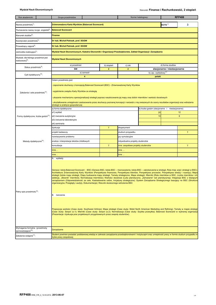 Kierunek: Finanse Wydział Nauk Ekonomicznych Rok akademicki: RFP408 Numer katalogowy: Grupa przedmiotów Nazwa przedmiotu1): i Rachunkowość, 2 stopień 3 ECTS 2) Zrównoważona Karta Wyników (Balanced Scorecard) 3) Tłumaczenie nazwy na jęz. angielski : Balanced Scorecard Kierunek studiów4): Finanse Koordynator przedmiotu5): 6) Prowadzący zajęcia : 7) Dr hab. Michał Pietrzak, prof. SGGW Dr hab. Michał Pietrzak, prof. SGGW Jednostka realizująca : Wydział Nauk Ekonomicznych, Katedra Ekonomiki i Organizacji Przedsiębiorstw, Zakład Organizacji i Zarządzania Wydział, dla którego przedmiot jest realizowany8): Wydział Nauk Ekonomicznych Status przedmiotu9): a) przedmiot b) stopień c) rok d) forma studiów SW 2 2 stacjonarne / niestacjonarne Cykl dydaktyczny10): a) semestr b) Jęz. wykładowy11) 4 polski Celem przedmiotu jest: - zapoznanie słuchaczy z koncepcją Balanced Scorecard (BSC) - Zrównoważonej Karty Wyników Założenia i cele przedmiotu12): - wyjaśnienie związku Karty Wyników ze strategią - ukazanie mechanizmu operacjonalizacji strategii poprzez naszkicowanie jej mapy oraz dobór mierników i wartości docelowych - ukształtowanie umiejętności zastosowania przez słuchaczy poznanej koncepcji i narzedzi z nią zwiazanych do oceny rezultatów organizacji oraz wdrażania strategii w praktyce gospodarczej a) forma dydaktyczna b) liczba godzin (stacjonarne i a1) wykład Formy dydaktyczne, liczba godzin13): a2) ćwiczenia audytoryjne niestacjonarne) 20 12 10 6 a3) ćwiczenia laboratoryjne a4) seminaria dyskusja Metody dydaktyczne14): T eksperyment projekt badawczy studium przypadku rozwiazywanie problemu gry symulacyjne analiza i interpretacja tekstów źródłowych indywidualne projekty studenckie konsultacje T inne: zespołowe projekty studenckie inne… inne … inne… inne … A. T T wykłady Geneza i istota Balanced Scorecard - BSC (Geneza BSC, Istota BSC – równoważenie, Istota BSC – zakotwiczenie w strategii, Rola misji, wizji i strategii w BSC); Architektura Zrównoważonej Karty Wyników (Perspektywa finansowa, Perspektywa klientów, Perspektywa procesów, Perspektywa wiedzy i rozwoju); Mapa strategii (Istota mapy strategii, Etapy budowania mapy strategii, Tematy strategiczne, Mapa strategii); Mierniki (Rola mierników w BSC, Liczba mierników i ich selekcja, „Słownik” mierników, Normalizacja mierników); Wartości docelowe (Luka planistyczna, „Zamykanie” luki planistycznej); Integracja BSC z bieżącym zarządzaniem (Odpowiedzialność za cele, Kaskadowanie celów, Inicjatywy strategiczne); System Zarządzania Strategicznego bazujący na BSC (Struktura organizacyjna, Przeglądy i audyty, Dokumentacja); Warunki skutecznego wdrożenia BSC Pełny opis przedmiotu15): B. ćwiczenia Propozycja wartości (Case study: Southwest Airlines); Mapa strategii (Case study: Mobil North American Marketing and Refining); Tematy w mapie strategii (Case study: Serpol cz.1); Mierniki (Case study: Serpol cz.2); Normalizacja (Case study: Szybka przesyłka); Balanced Scorecard w wybranej organizacji (Prezentacje i dyskusja prac projektowych przygotowanych przez zespoły studentów). Wymagania formalne (przedmioty wprowadzające)16): 17) Założenia wstępne : Zarządzanie Student powinien posiadać podstawową wiedzę w zakresie zarządzania przedsiębiorstwami i instytucajmi oraz umiejetność pracy w formie studium przypadku w trybie pracy zespołowej RFP408 WNE_FiR_2_12.03.2012, 2013-06-07 LW Kierunek: Finanse Wydział Nauk Ekonomicznych 01 - student potrafi objaśnić istotę Zrównoważonej Karty Wyników, wymienić perspektywy z których się ona składa i scharakteryzować kluczowe obszary problemowe w ich ramach 02 - student potrafi wykorzystywać zodbytą wiedzę do zoperacjonalizowania przy pomocy Zrównoważonej Karty Wyników strategii przedsiębiorstwa lub rganizacji w formie mapy strategii i Efekty kształcenia18): (z kolejnymi numerami, 01, 02, 03 itd.) 03 - student potrafi analizować problemy z zakresu Zrównoważonej Karty Wyników, dokonywać ich krytycznej ale i twórczej oceny oraz formułować ich rozwiązania 04 -student posiada umiejętność współpracy z innymi wykazując zdolność do kreatywnej pracy w zespole kolokwium na zajęciach ćwiczeniowych Sposób weryfikacji efektów kształcenia19): 06 - 07 - 08 - ocena wykonanie zadania projektowego na zdefiniowany temat ocena wynikająca z obserwacji w trakcie zajęć ocena eksperymentów wykonywanych w trakcie zajęć przygotowanie zespołowej analizy zdefiniowanego problemu ocena wystąpień i prezentacji w trakcie zajęć obserwacja w trakcie dyskusji zdefiniowanego problemu (aktywność) 01 test komputerowy egzamin ustny inne: zespołowe przygotowanie rozwiązań studiów przypadków prezentowanych na zajęciach inne… inne: zespołowe projekty studenckie okresowe prace pisemne imienne karty oceny studenta złożone projekty inne: treść egzaminów pisemnych inne: arkusz oceny aktywności Element oceny 02, 03, 04 Waga w % inne.. Element oceny Waga w % ocena wykonania zadania projektowego na zdefiniowany temat ocena wynikająca z obserwacji w trakcie zajęć ocena eksperymentów wykonywanych w trakcie zajęć przygotowanie zespołowej analizy zdefiniowanego problemu ocena wystąpień i prezentacji w trakcie zajęć obserwacja w trakcie dyskusji zdefiniowanego problemu (aktywność) 40% test egzamin ustny inne: zespołowe przygotowanie rozwiązań studiów przypadków prezentowanych na zajęciach inne… inne: zespołowe projekty studenckie Miejsce realizacji zajęć22): 02, 03, 04 inne.. praca pisemna przygotowywana w ramach pracy własnej studenta egzamin pisemny 03, 04 treść pytań egzaminacyjnych z oceną 01 kolokwium na zajęciach ćwiczeniowych Elementy i wagi mające wpływ na ocenę końcową21): 05 - praca pisemna przygotowywana w ramach pracy własnej studenta egzamin pisemny Forma dokumentacji osiągniętych efektów kształcenia 20): i Rachunkowość, 2 stopień 20% 40%
