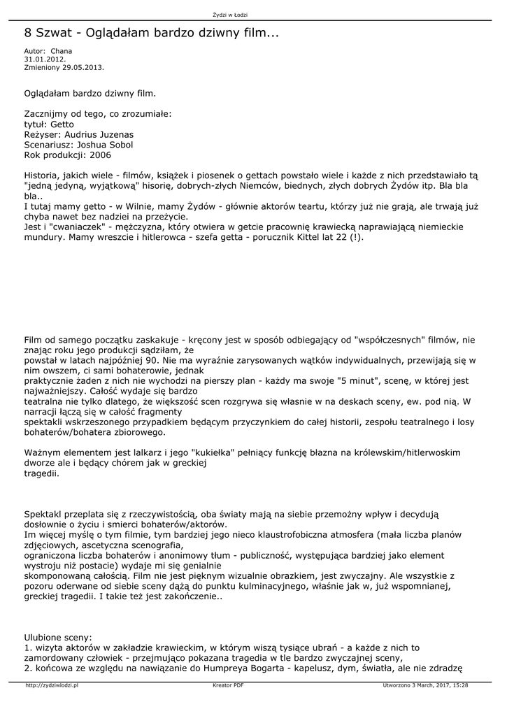 Żydzi w Łodzi 8 Szwat - Oglądałam bardzo dziwny film... Autor: Chana 31.01.2012. Zmieniony 29.05.2013. Oglądałam bardzo dziwny film. Zacznijmy od tego, co zrozumiałe: tytuł: Getto Reżyser: Audrius Juzenas Scenariusz: Joshua Sobol Rok produkcji: 2006 Historia, jakich wiele - filmów, książek i piosenek o gettach powstało wiele i każde z nich przedstawiało tą "jedną jedyną, wyjątkową" hisorię, dobrych-złych Niemców, biednych, złych dobrych Żydów itp. Bla bla bla.. I tutaj mamy getto - w Wilnie, mamy Żydów - głównie aktorów teartu, którzy już nie grają, ale trwają już chyba nawet bez nadziei na przeżycie. Jest i "cwaniaczek" - mężczyzna, który otwiera w getcie pracownię krawiecką naprawiającą niemieckie mundury. Mamy wreszcie i hitlerowca - szefa getta - porucznik Kittel lat 22 (!). Film od samego początku zaskakuje - kręcony jest w sposób odbiegający od "współczesnych" filmów, nie znając roku jego produkcji sądziłam, że powstał w latach najpóźniej 90. Nie ma wyraźnie zarysowanych wątków indywidualnych, przewijają się w nim owszem, ci sami bohaterowie, jednak praktycznie żaden z nich nie wychodzi na pierszy plan - każdy ma swoje "5 minut", scenę, w której jest najważniejszy. Całość wydaje się bardzo teatralna nie tylko dlatego, że większość scen rozgrywa się własnie w na deskach sceny, ew. pod nią. W narracji łączą się w całość fragmenty spektakli wskrzeszonego przypadkiem będącym przyczynkiem do całej historii, zespołu teatralnego i losy bohaterów/bohatera zbiorowego. Ważnym elementem jest lalkarz i jego "kukiełka" pełniący funkcję błazna na królewskim/hitlerwoskim dworze ale i będący chórem jak w greckiej tragedii. Spektakl przeplata się z rzeczywistością, oba światy mają na siebie przemożny wpływ i decydują dosłownie o życiu i smierci bohaterów/aktorów. Im więcej myślę o tym filmie, tym bardziej jego nieco klaustrofobiczna atmosfera (mała liczba planów zdjęciowych, ascetyczna scenografia, ograniczona liczba bohaterów i anonimowy tłum - publiczność, występująca bardziej jako element wystroju niż postacie) wydaje mi się genialnie skomponowaną całością. Film nie jest pięknym wizualnie obrazkiem, jest zwyczajny. Ale wszystkie z pozoru oderwane od siebie sceny dążą do punktu kulminacyjnego, właśnie jak w, już wspomnianej, greckiej tragedii. I takie też jest zakończenie.. Ulubione sceny: 1. wizyta aktorów w zakładzie krawieckim, w którym wiszą tysiące ubrań - a każde z nich to zamordowany człowiek - przejmująco pokazana tragedia w tle bardzo zwyczajnej sceny, 2. końcowa ze względu na nawiązanie do Humpreya Bogarta - kapelusz, dym, światła, ale nie zdradzę http://zydziwlodzi.pl Kreator PDF Utworzono 3 March, 2017, 15:28 Żydzi w Łodzi szczeółow - obejrzyjcie! http://zydziwlodzi.pl Kreator PDF Utworzono 3 March, 2017, 15:28
