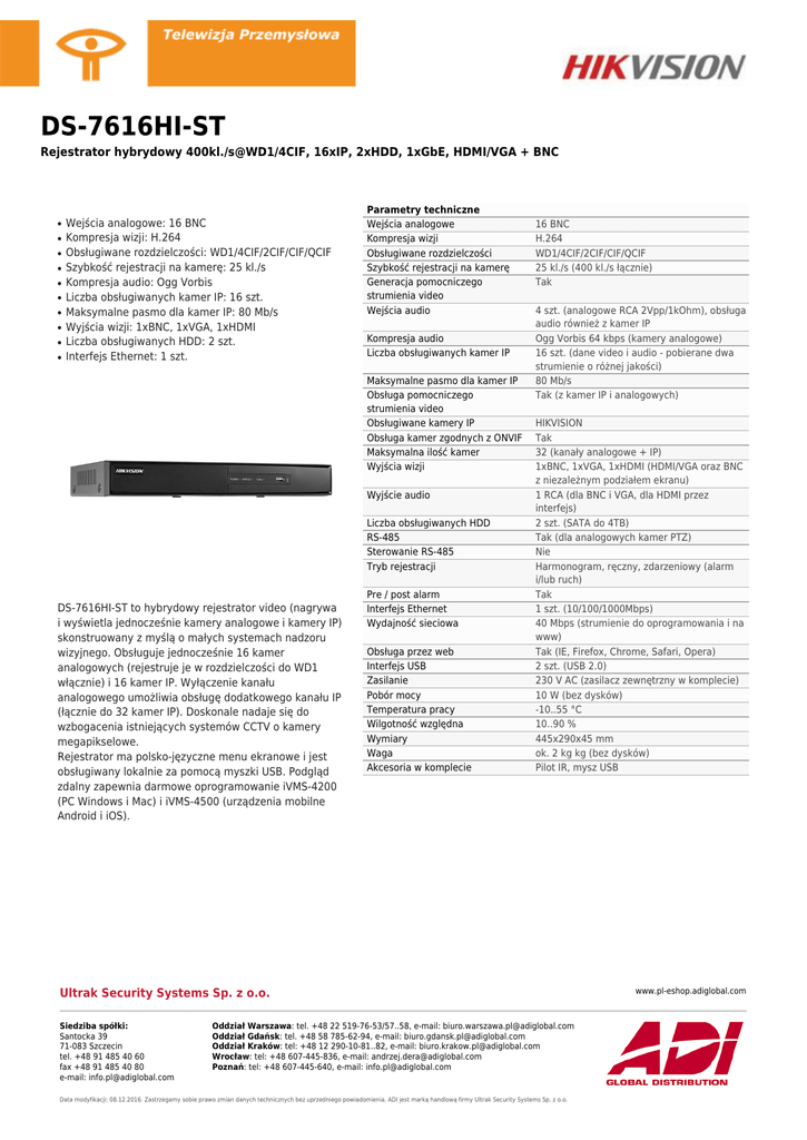 DS-7616HI-ST Rejestrator hybrydowy 400kl./s@WD1/4CIF, 16xIP, 2xHDD, 1xGbE, HDMI/VGA + BNC ● ● ● ● ● ● ● ● ● ● Wejścia analogowe: 16 BNC Kompresja wizji: H.264 Obsługiwane rozdzielczości: WD1/4CIF/2CIF/CIF/QCIF Szybkość rejestracji na kamerę: 25 kl./s Kompresja audio: Ogg Vorbis Liczba obsługiwanych kamer IP: 16 szt. Maksymalne pasmo dla kamer IP: 80 Mb/s Wyjścia wizji: 1xBNC, 1xVGA, 1xHDMI Liczba obsługiwanych HDD: 2 szt. Interfejs Ethernet: 1 szt. Parametry techniczne Wejścia analogowe Kompresja wizji Obsługiwane rozdzielczości Szybkość rejestracji na kamerę Generacja pomocniczego strumienia video Wejścia audio Kompresja audio Liczba obsługiwanych kamer IP Maksymalne pasmo dla kamer IP Obsługa pomocniczego strumienia video Obsługiwane kamery IP Obsługa kamer zgodnych z ONVIF Maksymalna ilość kamer Wyjścia wizji Wyjście audio Liczba obsługiwanych HDD RS-485 Sterowanie RS-485 Tryb rejestracji DS-7616HI-ST to hybrydowy rejestrator video (nagrywa i wyświetla jednocześnie kamery analogowe i kamery IP) skonstruowany z myślą o małych systemach nadzoru wizyjnego. Obsługuje jednocześnie 16 kamer analogowych (rejestruje je w rozdzielczości do WD1 włącznie) i 16 kamer IP. Wyłączenie kanału analogowego umożliwia obsługę dodatkowego kanału IP (łącznie do 32 kamer IP). Doskonale nadaje się do wzbogacenia istniejących systemów CCTV o kamery megapikselowe. Rejestrator ma polsko-języczne menu ekranowe i jest obsługiwany lokalnie za pomocą myszki USB. Podgląd zdalny zapewnia darmowe oprogramowanie iVMS-4200 (PC Windows i Mac) i iVMS-4500 (urządzenia mobilne Android i iOS). Pre / post alarm Interfejs Ethernet Wydajność sieciowa Obsługa przez web Interfejs USB Zasilanie Pobór mocy Temperatura pracy Wilgotność względna Wymiary Waga Akcesoria w komplecie 16 BNC H.264 WD1/4CIF/2CIF/CIF/QCIF 25 kl./s (400 kl./s łącznie) Tak 4 szt. (analogowe RCA 2Vpp/1kOhm), obsługa audio również z kamer IP Ogg Vorbis 64 kbps (kamery analogowe) 16 szt. (dane video i audio - pobierane dwa strumienie o różnej jakości) 80 Mb/s Tak (z kamer IP i analogowych) HIKVISION Tak 32 (kanały analogowe + IP) 1xBNC, 1xVGA, 1xHDMI (HDMI/VGA oraz BNC z niezależnym podziałem ekranu) 1 RCA (dla BNC i VGA, dla HDMI przez interfejs) 2 szt. (SATA do 4TB) Tak (dla analogowych kamer PTZ) Nie Harmonogram, ręczny, zdarzeniowy (alarm i/lub ruch) Tak 1 szt. (10/100/1000Mbps) 40 Mbps (strumienie do oprogramowania i na www) Tak (IE, Firefox, Chrome, Safari, Opera) 2 szt. (USB 2.0) 230 V AC (zasilacz zewnętrzny w komplecie) 10 W (bez dysków) -10..55 °C 10..90 % 445x290x45 mm ok. 2 kg kg (bez dysków) Pilot IR, mysz USB Ultrak Security Systems Sp. z o.o. Siedziba spółki: Santocka 39 71-083 Szczecin tel. +48 91 485 40 60 fax +48 91 485 40 80 e-mail: [email protected] Oddział Warszawa: tel. +48 22 519-76-53/57..58, e-mail: [email protected] Oddział Gdańsk: tel. +48 58 785-62-94, e-mail: [email protected] Oddział Kraków: tel: +48 12 290-10-81..82, e-mail: [email protected] Wrocław: tel: +48 607-445-836, e-mail: [email protected] Poznań: tel: +48 607-445-640, e-mail: [email protected] Data modyfikacji: 08.12.2016. Zastrzegamy sobie prawo zmian danych technicznych bez uprzedniego powiadomienia. ADI jest marką handlową firmy Ultrak Security Systems Sp. z o.o. www.pl-eshop.adiglobal.com