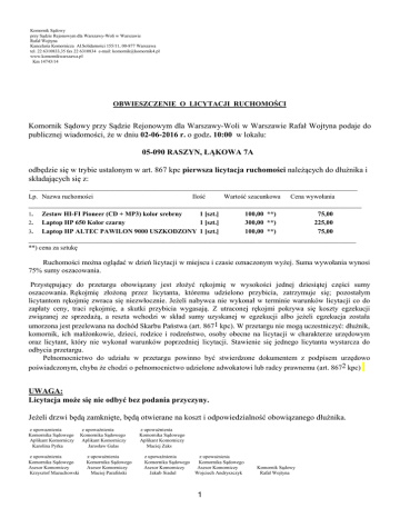 Komornik Sądowy przy Sądzie Rejonowym dla Warszawy-Woli w Warszawie Rafał Wojtyna Kancelaria Komornicza Al.Solidarności 155/11, 00-877 Warszawa tel. 22 6310833,35 fax 22 6310834 e-mail: [email protected] www.komornikwarszawa.pl Km 14743/14 OBWIESZCZENIE O LICYTACJI RUCHOMOŚCI Komornik Sądowy przy Sądzie Rejonowym dla Warszawy-Woli w Warszawie Rafał Wojtyna podaje do publicznej wiadomości, że w dniu 02-06-2016 r. o godz. 10:00 w lokalu: 05-090 RASZYN, ŁĄKOWA 7A odbędzie się w trybie ustalonym w art. 867 kpc pierwsza licytacja ruchomości należących do dłużnika i składających się z: _______________________________________________________________________________________________________________________ Lp. Nazwa ruchomości Ilość Wartość szacunkowa Cena wywołania _________________________________________________________________________________________________________________________ 1. 2. 3. Zestaw HI-FI Pioneer (CD + MP3) kolor srebrny 1 [szt.] Laptop HP 650 Kolor czarny 1 [szt.] Laptop HP ALTEC PAWILON 9000 USZKODZONY 1 [szt.] 100,00 **) 300,00 **) 100,00 **) 75,00 225,00 75,00 _______________________________________________________________________________________________________________________ **) cena za sztukę Ruchomości można oglądać w dzień licytacji w miejscu i czasie oznaczonym wyżej. Suma wywołania wynosi 75% sumy oszacowania. Przystępujący do przetargu obowiązany jest złożyć rękojmię w wysokości jednej dziesiątej części sumy oszacowania. Rękojmię złożoną przez licytanta, któremu udzielono przybicia, zatrzymuje się; pozostałym licytantom rękojmię zwraca się niezwłocznie. Jeżeli nabywca nie wykonał w terminie warunków licytacji co do zapłaty ceny, traci rękojmię, a skutki przybicia wygasają. Z utraconej rękojmi pokrywa się koszty egzekucji związanej ze sprzedażą, a reszta wchodzi w skład sumy uzyskanej w egzekucji albo jeżeli egzekucja została umorzona jest przelewana na dochód Skarbu Państwa (art. 8671 kpc). W przetargu nie mogą uczestniczyć: dłużnik, komornik, ich małżonkowie, dzieci, rodzice i rodzeństwo, osoby obecne na licytacji w charakterze urzędowym oraz licytant, który nie wykonał warunków poprzedniej licytacji. Stawienie się jednego licytanta wystarcza do odbycia przetargu. Pełnomocnictwo do udziału w przetargu powinno być stwierdzone dokumentem z podpisem urzędowo poświadczonym, chyba że chodzi o pełnomocnictwo udzielone adwokatowi lub radcy prawnemu (art. 8672 kpc) UWAGA: Licytacja może się nie odbyć bez podania przyczyny. Jeżeli drzwi będą zamknięte, będą otwierane na koszt i odpowiedzialność obowiązanego dłużnika. z upowaznienia Komornika Sądowego Aplikant Komorniczy Karolina Pyrka z upoważnienia Komornika Sądowego Asesor Komorniczy Krzysztof Mazuchowski z upoważnienia Komornika Sądowego Aplikant Komorniczy Jarosław Galas z upoważnienia Komornika Sądowego Asesor Komorniczy Maciej Parafiński z upoważnienia Komornika Sądowego Aplikant Komorniczy Maciej Zaks z upoważnienia z upoważnienia Komornika Sądowego Komornika Sądowego Asesor Komorniczy Asesor Komorniczy Jakub Siadul Wojciech Andryszczyk 1 Komornik Sądowy Rafał Wojtyna