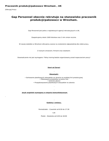 Pracownik produkcji/pakowacz Wrexham , UK [Oferuję] Praca Gap Personnel obecnie rekrutuje na stanowisko pracownik produkcji/pakowacz w Wrexham. Gap Personnel jest jedna z najwiekszych agencji rekrutacyjnych w UK, Zaopatrujemy okolo 1500 klientow oraz 2 mln zmian rocznie. W naszej siedzibie w Wrexham oferujemy szanse na znalezienie odpowiedniej dla ciebie pracy, Z roznymi zmianami, firmami oraz stawkami. Doswiadczenie nie jest wymagane ! Pelny trening bedzie organizowany przed rozpoczeciem pracy! Start od Zaraz! Obowiązki: • Sortowanie plastikowych wieszaków na ubrania na szybkiej linii produkcyjnej. • Paletowanie produktów na końcu linii • kontrola jakosci • Przepakowywanie plastikowych wieszaków na ubrania Jezyk angielski wymagany w stopniu komunikatywnym Godziny I zmiany: Poniedzialek – Czwartek od 6:50 do 17:30 Lub Piatek – Niedziela od 6:00 do 18:00 Informacje dodatkowe Brak Adres ogłoszenia http://www.superoferty24.pl/pracownik-produkcji-pakowacz-wrexham-uk,o226 Kontakt Mail: [email protected] Telefon: Lokalizacja , - (Polska) Ogłoszenie dodano: 2016-09-22 12:32:40 Ogłoszenie wygasa: 2026-06-22 12:32:40 Powered by TCPDF (www.tcpdf.org)