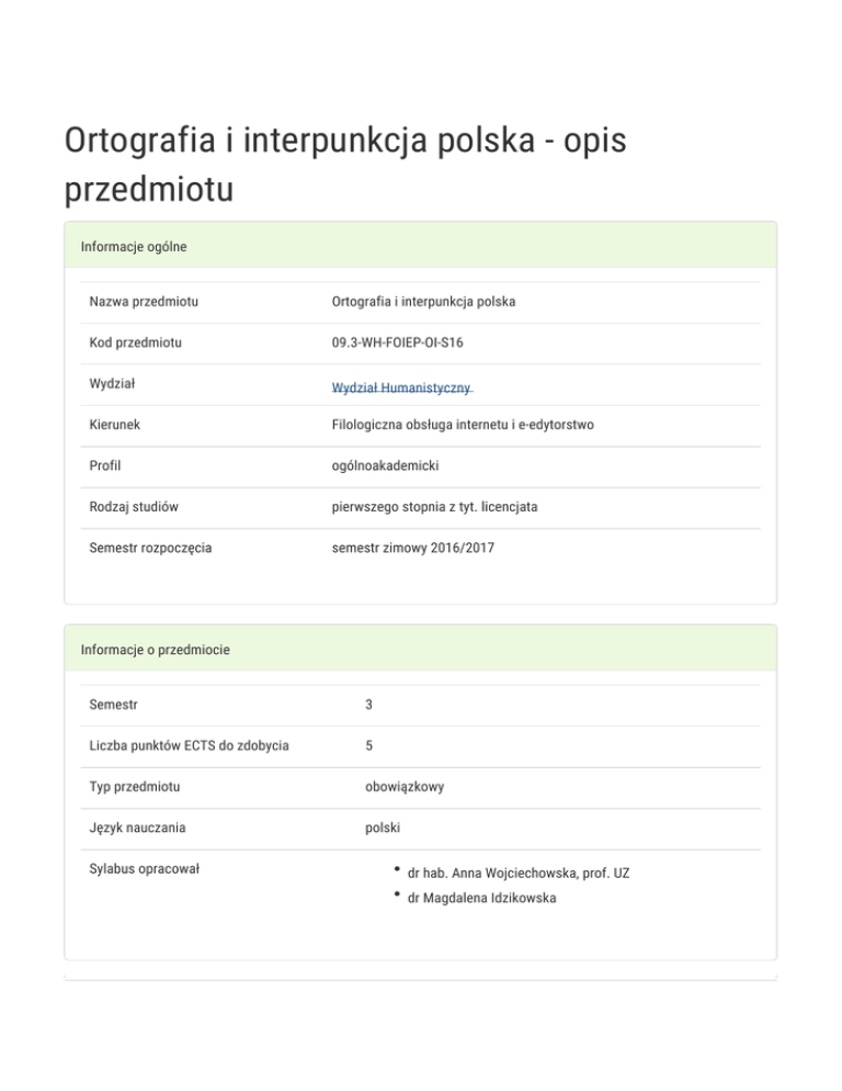 Ortografia i interpunkcja polska - opis przedmiotu Informacje ogólne Nazwa przedmiotu Ortografia i interpunkcja polska Kod przedmiotu 09.3-WH-FOIEP-OI-S16 Wydział Wydział Humanistyczny Kierunek Filologiczna obsługa internetu i e-edytorstwo Profil ogólnoakademicki Rodzaj studiów pierwszego stopnia z tyt. licencjata Semestr rozpoczęcia semestr zimowy 2016/2017 Informacje o przedmiocie Semestr 3 Liczba punktów ECTS do zdobycia 5 Typ przedmiotu obowiązkowy Język nauczania polski Sylabus opracował dr hab. Anna Wojciechowska, prof. UZ dr Magdalena Idzikowska Formy zajęć Forma Liczba godzin w Liczba godzin w Liczba godzin w Liczba godzin w Forma zajęć semestrze tygodniu semestrze tygodniu zaliczenia (stacjonarne) (stacjonarne) (niestacjonarne) (niestacjonarne) 30 2 - - Ćwiczenia Egzamin Cel przedmiotu Kształcenie świadomości językowej studentów w zakresie poprawnego stosowania zasad ortografii i interpunkcji. Wymagania wstępne brak Zakres tematyczny Specyfika polskiej ortografii. Słowniki ortograficzne jako źródła wskazówek poprawnościowych. Wielkie i małe litery. Pisownia łączna lub rozdzielna. Użycie łącznika. Zasady dzielenia wyrazów. Skróty i skrótowce. Nazwy własne (nazwiska, nazwy geograficzne). Znaki interpunkcyjne i graficzne. Interpunkcja a znaczenie. Niejednolitość i wariantywność pisowni polskiej. Współczesne tendencje w zakresie pisowni. Kodyfikacja polskiej ortografii. Metody kształcenia opis wyjaśniający, opis klasyfikujący; prezentacja; warsztaty grupowe, dyskusja, konsultacje Efekty kształcenia i metody weryfikacji osiągania efektów kształcenia Opis efektu Symbole efektów Metody weryfikacji Forma zajęć Opis efektu student ma uporządkowaną wiedzę Symbole efektów KEE1_W05 Metody weryfikacji aktywność w trakcie szczegółową z zakresu prawideł zajęć rządzących stosowaniem poprawnej, odpowiedź ustna komunikatywnej polszczyzny wypowiedź pisemna Forma zajęć Ćwiczenia egzamin student ma świadomość KEE1_W15 obserwacja i ocena kompleksowej natury języka oraz jego aktywności na złożoności i historycznej zmienności zajęciach jego znaczeń egzamin student potrafi przeprowadzić redakcję KEE1_U03 aktywność w trakcie językową tekstu przygotowywanego do zajęć publikacji egzamin - ustny, Ćwiczenia Ćwiczenia opisowy, testowy i inne obserwacje i ocena umiejętności praktycznych studenta test student zna zakres posiadanej przez siebie wiedzy i posiadanych KEE1_K01 aktywność w trakcie Ćwiczenia zajęć umiejętności, rozumie potrzebę ciągłego dokształcania się i rozwoju zawodowego Warunki zaliczenia Aktywny udział w zajęciach, przygotowanie, pozytywne oceny ze sprawdzianów, zdanie egzaminu końcowego. Obciążenie pracą Obciążenie pracą Studia Studia niestacjonarne stacjonarne (w godz.) (w godz.) Godziny kontaktowe (udział w zajęciach; konsultacjach; egzaminie, itp.) 45 - Samodzielna praca studenta (przygotowanie do: zajęć, kolokwium, 80 - Łącznie 125 - Punkty ECTS Studia Studia niestacjonarne egzaminu; studiowanie literatury przygotowanie: pracy pisemnej, projektu, prezentacji, raportu, wystąpienia; itp.) stacjonarne Zajęcia z udziałem nauczyciela akademickiego 2 - Zajęcia bez udziału nauczyciela akademickiego 3 - Łącznie 5 - Literatura podstawowa Wielki słownik ortograficzny PWN z zasadami pisowni i interpunkcji, red. E. Polańskiego, Warszawa 2016. Literatura uzupełniająca 1. Formy i normy, czyli poprawna polszczyzna w praktyce, red. K. Kłosińska, Warszawa 2016. 2. T. Karpowicz, Kultura języka polskiego, Wymowa, ortografia, interpunkcja, Warszawa 2016. 3. J. Podracki, Słownik interpunkcyjny języka polskiego z zasadmi przestankowania, Warszawa 1999. 4. E. Polański, Reformy ortografii polskiej – wczoraj, dziś, jutro, BPTJ LX, 2004, s. 29-46, także: http://www.mimuw.edu.pl/polszczyzna/PTJ/b/b60_029-046.pdf 5. Dyktanda Uniwersyteckie, http://www.marian.bugajski.com.pl/ 6. Uchwały ortograficzne Rady Języka Polskiego, http://rjp.pan.pl/ 7. Zasady pisowni i interpunkcji, http://sjp.pwn.pl/zasady Uwagi brak Zmodyfikowane przez dr Tomasz Ratajczak (ostatnia modyfikacja: 06-09-2016 07:56)