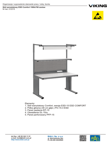 Organizacja i wyposażenie stanowisk pracy / stoły, biurka Stół warsztatowy ESD Comfort 1500x700 zestaw Nr kat. 212315 Elementy: 1. Stół warsztatowy Comfort, wersja ESD-15 ESD COMFORT 2. Półka główna (30 cm głęb.) PO-15-3 ESD 3. Panel zasilania EP-15 4. Oświetlenie DL-15/a 5. Panel perforowany PFP-15 tel./fax: +48 58 322 11 91 e-mail: [email protected] http://www.biall.com.pl BIALL Sp. z o.o. ul. Barniewicka 54c PL 80-299 GDAŃSK