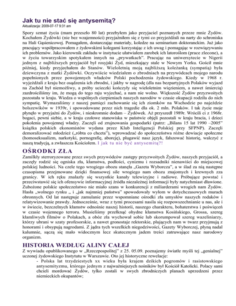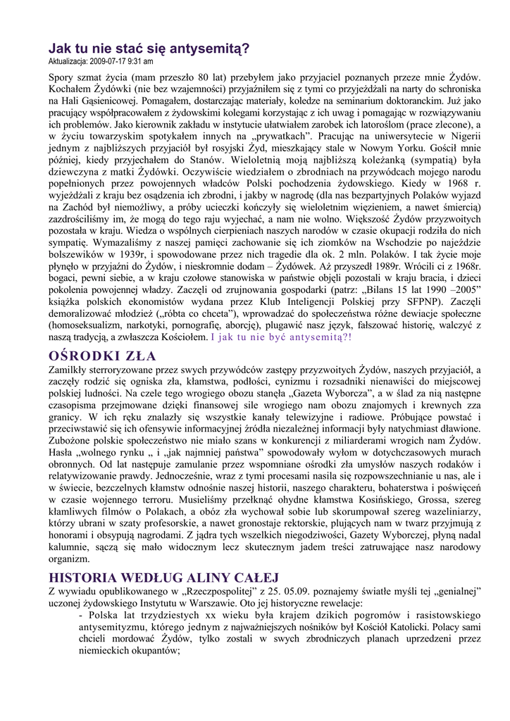 Jak tu nie stać się antysemitą? Aktualizacja: 2009-07-17 9:31 am Spory szmat życia (mam przeszło 80 lat) przebyłem jako przyjaciel poznanych przeze mnie Żydów. Kochałem Żydówki (nie bez wzajemności) przyjaźniłem się z tymi co przyjeżdżali na narty do schroniska na Hali Gąsienicowej. Pomagałem, dostarczając materiały, koledze na seminarium doktoranckim. Już jako pracujący współpracowałem z żydowskimi kolegami korzystając z ich uwag i pomagając w rozwiązywaniu ich problemów. Jako kierownik zakładu w instytucie ułatwiałem zarobek ich latoroślom (prace zlecone), a w życiu towarzyskim spotykałem innych na „prywatkach”. Pracując na uniwersytecie w Nigerii jednym z najbliższych przyjaciół był rosyjski Żyd, mieszkający stale w Nowym Yorku. Gościł mnie później, kiedy przyjechałem do Stanów. Wieloletnią moją najbliższą koleżanką (sympatią) była dziewczyna z matki Żydówki. Oczywiście wiedziałem o zbrodniach na przywódcach mojego narodu popełnionych przez powojennych władców Polski pochodzenia żydowskiego. Kiedy w 1968 r. wyjeżdżali z kraju bez osądzenia ich zbrodni, i jakby w nagrodę (dla nas bezpartyjnych Polaków wyjazd na Zachód był niemożliwy, a próby ucieczki kończyły się wieloletnim więzieniem, a nawet śmiercią) zazdrościliśmy im, że mogą do tego raju wyjechać, a nam nie wolno. Większość Żydów przyzwoitych pozostała w kraju. Wiedza o wspólnych cierpieniach naszych narodów w czasie okupacji rodziła do nich sympatię. Wymazaliśmy z naszej pamięci zachowanie się ich ziomków na Wschodzie po najeździe bolszewików w 1939r, i spowodowane przez nich tragedie dla ok. 2 mln. Polaków. I tak życie moje płynęło w przyjaźni do Żydów, i nieskromnie dodam – Żydówek. Aż przyszedł 1989r. Wrócili ci z 1968r. bogaci, pewni siebie, a w kraju czołowe stanowiska w państwie objęli pozostali w kraju bracia, i dzieci pokolenia powojennej władzy. Zaczęli od zrujnowania gospodarki (patrz: „Bilans 15 lat 1990 –2005” książka polskich ekonomistów wydana przez Klub Inteligencji Polskiej przy SFPNP). Zaczęli demoralizować młodzież („róbta co chceta”), wprowadzać do społeczeństwa różne dewiacje społeczne (homoseksualizm, narkotyki, pornografię, aborcję), plugawić nasz język, fałszować historię, walczyć z naszą tradycją, a zwłaszcza Kościołem. I jak tu nie być antysemitą?! OŚRODKI ZŁA Zamilkły sterroryzowane przez swych przywódców zastępy przyzwoitych Żydów, naszych przyjaciół, a zaczęły rodzić się ogniska zła, kłamstwa, podłości, cynizmu i rozsadniki nienawiści do miejscowej polskiej ludności. Na czele tego wrogiego obozu stanęła „Gazeta Wyborcza”, a w ślad za nią następne czasopisma przejmowane dzięki finansowej sile wrogiego nam obozu znajomych i krewnych zza granicy. W ich ręku znalazły się wszystkie kanały telewizyjne i radiowe. Próbujące powstać i przeciwstawić się ich ofensywie informacyjnej źródła niezależnej informacji były natychmiast dławione. Zubożone polskie społeczeństwo nie miało szans w konkurencji z miliarderami wrogich nam Żydów. Hasła „wolnego rynku „ i „jak najmniej państwa” spowodowały wyłom w dotychczasowych murach obronnych. Od lat następuje zamulanie przez wspomniane ośrodki zła umysłów naszych rodaków i relatywizowanie prawdy. Jednocześnie, wraz z tymi procesami nasila się rozpowszechnianie u nas, ale i w świecie, bezczelnych kłamstw odnośnie naszej historii, naszego charakteru, bohaterstwa i poświęceń w czasie wojennego terroru. Musieliśmy przełknąć ohydne kłamstwa Kosińskiego, Grossa, szereg kłamliwych filmów o Polakach, a obóz zła wychował sobie lub skorumpował szereg wazeliniarzy, którzy ubrani w szaty profesorskie, a nawet gronostaje rektorskie, plujących nam w twarz przyjmują z honorami i obsypują nagrodami. Z jądra tych wszelkich niegodziwości, Gazety Wyborczej, płyną nadal kalumnie, sączą się mało widocznym lecz skutecznym jadem treści zatruwające nasz narodowy organizm. HISTORIA WEDŁUG ALINY CAŁEJ Z wywiadu opublikowanego w „Rzeczpospolitej” z 25. 05.09. poznajemy światłe myśli tej „genialnej” uczonej żydowskiego Instytutu w Warszawie. Oto jej historyczne rewelacje: - Polska lat trzydziestych xx wieku była krajem dzikich pogromów i rasistowskiego antysemityzmu, którego jednym z najważniejszych nośników był Kościół Katolicki. Polacy sami chcieli mordować Żydów, tylko zostali w swych zbrodniczych planach uprzedzeni przez niemieckich okupantów; - Polacy są współodpowiedzialni za wymordowanie 3 mln. Żydów; - ONR zaproponował to, co potem zrobili Niemcy; – Na uwagę dziennikarza, że jeden donosiciel ze wsi mógł stanowić potencjalne zagrożenie dla wszystkich jej mieszkańców A. Cała powiedziała: a ja myślę, że to świadczy o kondycji moralnej tego społeczeństwa (za jednego szubrawca moralna odpowiedzialność zbiorowa). – Jeśli ma pan wrażliwość naprawdę, a nie wrażliwość nacjonalistyczną, nie powinien pan się obrażać. Inaczej: tylko ja ma prawdę, jeśli się z nią nie zgadzacie to jesteście nacjonalistami). Jakie nauki zaczerpnąłem z tych „genialnych” wypowiedzi? Zaczynając od końca: – Albo przyjmuję wypowiedź A. Całej za prawdę, albo mam inną wrażliwość, czyli jestem nacjonalistą. (Posłużę się tym rozumowaniem niżej). Wystarczy, że we wsi jest jeden donosiciel, a wszyscy mieszkańcy tej wsi są odpowiedzialni za skutki jego donosicielstwa. Czyli, wystarczy, że A. Cała mówi głupstwa, a wszyscy jej ziomkowie są za nią odpowiedzialni. Jeśli brat Michnika skazywał na śmierć Polaków, to wszyscy jego rodacy chcą Polaków uśmiercać. Jeśli ONR (ugrupowanie bez mocy sprawczej) proponowała Żydom emigrację, to to samo co ich mordowanie (nie pomysł, lecz rzeczywistość) przez Niemców. Postawienie znaku równości między pomysłem migrac