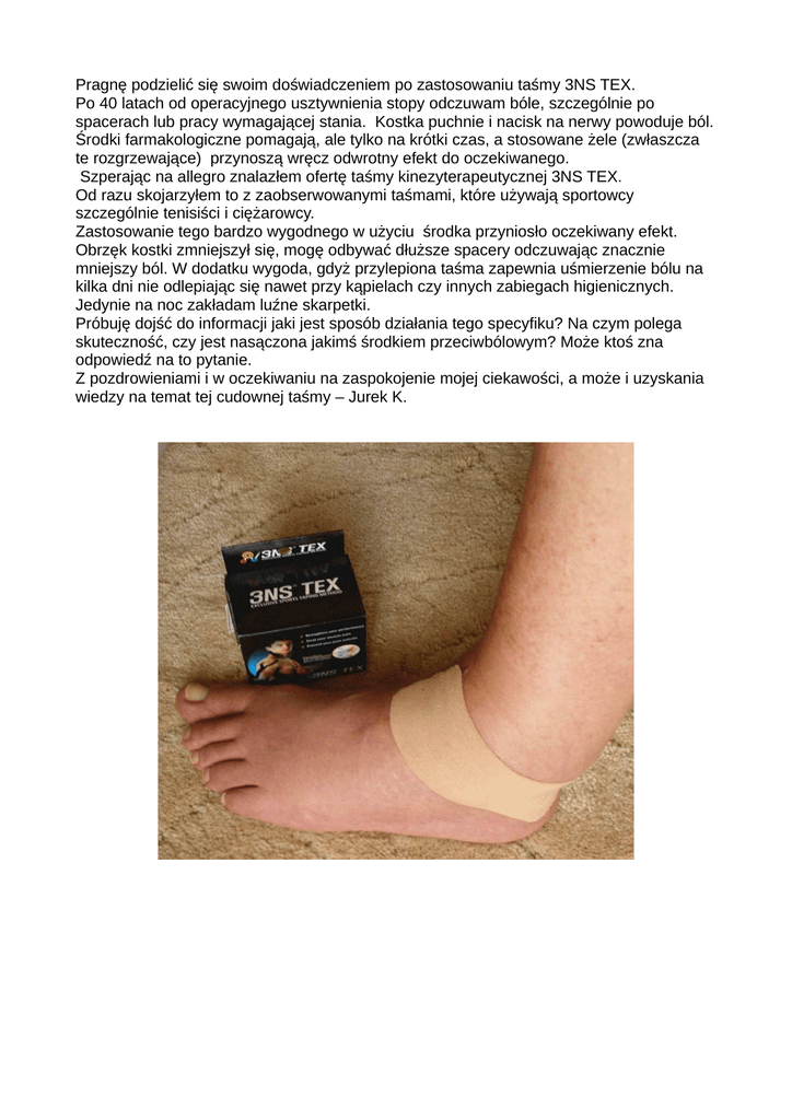 Pragnę podzielić się swoim doświadczeniem po zastosowaniu taśmy 3NS TEX. Po 40 latach od operacyjnego usztywnienia stopy odczuwam bóle, szczególnie po spacerach lub pracy wymagającej stania. Kostka puchnie i nacisk na nerwy powoduje ból. Środki farmakologiczne pomagają, ale tylko na krótki czas, a stosowane żele (zwłaszcza te rozgrzewające) przynoszą wręcz odwrotny efekt do oczekiwanego. Szperając na allegro znalazłem ofertę taśmy kinezyterapeutycznej 3NS TEX. Od razu skojarzyłem to z zaobserwowanymi taśmami, które używają sportowcy szczególnie tenisiści i ciężarowcy. Zastosowanie tego bardzo wygodnego w użyciu środka przyniosło oczekiwany efekt. Obrzęk kostki zmniejszył się, mogę odbywać dłuższe spacery odczuwając znacznie mniejszy ból. W dodatku wygoda, gdyż przylepiona taśma zapewnia uśmierzenie bólu na kilka dni nie odlepiając się nawet przy kąpielach czy innych zabiegach higienicznych. Jedynie na noc zakładam luźne skarpetki. Próbuję dojść do informacji jaki jest sposób działania tego specyfiku? Na czym polega skuteczność, czy jest nasączona jakimś środkiem przeciwbólowym? Może ktoś zna odpowiedź na to pytanie. Z pozdrowieniami i w oczekiwaniu na zaspokojenie mojej ciekawości, a może i uzyskania wiedzy na temat tej cudownej taśmy – Jurek K.