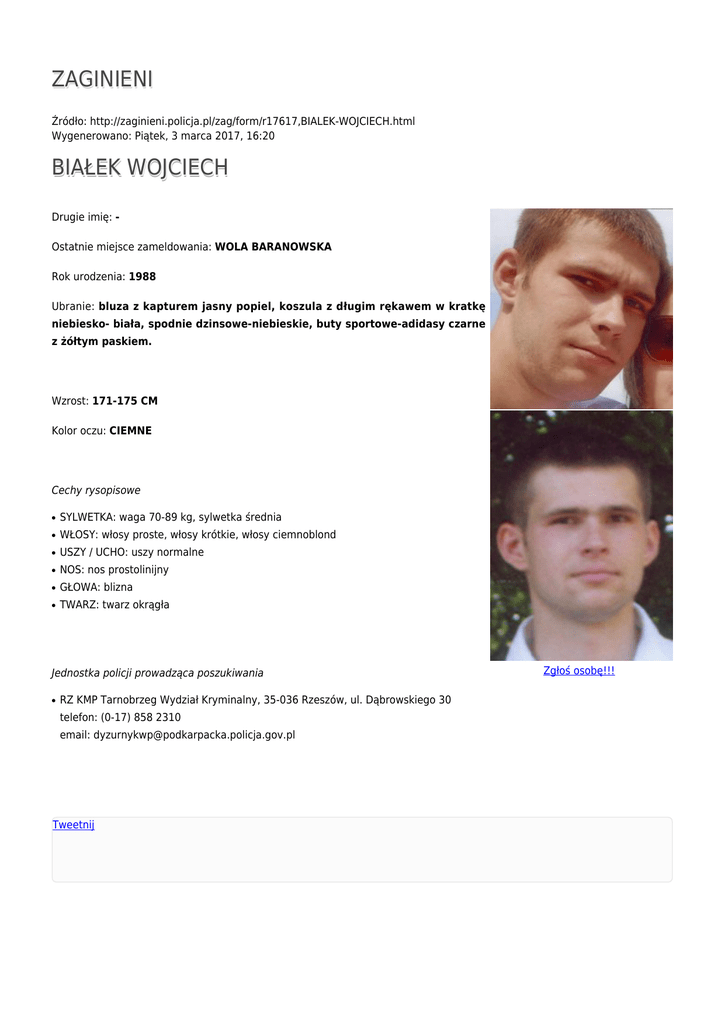 ZAGINIENI Źródło: http://zaginieni.policja.pl/zag/form/r17617,BIALEK-WOJCIECH.html Wygenerowano: Piątek, 3 marca 2017, 16:20 BIAŁEK WOJCIECH Drugie imię: Ostatnie miejsce zameldowania: WOLA BARANOWSKA Rok urodzenia: 1988 Ubranie: bluza z kapturem jasny popiel, koszula z długim rękawem w kratkę niebiesko- biała, spodnie dzinsowe-niebieskie, buty sportowe-adidasy czarne z żółtym paskiem. Wzrost: 171-175 CM Kolor oczu: CIEMNE Cechy rysopisowe ● SYLWETKA: waga 70-89 kg, sylwetka średnia ● WŁOSY: włosy proste, włosy krótkie, włosy ciemnoblond ● USZY / UCHO: uszy normalne ● NOS: nos prostolinijny ● GŁOWA: blizna ● TWARZ: twarz okrągła Jednostka policji prowadząca poszukiwania ● RZ KMP Tarnobrzeg Wydział Kryminalny, 35-036 Rzeszów, ul. Dąbrowskiego 30 telefon: (0-17) 858 2310 email: [email protected] Tweetnij Zgłoś osobę!!!
