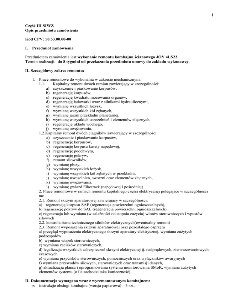 1 Część III SIWZ Opis przedmiotu zamówienia Kod CPV: 50.53.00.00-00 I. Przedmiot zamówienia Przedmiotem zamówienia jest wykonanie remontu kombajnu ścianowego JOY 4LS22. Termin realizacji: do 8 tygodni od przekazania przedmiotu umowy do zakładu wykonawcy. II. Szczegółowy zakres remontu: 1. Prace remontowe do wykonania w zakresie mechanicznym: 1.1. Kapitalny remont dwóch ramion zawierający w szczególności: a) czyszczenie i piaskowanie korpusów, b) regenerację korpusów, c) regenerację kwadratu mocowania organów, d) regenerację ładowarki wraz z silnikami hydraulicznymi, e) wymianę wszystkich łożysk, f) wymianę wszystkich kół zębatych, g) wymianę jarzm przekładni planetarnej, h) wymianę wszystkich uszczelnień i elementów złącznych, i) regenerację układu wodnego, j) wymianę owężowania. 1.2.Kapitalny remont dwóch ciągników zawierający w szczególności: a) czyszczenie i piaskowanie korpusów, b) regenerację korpusów, c) regenerację korpusu kasety napędowej, d) regenerację podchwytu, e) regenerację pokryw, f) remont siłowników, g) wymianę płozy, h) wymianę wszystkich łożysk, i) wymianę wszystkich kół zębatych w przekładni, j) wymianę uszczelnień, sworzni oraz elementów złącznych, k) wymianę owężowania, l) wymianę gwiazd Eikotrack (napędowej i pośredniej). 2. Prace remontowe w ramach remontu kapitalnego części elektrycznej polegające w szczególności na: 2.1. Remont skrzyni aparaturowej zawierający w szczególności: a) regenerację korpusu SAE (regeneracja powierzchni ognioszczelnych), b) regenerację pokryw do SAE (regeneracja powierzchni ognioszczelnych). c) regeneracja lub wymiana (w zależności od stopnia zużycia) wlotów sterowniczych i wpustów siłowych 2.2. kontrola stanu technicznego silników elektrycznych(ewentualny remont) 2.3. Remont wyposażenia skrzyni aparaturowej oraz pozostałego osprzętu a) przegląd wyposażenia elektrycznego skrzyni aparatury elektrycznej, wymiana zużytych podzespołów b) wymiana wiązek sterowniczych, c) wymiana zacisków sterowniczych, d) legalizacja wszystkich zabezpieczeń skrzyni elektrycznej tj. nadprądowych, ziemnozwarciowych, czasowych e) wymiana przycisków sterowniczych, pomocniczych oraz wyłączników awaryjnych f) wymiana przewodów siłowych, sterowniczych oraz transmisji danych, g) aktualizacja plansz i oprogramowania systemu monitorowania SMoK, wymiana zużytych elementów systemu (o ile zachodzi taka konieczność). II. Dokumentacja wymagana wraz z wyremontowanym kombajnem: • instrukcje obsługi kombajnu (wersja papierowa) – 3 szt., 2 • • • • • • • • instrukcje obsługi kombajnu (wersja elektroniczna) – 3 szt., katalog części zamiennych (wersja papierowa) – 3 szt., licencjonowany elektroniczny katalog części zamiennych współpracujący z systemem operacyjnym Microsoft WINDOWS XP, umożliwiający podgląd rysunków katalogowych poszczególnych podzespołów, powiększenie rysunków katalogowych, karta gwarancyjną, deklaracja zgodności, zaświadczenia urządzeń budowy przeciwwybuchowej, świadectwa, karty ustawień zabezpieczeń skrzyni elektrycznej, protokołu z przeprowadzonych prób systemu monitorowania parametrów pracy kombajnu III. Warunki gwarancji. 1. Wykonawca udzieli gwarancji na wykonane prace i użyte materiały związane z remontem przedmiotowego zamówienia na okres 12 miesięcy licząc od daty uruchomienia kombajnu na dole kopalni. Za datę początkową obowiązywania gwarancji uważa się datę podpisania protokołu odbioru ściany 1/V/391. 2. Wykonawca bezpłatnie usunie wady ujawnione w okresie gwarancji w terminie ustalonym przez strony w zależności od rodzaju wady licząc od daty zawiadomienia o wadach. Po upływie ustalonego terminu Zamawiający może dokonać koniecznych napraw na koszt Wykonawcy (bez utraty gwarancji). 3. Gwarancja nie obejmuje części szybkozużywających się (chyba, że ich uszkodzenie związane jest z wadami ukrytymi materiałów, z których są wykonane) i materiałów eksploatacyjnych. 4. Warunkiem utrzymania gwarancji jest użytkowanie przedmiotu zamówienia zgodnie z instrukcją obsługi. 5. Wykonawca winien zapewnić całodobową obsługę serwisową przedmiotu umowy wraz z częściami zamiennymi w całym okresie trwania gwarancji we wszystkie dni tygodnia (przyjazd do usunięcia awarii do 8 godzin od momentu powiadomienia). 6. W przypadku zaistnienia awarii wynikającej z nieprawidłowej eksploatacji urządzenia, tj. niezgodnych z instrukcją obsługi i konserwacji koszty naprawy urządzenia ponosi Zamawiający. IV. Wymagania dodatkowe. 1. Wykonawca zastosuje w trakcie remontu kombajnu fabrycznie nowe części zamienne. Zastosowane elementy wykonane będą zgodnie z dokumentacją techniczną producenta kombajnu. 2. Wykonawca winien wykonać przedmiot zamówienia zgodnie z dokumentacją techniczną kombajnu, zasadami wiedzy technicznej, obowiązującymi przepisami i normami. 3. Przedmiot zamówienia po wykonanym remoncie będzie spełniał wymagania aktualnie obowiązujących przepisów prawa dla podziemnych zakładów górniczych wydobywających węgiel kamienny i wymagania bezpieczeństwa i ergonomii. 4. Wszystkie dokumenty złożone wraz z ofertą oraz dostarczone wraz z wyremontowanym kombajnem winny być sporządzone w języku polskim lub w przypadku dokumentów obcojęzycznych – z tłumaczeniem na język polski potwierdzonym przez wykonawcę za zgodność z oryginałem. 5. Kombajn będzie dostarczony do zakładu Wykonawcy własnym staraniem Zamawiającego oraz na jego koszt i ryzyko. 6. Po wykonaniu remontu Wykonawca zobowiązany jest dostarczyć kombajn do siedziby Zamawiającego własnym staraniem i na własny koszt i ryzyko. V. Osoby udzielające informacji na temat przetargu: Krzysztof Gackiewicz – tel. 81 462 52 60 Waldemar Kociuba – tel. 81 462 54 33