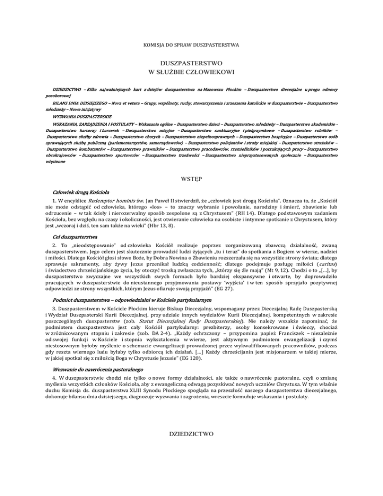 KOMISJA DO SPRAW DUSZPASTERSTWA DUSZPASTERSTWO W SŁUŻBIE CZŁOWIEKOWI DZIEDZICTWO – Kilka najważniejszych kart z dziejów duszpasterstwa na Mazowszu Płockim – Duszpasterstwo diecezjalne u progu odnowy posoborowej BILANS DNIA DZISIEJSZEGO – Nova et vetera – Grupy, wspólnoty, ruchy, stowarzyszenia i zrzeszenia katolickie w duszpasterstwie – Duszpasterstwo młodzieży – Nowe inicjatywy WYZWANIA DUSZPASTERSKIE WSKAZANIA, ZARZĄDZENIA I POSTULATY – Wskazania ogólne – Duszpasterstwo dzieci – Duszpasterstwo młodzieży – Duszpasterstwo akademickie Duszpasterstwo harcerzy i harcerek – Duszpasterstwo misyjne – Duszpasterstwo sanktuaryjne i pielgrzymkowe – Duszpasterstwo rolników – Duszpasterstwo służby zdrowia – Duszpasterstwo chorych – Duszpasterstwo niepełnosprawnych – Duszpasterstwo hospicyjne – Duszpasterstwo osób sprawujących służbę publiczną (parlamentarzystów, samorządowców) – Duszpasterstwo policjantów i straży miejskiej – Duszpasterstwo strażaków – Duszpasterstwo kombatantów – Duszpasterstwo prawników – Duszpasterstwo pracodawców, rzemieślników i poszukujących pracy – Duszpasterstwo obcokrajowców – Duszpasterstwo sportowców – Duszpasterstwo trzeźwości – Duszpasterstwo nieprzystosowanych społecznie – Duszpasterstwo więzienne WSTĘP Człowiek drogą Kościoła 1. W encyklice Redemptor hominis św. Jan Paweł II stwierdził, że „człowiek jest drogą Kościoła”. Oznacza to, że „Kościół nie może odstąpić od człowieka, którego «los» – to znaczy wybranie i powołanie, narodziny i śmierć, zbawienie lub odrzucenie – w tak ścisły i nierozerwalny sposób zespolone są z Chrystusem” (RH 14). Dlatego podstawowym zadaniem Kościoła, bez względu na czasy i okoliczności, jest otwieranie człowieka na osobiste i intymne spotkanie z Chrystusem, który jest „wczoraj i dziś, ten sam także na wieki” (Hbr 13, 8). Cel duszpasterstwa 2. To „nieodstępowanie” od człowieka Kościół realizuje poprzez zorganizowaną zbawczą działalność, zwaną duszpasterstwem. Jego celem jest skutecznie prowadzić ludzi żyjących „tu i teraz” do spotkania z Bogiem w wierze, nadziei i miłości. Dlatego Kościół głosi słowo Boże, by Dobra Nowina o Zbawieniu rozszerzała się na wszystkie strony świata; dlatego sprawuje sakramenty, aby żywy Jezus przenikał ludzką codzienność; dlatego podejmuje posługę miłości ( caritas) i świadectwo chrześcijańskiego życia, by otoczyć troską zwłaszcza tych, „którzy się źle mają” (Mt 9, 12). Chodzi o to „[…], by duszpasterstwo zwyczajne we wszystkich swych formach było bardziej ekspansywne i otwarte, by doprowadziło pracujących w duszpasterstwie do nieustannego przyjmowania postawy ‘wyjścia’ i w ten sposób sprzyjało pozytywnej odpowiedzi ze strony wszystkich, którym Jezus ofiaruje swoją przyjaźń” (EG 27). Podmiot duszpasterstwa – odpowiedzialni w Kościele partykularnym 3. Duszpasterstwem w Kościele Płockim kieruje Biskup Diecezjalny, wspomagany przez Diecezjalną Radę Duszpasterską i Wydział Duszpasterski Kurii Diecezjalnej, przy udziale innych wydziałów Kurii Diecezjalnej, kompetentnych w zakresie poszczególnych duszpasterstw (zob. Statut Diecezjalnej Rady Duszpasterskiej). Nie należy wszakże zapominać, że podmiotem duszpasterstwa jest cały Kościół partykularny: prezbiterzy, osoby konsekrowane i świeccy, chociaż w zróżnicowanym stopniu i zakresie (zob. DA 2-4). „Każdy ochrzczony – przypomina papież Franciszek – niezależnie od swojej funkcji w Kościele i stopnia wykształcenia w wierze, jest aktywnym podmiotem ewangelizacji i czymś niestosownym byłoby myślenie o schemacie ewangelizacji prowadzonej przez wykwalifikowanych pracowników, podczas gdy reszta wiernego ludu byłaby tylko odbiorcą ich działań. […] Każdy chrześcijanin jest misjonarzem w takiej mierze, w jakiej spotkał się z miłością Boga w Chrystusie Jezusie” (EG 120). Wezwanie do nawrócenia pastoralnego 4. W duszpasterstwie chodzi nie tylko o nowe formy działalności, ale także o nawrócenie pastoralne, czyli o zmianę myślenia wszystkich członków Kościoła, aby z ewangeliczną odwagą pozyskiwać nowych uczniów Chrystusa. W tym właśnie duchu Komisja ds. duszpasterstwa XLIII Synodu Płockiego spogląda na przeszłość naszego duszpasterstwa diecezjalnego, dokonuje bilansu dnia dzisiejszego, diagnozuje wyzwania i zagrożenia, wreszcie formułuje wskazania i postulaty. DZIEDZICTWO Kilka najważniejszych kart z dziejów duszpasterstwa na Mazowszu Płockim Dziewięć wieków „płockiego duszpasterstwa” 5. „W 940-letnich dziejach – napisał Biskup Piotr Libera w dziele Mocarze Krzyża Świętego – Kościołem Płockim kierowało 81 biskupów diecezjalnych, których wspomagało 37 biskupów pomocniczych oraz setki kapłanów, zakonników, zakonnic... Życie liturgiczne i umysłowe uświetniały i uświetniają 3 kapituły. Odbyły się 42 synody diecezjalne. Od 1594 roku kapłanów Diecezji kształciło i kształci seminarium duchowne, najpierw w Pułtusku, a potem w Płocku. Zmieniały się granice Diecezji, zmieniał podział na dekanaty, parafie, zmieniali biskupi, przychodziły nowe pokolenia. Ale postawiony przed X wiekami na Wzgórzu Tumskim Krzyż stał i, dzięki Bogu, wciąż tu stoi...”. Kościół Płocki początku III Tysiąclecia jest świadom, że wchodzi w tę bogatą historię, która wyrażała się przede wszystkim w trosce duszpasterskiej o wiernych zamieszkujących teren północnego Mazowsza. Troska ta, w zależności od czasów i okoliczności, przybierała różne formy. W naszym opisie dziedzictwa wymieniamy tylko formy najbardziej charakterystycznych dla „płockiego duszpasterstwa”, wspominamy osoby najbardziej zasłużone. Wdzięczna pamięć i szacunek dla minionych pokoleń 6. Upamiętniając dziedzictwo pastoralne Diecezji Płockiej, nie można zapomni