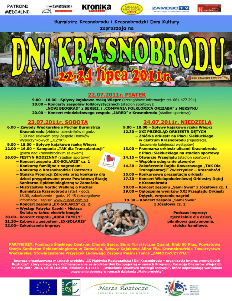 PATRONI MEDIALNI: Burmistrz Krasnobrodu i Krasnobrodzki Dom Kultury zapraszają na 22.07.2011r. PIĄTEK 9.00 – 18.00 - Spływy kajakowe rzeką Wieprz (szczegółowe informacje: tel. 664 477 294) 18.00 – Koncerty zespołów folklorystycznych (stadion sportowy): „NOVI BEOGRAD” z SERBII, i „COMPANIA FOLKLORICA ORIZABA” z MEKSYKU 20.00 – Koncert młodzieżowego zespołu „JARED” z Krasnobrodu (stadion sportowy) 23.07.2011r. SOBOTA 6.00 – Zawody Wędkarskie o Puchar Burmistrza Krasnobrodu (zbiórka uczestników o godz. 5.30 nad zalewem przy Zespole Domków Wypoczynkowych „JEŻYK”). 9.00 – 18.00 – Spływy kajakowe rzeką Wieprz 12.00 – 16.00 – Kampania „TAK dla Transplantacji” (plaża nad krasnobrodzkim zalewem) 16.00– FESTYN RODZINNY (stadion sportowy) – Koncert zespołu „EX-SOLARIS” cz. 1 – Konkursy familijne z nagrodami – Konkursy o Krasnobrodzie i Roztoczu – Stoisko Promocji Zdrowia oraz konkursy dla dzieci przygotowane przez Powiatową Stację Sanitarno-Epidemiologiczną w Zamościu. – Mistrzostwa Nordic Walking o Puchar Burmistrza Krasnobrodu (start - godz. 18.00, zakończenie - godz. 19.45 (szczegółowe informacje i zapisy: www.quand.com.pl). – Koncert zespołu „EX-SOLARIS” cz. 2. – Występ Patryka Kawki - Mistrza Świata w tańcu electric boogie 20.00– Koncert zespołu „ABBA FAMILY” 21.30– Zabawa z zespołem „EX-SOLARIS” 23.00– Zakończenie imprezy 24.07.2011r. NIEDZIELA 9.00 – 18.00 – Spływy kajakowe rzeką Wieprz 12.30 – XXI PRZEGLĄD ORKIESTR DĘTYCH – Zbiórka orkiestr na Placu Siekluckiego w centrum Krasnobrodu (rejestracja, losowanie kolejności występów) 13.00 – Przemarsz orkiestr ulicami Krasnobrodu z Placu Siekluckiego na stadion sportowy 14.15 – Otwarcie Przeglądu (stadion sportowy) – Wspólne odegranie utworów 14.30 – Zakończenie Rajdu Rowerowego „TAK Dla Transplantacji” Zwierzyniec – Krasnobród 15.00 – Konkursowe prezentacje orkiestr 17.30 – Koncert Wielopokoleniowej Orkiestry Dętej z Krasnobrodu 18.00 – Koncert zespołu „Sami Swoi” z Józefowa cz. 1 19.00 – Ogłoszenie wyników XXI Przeglądu Orkiestr Dętych, wręczenie nagród 19.30 – Koncert zespołu „Sami Swoi” z Józefowa cz. 2 Podczas imprezy: zjeżdżalnie dla dzieci, piknikowa gastronomia, stoiska handlowe. PARTNERZY: Fundacja Śląskiego Centrum Chorób Serca, Biuro Turystyczne Quand, Klub 50 Plus, Powiatowa Stacja Sanitarno-Epidemiologiczna w Zamościu, Spływy Kajakowe Alina Fila, Krasnobrodzkie Towarzystwo Wędkarskie, Stowarzyszenie Przyjaciół Ludowego Zespołu Pieśni i Tańca „ZAMOJSZCZYZNA”. Impreza organizowana w ramach projektu „IX Majówka Roztoczańska i Dni Krasnobrodu – organizacja imprez promujących Roztocze”, który ubiega się o dofinansowanie ze środków Unii Europejskiej w ramach Programu Rozwoju Obszarów Wiejskich na lata 2007-2013, Oś IV LEADER, działanie 4.1/413 – „Wdrażanie lokalnych strategii rozwoju”, które odpowiadają warunkom przyznania pomocy w ramach działania „Małe projekty”