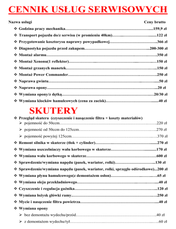 CENNIK USŁUG SERWISOWYCH Nazwa usługi Ceny brutto Godzina pracy mechanika…………………………………………………….....159,9 zł Transport pojazdu do/z serwisu (w promieniu 40km)……...………………........122 zł Przygotowanie kosztorysu naprawy powypadkowej……………………………..366 zł Diagnostyka pojazdu przed zakupem………………………………………...200-300 zł Montaż alarmu……………………………………………………….……….…….350 zł Montaż Xenonu(1 reflektor)………………...………………………....………..…150 zł Montaż grzanych manetek…………………………………………………….…...150 zł Montaż Power Commander…………………………………………….………….250 zł Naprawa gwintu…………………………………………………………..……….....50 zł Naprawa opony……………………………………………………………………...20 zł Wymiana opony/z dętką……………………………………………………….…20/30 zł Wymiana klocków hamulcowych (cena za zacisk)…………………………….......40 zł SKUTERY Przegląd skutera (czyszczenie i nasączenie filtra + koszty materiałów) pojemność do 50ccm……………………………………………………….…….220 zł pojemność od 50ccm do 125ccm…………………………………………….…..270 zł pojemność powyżej 125ccm…………………………………………………..….370 zł Remont silnika w skuterze (tłok + cylinder)………….……………………….......270 zł Wymiana uszczelniaczy wału korbowego w skuterze……………………............170 zł Wymiana wału korbowego w skuterze……………………………………………600 zł Sprawdzenie/wymiana napędu (pasek, wariator, rolki)………………………...130 zł Sprawdzenie/wymiana napędu (pasek, wariator, rolki, sprzęgło odśrodkowe)...200 zł Wymiana płynu hamulcowego(z demontażem osłon)…………………..……..….65 zł Wymiana oleju przekładniowego……………………………………..…….……....40 zł Czyszczenie i regulacja gaźnika……………………………………………….…...120 zł Wymiana łożysk główki ramy.………………………………………………….….250 zł Mycie i nasączenie filtra powietrza………………………………………………....40 zł Wymiana opony bez demontażu wydechu/przód…………………………………………………..40 zł z demontażem wydechu/tył…………………….……………………………...…..60 zł MOTOCYKLE Diagnostyka komputerowa motocykla……………………………………………250 zł Przegląd motocykla < 125ccm3 (z czyszczeniem i nasączeniem filtra powietrza)….……….……..….300 zł > 125ccm3 (synchronizacja, bez regulacji luzów zaworowych)….……………..450 zł Regulacja zaworów (ceny zawierają koszt płytek potrzebnych do regulacji) 1 cylinder - śruby……….……………………………………………………..….150 zł 1 cylinder - płytki……………………………………….………………………..240 zł 2 cylindry układ rzędowy - śruby….……………………………………….…….200 zł 2 cylindry układ rzędowy - płytki………………………………….……….…....280 zł 4 cylindry układ rzędowy - śruby……………………………………………..….280 zł 4 cylindry układ rzędowy - płytki………………………………………...……...380 zł 2 cylindry układ V - śruby……………………………………………..……...….280 zł 2 cylindry układ V - płytki……………………………………………..………...380 zł 4 cylindry układ V - śruby……………………………………….………..…...…380 zł 4 cylindry układ V – płytki……..………………………………….......................470 zł Synchronizacja gaźników 2 cylindry…………………………………………………………………….…...120 zł 4 cylindry………………………………………………………………………....150 zł Czyszczenie, regulacja i synchronizacja gaźników 1 cylinder…………………………………………………….………............150-180 zł 2 cylindry układ rzędowy…………………………………………………….…..260 zł 4 cylindry układ rzędowy………………………………………………………...350 zł 2 cylindry układ V……………………………………………………….……….350zł 4 cylindry układ V………………………………………………………………..400 zł Wymiana oleju z filtrem bez demontażu owiewek………………………………….40 zł z demontażem owiewek………….………………………………………………..60 zł Wymiana oleju w wale kardana…………………………………………….………30 zł Wymiana oleju w skrzyni biegów…………………………….……………..………40 zł Czyszczenie i nasączenie filtra powietrza…………………………………….…….50 zł Czyszczenie i nasączenie filtra K&N…………………………………...……….…..80 zł Pomiar ciśnienia sprężania (za 1 cylinder)…………………………………………50 zł Wymiana łańcuszka rozrządu……………………………………………………..400 zł Wymiana tarcz sprzęgłowych……………………………………………....……...200 zł Regulacja linki sprzęgła…………………………………………………..…............35 zł Regulacja linek gazu…………………………………………