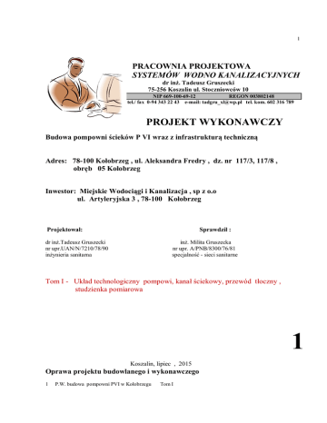 1 PRACOWNIA PROJEKTOWA SYSTEMÓW WODNO KANALIZACYJNYCH dr inż. Tadeusz Gruszecki 75-256 Koszalin ul. Stoczniowców 10 NIP 669-100-69-12 REGON 003802148 tel./ fax 0-94 343 22 43 e-mail: [email protected] tel. kom. 602 316 789 PROJEKT WYKONAWCZY Budowa pompowni ścieków P VI wraz z infrastrukturą techniczną Adres: 78-100 Kołobrzeg , ul. Aleksandra Fredry , dz. nr 117/3, 117/8 , obręb 05 Kołobrzeg Inwestor: Miejskie Wodociągi i Kanalizacja , sp z o.o ul. Artyleryjska 3 , 78-100 Kołobrzeg Projektował: Sprawdził : dr inż.Tadeusz Gruszecki nr upr.UAN/N/7210/78/90 inżynieria sanitarna inż. Milita Gruszecka nr upr. A/PNB/8300/76/81 specjalność - sieci sanitarne Tom I - Układ technologiczny pompowi, kanał ściekowy, przewód tłoczny , studzienka pomiarowa 1 Koszalin, lipiec , 2015 Oprawa projektu budowlanego i wykonawczego 1 P.W. budowa pompowni PVI w Kołobrzegu Tom I 2 STADIUM : PROJEKT BUDOWLANY 1. P.B. Przebudowa pompowni ścieków P1 w miejscowości Dźwirzyno wraz z infrastrukturą techniczną - Część A Formalno-prawna - Część B Opis techniczny i część graficzna - Część C Informacja BIOZ STADIUM – PROJEKT WYKONAWCZY 1. Tom I – Układ technologiczny pompowi, kanał ściekowy, przewód tłoczny , studzienka pomiarowa 2. Tom II – Renowacja zbiornika pompowni, przebudowa pomostu i pozostałe roboty budowlane 3. Tom III – Zasilanie energetyczne, akp, sterownanie i monitoring STADIUM – SPECYFIKACJE TECHNICZNE WYKONANIA I ODBIORU ROBÓT 4. Tom IV– STWiORB STADIUM – PRZEDMIARY ROBÓT 5.. Tom V – Przedmiary robót STADIUM - WARUNKI GRUNTOWO-WODNE 6. Tom VI - Opinia geotechniczna 1. Podstawy formalne i merytoryczne ………………………………………….…… 1.1. Nazwa projektu……………………………………………………………… 2 P.W. budowa pompowni PVI w Kołobrzegu Tom I 3 1.2. Lokalizacja pompowni ……………………………………………………………… 1.3. Inwestor…...……………………………………………………………..………… 1.4. Jednostka projektowa………………………………………………………………. 1.5. Przedmiot i zakres opracowania………………………………….………………… 1.6. Materiały wykorzystane w opracowaniu……………………… ………………..…… 2. Zabudowa i zagospodarowanie terenu………………………………………………… 2.1. Przedmiot inwestycji………………………………………………………………. .. 2.2. Istniejący stan zagospodarowania terenu………………………………………… … 2.3. Projektowane zagospodarowanie terenu…………………………………………… . 2.4. Zestawienie projektowanych elementów ……………………… 3. Opis techniczny projektu budowlanego…………………………………………… 3.1. Przeznaczenie i program użytkowy. 3.2. Funkcja obiektu. 3.3. Układ konstrukcyjny obiektu. 3.4. Rozwiązanie instalacyjno – techniczne 3.4.1. Pompownia ścieków 3.4.1.1. Układ technologiczny pompowni PVI 3.4.1.2. Wymiarowanie przepompowni 3.4.1.3. Konstrukcja suchej komory przepompowni 3.4.1.4. Prace montażowe przewodów i armatury 3.4.1.5.Przewody wentylacyjne 3.4.1.6.Drabiny zejściowe 3.4.1.7. Zasilanie energetyczne 3.4.1.8. Sterownica 3.4.1.9. Oświetlenie 3.4.2. Przewód tłoczny 3.4.2.1. Roboty ziemne 3.4.2.2 Prace montażowe 3.4.2.3. Kolizje z istniejącym uzbrojeniem 3.4.2.4.Próba szczelności przewodu tłocznego 3.4.2.5. Odbiory częściowe i odbiór końcowy 3.4.2.6. Uzbrojenie przewodu tłocznego 3.4.3. Przewód spustowy 3.4.3.1. Roboty ziemne 3.4.3.2. Prace montażowe 3.4.4. Zasilanie energetyczne szafy sterowniczej i pomp . 4. Obliczenia . 4.1.Obliczenia ilości ścieków 4.2.Obliczenia hydrauliczne układu pompownia – przewód tłoczny 5.0.Część graficzna. 1. Rys.1. Projekt zagospodarowania i sytuacyjny pompowni PVI, skala 1:500 2. Rys.1/1. Projekt zagospodarowania i sytuacyjny pompowni PVI, skala 1:250 2. Rys.2. Technologia pompowni 3. Rys.3. Profil przewodu spustowego i przewodu tłocznego 3 P.W. budowa pompowni PVI w Kołobrzegu Tom I 4 4. Rys.4. Posadowienie i zabezpieczenie uzbrojenia podziemnego 5. Rys.5. Studzienka pomiarowa 6. Rys.6. Studzienka połączeniowa- rozprężna 1.Podstawy formalne i merytoryczne opracowania dokumentacji inwestycji Umowa zawarta pomiędzy Miejskimi Wodociągami i Kanalizacją w Kołobrzegu a Pracownią Projektową Systemów Wodno-Kanalizacyjnych w Koszalinie na opracowanie dokumentacji 4 P.W. budowa pompowni PVI w Kołobrzegu Tom I 5 przebudowy pompowni ścieków PVI w Kołobrzegu 1.1. Nazwa przedsięwzięcia Budowa pompowni ścieków PVI wraz z infrastrukturą techniczną i rozbiórką istniejącej pompowni w Kołobrzegu, ul. A.Fredry, dz. Nr 117/3 i 117/8 , obręb 5 Kołobrzeg 1.2. Nazwa projektu Układ technologiczny pompowi, kanał ściekowy, przewód tłoczny , studzienka pomiarowa - Tom I 1.3. Zleceniodawca Miejskie Wodociągi i Kanalizacja w Kołobrzegu ul. Artyleryjska 3. 1.4.Pracownia Projektowa Pracownia Projektowa Systemów Wodno-Kanalizacyjnych, dr. inż. T.Gruszecki, 75-256 Koszalin, ul. Stoczniowców 10. 1.5.Cel i zakres opracowania Zakres rzeczowy inwestycji obejmował będzie przebudowę pompowni ścieków PVI w m. Kołobrzeg wraz z infrastrukturą techniczną na terenie istniejącej pompowni / dz. Nr 117/3 / i na działce nr 117/8 . Spodziewanym efektem inwestycji jest wybudowanie nowej pompowni ścieków w układzie suchym o wydajności zapewniającej przetłoczenie dopływających ścieków z terenu przynależnego do zlewni pompowni dla stanu obecnego oraz okresu docelowego . Na terenie objętym opracowaniem, zgodnie ze Studium uwarunkowań jest oczyszczalnia ścieków w Korzyścienku Zakres opracowania zgodny z Rozporządzeniem Ministra Transportu , Budownictwa i Gospodarki Morskiej z dnia 25.04.2012 r. w sprawie szczegółowego zakresu i 