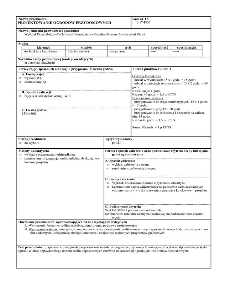 Nazwa przedmiotu PROJEKTOWANIE OGRODÓW PRZYDOMOWYCH Kod ECTS 6.17-POP Nazwa jednostki prowadzącej przedmiot Wydział Przyrodniczo-Techniczny/ Samodzielna Katedra Ochrony Powierzchni Ziemi Studia kierunek Architektura krajobrazu stopień I (inżynierskie) tryb stacjonarne specjalność ----- specjalizacja ----- Nazwisko osoby prowadzącej (osób prowadzących) dr Jarosław Sławiński Formy zajęć, sposób ich realizacji i przypisana im liczba godzin • • A. Formy zajęć wykład (W), seminarium (S) • B. Sposób realizacji zajęcia w sali dydaktycznej: W, S Liczba punktów ECTS: 3 Godziny kontaktowe - udział w wykładach: 15 x 1godz. = 15 godz. - udział w zajęciach seminaryjnych: 15 x 2 godz. = 30 godz. Konsultacje: 1 godz. Razem: 46 godz. = 1,5 p.ECTS Praca własna studenta - przygotowanie do zajęć seminaryjnych: 15 x 1 godz. = 15 godz. - przygotowanie projektu: 10 godz. - przygotowanie do zaliczenia i obecność na zaliczeniu: 15 godz. Razem 40 godz. = 1,5 p.ECTS C. Liczba godzin 15W+30S Suma: 86 godz. – 3 p ECTS Status przedmiotu • do wyboru Język wykładowy polski Metody dydaktyczne • wykład z prezentacją multimedialną • seminarium: prezentacja multimedialna, dyskusja, wykonanie projektu Forma i sposób zaliczenia oraz podstawowe kryteria oceny lub wymagania egzaminacyjne A. Sposób zaliczenia • wykład: zaliczenie z oceną • seminarium: zaliczenie z ocena B. Formy zaliczenia • Wykład: kolokwium pisemne z pytaniami otwartymi • Seminarium: ocena zaliczeniowa na podstawie ocen cząstkowych otrzymywanych w trakcie trwania semestru z kolokwiów i projektu C. Podstawowe kryteria Wykład:50%+1 poprawnych odpowiedzi Seminarium: ustalenie oceny zaliczeniowej na podstawie ocen cząstkowych Określenie przedmiotów wprowadzających wraz z wymogami wstępnymi A. Wymagania formalne: rośliny ozdobne, dendrologia, podstawy projektowania B. Wymagania wstępne: umiejętność rozpoznawania oraz znajomość podstawowych wymagań siedliskowych, drzew, warzyw i roślin ozdobnych, umiejętność obsługi komputera i znajomość wybranych programów graficznych Cele przedmiotu: znajomość i umiejętność projektowania ozdobnych ogrodów użytkowych; umiejętność wyboru odpowiedniego stylu ogrodu, a także odpowiedniego doboru roślin dopasowanych zarówno do koncepcji ogrodu jak i warunków siedliskowych. Treści programowe A. Problematyka wykładu: Podstawowe pojęcia z zakresu architektury krajobrazu. Projektowanie ogrodu a przepisy prawa budowlanego. Charakterystyka uwarunkowań zewnętrznych. Rozpoznawanie i ocena terenu – zasady sporządzenia inwentaryzacji. Style w sztuce ogrodowej. Elementy małej architektury ogrodowej. Materiały wykorzystywane w architekturze krajobrazu. Dokumentacja projektowo-techniczna. Podstawy kosztorysowania. Zasady opracowania projektu. Zasady projektowania nasadzeń roślinnych. Dobór materiału roślinnego i odległość sadzenia podczas projektowania elementów ogrodu. Sezonowe zmiany w kompozycjach roślinnych. Instalacje nawodnieniowe, jej elementy, budowa i zasady projektowania. Wizualizacja i realizacja projektu. Dokumentacja powykonawcza i odbiór robót. B. Problematyka seminarium: Zasady przygotowania projektu. Części składowe i zawartość merytoryczna dokumentacji w fazie projektu wykonawczego. Oznaczenia graficzne stosowane na mapach zasadniczych. Oznaczenia graficzne obowiązujące w zakresie istniejących i projektowanych elementów roślinnych wg norm PN-71/B-01035, PN-B/01027. Przykłady projektów koncepcyjnych rewaloryzacji i inwentaryzacji wybranych obszarów zielonych. Rozpoznanie terenu i pomiary terenowe. Projektowanie przestrzeni. Pionowa i pozioma struktura ogrodu. Tworzenie projektu nasadzeń roślinnych. Dobór gatunków roślin do potrzeb projektu. Projektowanie i zakładanie trawników. Projektowanie i zakładanie kwietników, rabat i ogrodów specjalnych. Woda w ogrodzie – projektowanie instalacji nawadniających i magazynujących wodę. Projektowanie instalacji oświetleniowej. Projektowanie elementów małej architektury ogrodowej. Wykaz literatury A. Literatura wymagana do ostatecznego zaliczenia zajęć (zdania egzaminu): A.1. wykorzystywana podczas zajęć 1. Alexander Rosemary, 2012. Podstawy projektowania ogrodów. Podręcznik. Wyd. PWRiL, Warszawa. 2. Chojnowska E., Chojnowski M., 2008. Jak założyć ogród. Wyd. Multico, Warszawa. 3. Jarosz Z., 2010. Nowoczesne nawadnianie. Wyd. Działkowiec, Warszawa. 4. Kingsbury Noel, 2007. Projektowanie rabat. Kompozycje ogrodowe. Wyd. Muza, Warszawa. 5. Stafford Cliff, 2011. 1000 pomysłów na ogród. Wyd. Muza, Warszawa. 6. Wilson Andrew, 2011. 140 projektów małych ogrodów. Wyd. Muza, Warszawa. A.2. studiowana samodzielnie przez studenta B. Literatura uzupełniająca 1. Praca zbiorowa, 2011. Katalog roślin drzewa, krzewy, byliny polecane przez Związek Szkółkarzy Polskich. Agencja Promocji Zieleni, Warszawa. 2. Źródła elektroniczne (wejście przez Wirtualną Bibliotekę Nauki, stronę biblioteki UO) Odniesienie do Efekty kształcenia efektów kształ- Po ukończeniu studiów student/studentka: cenia dla kierunku K1A_W03 K1A_W08 Wiedza: - wyjaśnia zasady tworzenia dokumentacji projektowo-technicznej dla terenów zieleni i poprawnie definiuje pojęcia z powyższego zakresu; rozpoznaje podstawowe oznaczenia graficzne stosowane w dokumentacji projektowotechnicznej; K1A_W13 K1A_W20 - wymienia i opisuje style stosowane w sztuce ogrodowej, K1A_W10 K1A_W13 - wyjaśnia zasady projektowania różnych elementów ogrodu (kwietników, rabat, ogrodów specjalnych, itd.); K1A_W05 K1A_W02 K1A_W13 - klasyfikuje rodzaje materiału roślinnego i ma wiedzę na temat doboru roślin; K1A_W05 - rozpoznaje rodzaje i funkcje trawników; K1A_W13 - operuje wiedzą z zakresu projektowania małej architektury ogrodowej. K1A_U05 K1A_U11 K1A_U13 Umiejętności: - potrafi poprawnie przygotować koncepcję i projekt użytkowego ogrodu przydomowego; wykorzystując własn