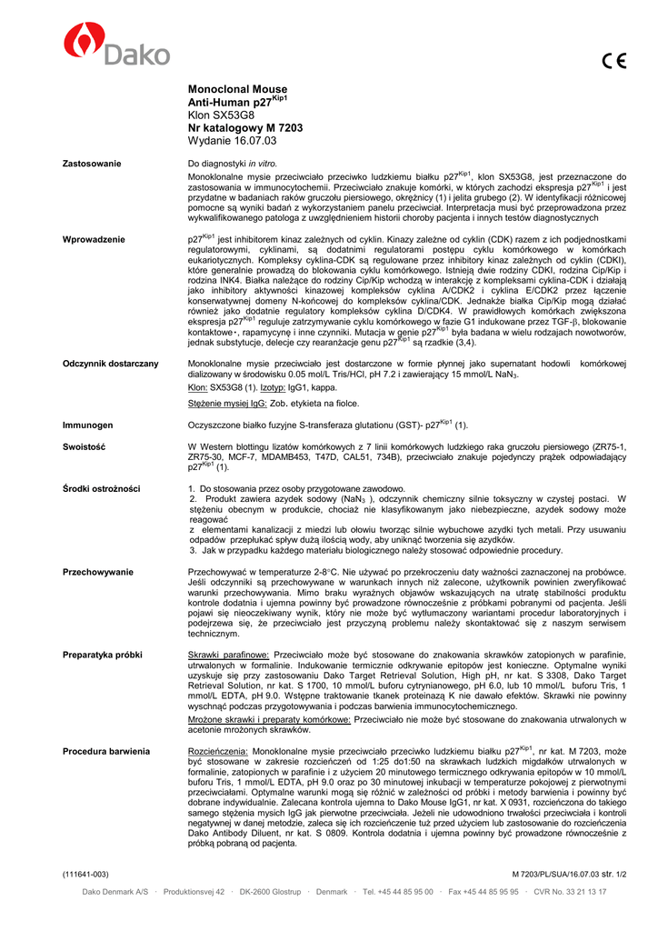 Monoclonal Mouse Kip1 Anti-Human p27 Klon SX53G8 Nr katalogowy M 7203 Wydanie 16.07.03 Zastosowanie Do diagnostyki in vitro. Monoklonalne mysie przeciwciało przeciwko ludzkiemu białku p27Kip1, klon SX53G8, jest przeznaczone do zastosowania w immunocytochemii. Przeciwciało znakuje komórki, w których zachodzi ekspresja p27 Kip1 i jest przydatne w badaniach raków gruczołu piersiowego, okrężnicy (1) i jelita grubego (2). W identyfikacji różnicowej pomocne są wyniki badań z wykorzystaniem panelu przeciwciał. Interpretacja musi być przeprowadzona przez wykwalifikowanego patologa z uwzględnieniem historii choroby pacjenta i innych testów diagnostycznych Wprowadzenie p27Kip1 jest inhibitorem kinaz zależnych od cyklin. Kinazy zależne od cyklin (CDK) razem z ich podjednostkami regulatorowymi, cyklinami, są dodatnimi regulatorami postępu cyklu komórkowego w komórkach eukariotycznych. Kompleksy cyklina-CDK są regulowane przez inhibitory kinaz zależnych od cyklin (CDKI), które generalnie prowadzą do blokowania cyklu komórkowego. Istnieją dwie rodziny CDKI, rodzina Cip/Kip i rodzina INK4. Białka należące do rodziny Cip/Kip wchodzą w interakcję z kompleksami cyklina-CDK i działają jako inhibitory aktywności kinazowej kompleksów cyklina A/CDK2 i cyklina E/CDK2 przez łączenie konserwatywnej domeny N-końcowej do kompleksów cyklina/CDK. Jednakże białka Cip/Kip mogą działać również jako dodatnie regulatory kompleksów cyklina D/CDK4. W prawidłowych komórkach zwiększona ekspresja p27Kip1 reguluje zatrzymywanie cyklu komórkowego w fazie G1 indukowane przez TGF-blokowanie kontaktowe , rapamycynę i inne czynniki. Mutacja w genie p27Kip1 była badana w wielu rodzajach nowotworów, jednak substytucje, delecje czy rearanżacje genu p27Kip1 są rzadkie (3,4). Odczynnik dostarczany Monoklonalne mysie przeciwciało jest dostarczone w formie płynnej jako supernatant hodowli dializowany w środowisku 0.05 mol/L Tris/HCl, pH 7.2 i zawierający 15 mmol/L NaN3. komórkowej Klon: SX53G8 (1). Izotyp: IgG1, kappa. Stężenie mysiej IgG: Zob. etykieta na fiolce. Immunogen Oczyszczone białko fuzyjne S-transferaza glutationu (GST)- p27Kip1 (1). Swoistość W Western blottingu lizatów komórkowych z 7 linii komórkowych ludzkiego raka gruczołu piersiowego (ZR75-1, ZR75-30, MCF-7, MDAMB453, T47D, CAL51, 734B), przeciwciało znakuje pojedynczy prążek odpowiadający p27Kip1 (1). Środki ostrożności 1. Do stosowania przez osoby przygotowane zawodowo. 2. Produkt zawiera azydek sodowy (NaN3 ), odczynnik chemiczny silnie toksyczny w czystej postaci. W stężeniu obecnym w produkcie, chociaż nie klasyfikowanym jako niebezpieczne, azydek sodowy może reagować z elementami kanalizacji z miedzi lub ołowiu tworząc silnie wybuchowe azydki tych metali. Przy usuwaniu odpadów przepłukać spływ dużą ilością wody, aby uniknąć tworzenia się azydków. 3. Jak w przypadku każdego materiału biologicznego należy stosować odpowiednie procedury. Przechowywanie Przechowywać w temperaturze 2-8C. Nie używać po przekroczeniu daty ważności zaznaczonej na probówce. Jeśli odczynniki są przechowywane w warunkach innych niż zalecone, użytkownik powinien zweryfikować warunki przechowywania. Mimo braku wyraźnych objawów wskazujących na utratę stabilności produktu kontrole dodatnia i ujemna powinny być prowadzone równocześnie z próbkami pobranymi od pacjenta. Jeśli pojawi się nieoczekiwany wynik, który nie może być wytłumaczony wariantami procedur laboratoryjnych i podejrzewa się, że przeciwciało jest przyczyną problemu należy skontaktować się z naszym serwisem technicznym. Preparatyka próbki Skrawki parafinowe: Przeciwciało może być stosowane do znakowania skrawków zatopionych w parafinie, utrwalonych w formalinie. Indukowanie termicznie odkrywanie epitopów jest konieczne. Optymalne wyniki uzyskuje się przy zastosowaniu Dako Target Retrieval Solution, High pH, nr kat. S 3308, Dako Target Retrieval Solution, nr kat. S 1700, 10 mmol/L buforu cytrynianowego, pH 6.0, lub 10 mmol/L buforu Tris, 1 mmol/L EDTA, pH 9.0. Wstępne traktowanie tkanek proteinazą K nie dawało efektów. Skrawki nie powinny wyschnąć podczas przygotowywania i podczas barwienia immunocytochemicznego. Mrożone skrawki i preparaty komórkowe: Przeciwciało nie może być stosowane do znakowania utrwalonych w acetonie mrożonych skrawków. Procedura barwienia (111641-003) Rozcieńczenia: Monoklonalne mysie przeciwciało przeciwko ludzkiemu białku p27Kip1, nr kat. M 7203, może być stosowane w zakresie rozcieńczeń od 1:25 do1:50 na skrawkach ludzkich migdałków utrwalonych w formalinie, zatopionych w parafinie i z użyciem 20 minutowego termicznego odkrywania epitopów w 10 mmol/L buforu Tris, 1 mmol/L EDTA, pH 9.0 oraz po 30 minutowej inkubacji w temperaturze pokojowej z pierwotnymi przeciwciałami. Optymalne warunki mogą się różnić w zależności od próbki i metody barwienia i powinny być dobrane indywidualnie. Zalecana kontrola ujemna to Dako Mouse IgG1, nr kat. X 0931, rozcieńczona do takiego samego stężenia mysich IgG jak pierwotne przeciwciała. Jeżeli nie udowodniono trwałości przeciwciała i kontroli negatywnej w danej metodzie, zaleca się ich rozcieńczenie tuż przed użyciem lub zastosowanie do rozcieńczenia Dako Antibody Diluent, nr kat. S 0809. Kontrola dodatnia i ujemna powinny być prowadzone równocześnie z próbką pobraną od pacjenta. M 7203/PL/SUA/16.07.03 str. 1/2 Dako Denmark A/S · Produktionsvej 42 · DK-2600 Glostrup · Denmark · Tel. +45 44 85 95 00 · Fax +45 44 85 95 95 · CVR No. 33 21 13 17 Uwidacznianie produktu reakcji: Zaleca się zestawy LSAB™+/HRP nr katalogowy K 0679 i DAKO EnVision™/HRP numery katalogowe K 4004 i K 4006. Postępowanie zgodnie z procedurą dołączoną do wybranego zestawu do uwidaczniania produktu reakcji. Automatyzacja: Przeciwciało jest przystosowane do zautomatyzowanego barwienia immunocytochemiczn