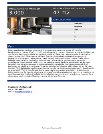 MIESZKANIE na WYNAJEM 3 000 Warszawa, Śródmieście, Widok 47 m2 308/4252/OMW Secondary HighBlock 1965 8 10 2 1 Opis Do wynajęcia dwupokojowe mieszkanie (typu apartamentowego), o pow. 47 metrów kwadratowych, (pokoje 18m2 + 12m2), zlokalizowane w centrum Warszawy,w odległości 100m od stacji metra Centrum i środków komunikacji miejskiej. Dyskretne, wysoki standard, kameralne, słoneczne (zachód). Okna nowe z roletami. Budynek i mieszkanie po kapitalnym remoncie. Całkowicie umeblowane i wyposażone (nowe meble), z dużą garderobą i loggią. Pralka, duża lodówka z zamrażarką, zmywarka, płyta gazowa z piekarnikiem elektrycznym, kuchenka mikrofalowa, toster, czajnik elektryczny. Na podłogach gres (kuchnia, przedpokój, garderoba i łazienka) oraz panele drewniane w pozostałej części mieszkania. Kuchnia półotwarta 8,0m2. Łazienka z wc z kabiną prysznicową. Telewizja satelitarna. Telewizor LCD - płaski ekran, 42 cale, internet Wi-Fi. Całodobowa ochrona, portiernia, monitoring. Dwie nowoczesne windy. Okablowanie do internetu i TV UPC. Klub fitness, liczne puby, kawiarnie, restauracje, teatry, sklepy. Kaucja jednomiesięczna. Sprzątanie mieszkania przez profesjonalną sprzątaczkę, trzy razy w miesiącu, za dodatkową opłatą. Możliwość oglądania mieszkania po wcześniejszym uzgodnieniu terminu. Cena nie zawiera opłat za media.Mieszkanie wolne od sierpnia.Polecam Dariusz Antoniak tel. 517135701 email: [email protected] Fast Broker Nieruchomości Powered by TCPDF (www.tcpdf.org)