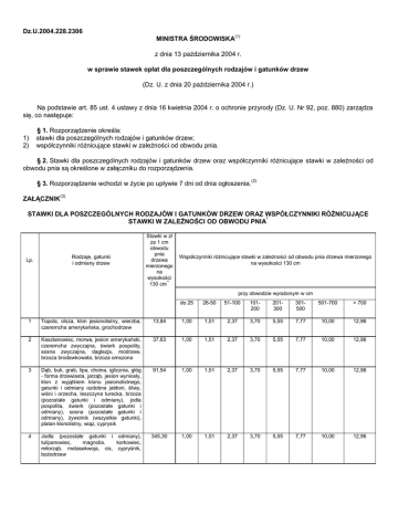 Dz.U.2004.228.2306 (1) MINISTRA ŚRODOWISKA z dnia 13 października 2004 r. w sprawie stawek opłat dla poszczególnych rodzajów i gatunków drzew (Dz. U. z dnia 20 października 2004 r.) Na podstawie art. 85 ust. 4 ustawy z dnia 16 kwietnia 2004 r. o ochronie przyrody (Dz. U. Nr 92, poz. 880) zarządza się, co następuje: 1) 2) § 1. Rozporządzenie określa: stawki dla poszczególnych rodzajów i gatunków drzew; współczynniki różnicujące stawki w zależności od obwodu pnia. § 2. Stawki dla poszczególnych rodzajów i gatunków drzew oraz współczynniki różnicujące stawki w zależności od obwodu pnia są określone w załączniku do rozporządzenia. § 3. Rozporządzenie wchodzi w życie po upływie 7 dni od dnia ogłoszenia. ZAŁĄCZNIK (2) (3) STAWKI DLA POSZCZEGÓLNYCH RODZAJÓW I GATUNKÓW DRZEW ORAZ WSPÓŁCZYNNIKI RÓŻNICUJĄCE * STAWKI W ZALEŻNOŚCI OD OBWODU PNIA Lp. Rodzaje, gatunki i odmiany drzew Stawki w zł za 1 cm obwodu pnia drzewa mierzonego na wysokości 130 cm** Współczynniki różnicujące stawki w zależności od obwodu pnia drzewa mierzonego na wysokości 130 cm przy obwodzie wyrażonym w cm do 25 26-50 51-100 101200 201300 301500 501-700 > 700 1 Topola, olsza, klon jesionolistny, wierzba, czeremcha amerykańska, grochodrzew 13,84 1,00 1,51 2,37 3,70 5,55 7,77 10,00 12,96 2 Kasztanowiec, morwa, jesion amerykański, czeremcha zwyczajna, świerk pospolity, sosna zwyczajna, daglezja, modrzew, brzoza brodawkowata, brzoza omszona 37,63 1,00 1,51 2,37 3,70 5,55 7,77 10,00 12,96 3 Dąb, buk, grab, lipa, choina, iglicznia, głóg - forma drzewiasta, jarząb, jesion wyniosły, klon z wyjątkiem klonu jesionolistnego, gatunki i odmiany ozdobne jabłoni, śliwy, wiśni i orzecha, leszczyna turecka, brzoza (pozostałe gatunki i odmiany), jodła pospolita, świerk (pozostałe gatunki i odmiany), sosna (pozostałe gatunki i odmiany), żywotnik (wszystkie gatunki), platan klonolistny, wiąz, cyprysik 91,54 1,00 1,51 2,37 3,70 5,55 7,77 10,00 12,96 4 Jodła (pozostałe gatunki i odmiany), tulipanowiec, magnolia, korkowiec, miłorząb, metasekwoja, cis, cypryśnik, bożodrzew 345,30 1,00 1,51 2,37 3,70 5,55 7,77 10,00 12,96 Objaśnienia: * Za usunięcie drzew rodzajów i gatunków innych niż określone w załączniku do rozporządzenia stawki ustala się jak dla drzew o podobnej wartości przyrodniczej, wymienionych w tym załączniku. ** Stawki podlegają corocznej waloryzacji zgodnie z art. 85 ust. 7 ustawy z dnia 16 kwietnia 2004 r. o ochronie przyrody (Dz. U. Nr 92, poz. 880). Przypisy: 1) Minister Środowiska kieruje działem administracji rządowej - środowisko, na podstawie § 1 ust. 2 pkt 2 rozporządzenia Prezesa Rady Ministrów z dnia 11 czerwca 2004 r. w sprawie szczegółowego zakresu działania Ministra Środowiska (Dz. U. Nr 134, poz. 1438). 2) Niniejsze rozporządzenie było poprzedzone rozporządzeniem Rady Ministrów z dnia 6 maja 2003 r. w sprawie jednostkowych stawek opłat za usuwanie drzew lub krzewów (Dz. U. Nr 99, poz. 906), które traci moc z dniem wejścia w życie niniejszego rozporządzenia na podstawie art. 157 ustawy z dnia 16 kwietnia 2004 r. o ochronie przyrody (Dz. U. Nr 92, poz. 880). 3) Załącznik: - zmieniony przez obwieszczenie z dnia 28 października 2004 r. w sprawie stawek opłat za usunięcie drzew i krzewów oraz kar za zniszczenie zieleni na rok 2005 (M.P.2004.44.779) z dniem 1 stycznia 2005 r. - zmieniony przez obwieszczenie z dnia 18 października 2005 r. w sprawie stawek opłat za usunięcie drzew i krzewów oraz kar za zniszczenie zieleni na rok 2006 (M.P.2005.62.861) z dniem 1 stycznia 2006 r. - zmieniony przez obwieszczenie z dnia 12 października 2006 r. w sprawie stawek opłat za usunięcie drzew i krzewów oraz kar za zniszczenie zieleni na rok 2007 (M.P.2006.73.733) z dniem 1 stycznia 2007 r. - zmieniony przez obwieszczenie z dnia 16 października 2007 r. w sprawie stawek opłat za usunięcie drzew i krzewów oraz kar za zniszczenie zieleni na rok 2008 (M.P.2007.77.828) z dniem 1 stycznia 2008 r. - zmieniony przez obwieszczenie z dnia 14 października 2008 r. w sprawie stawek opłat za usunięcie drzew i krzewów oraz kar za zniszczenie zieleni na rok 2009 (M.P.2008.82.725) z dniem 1 stycznia 2009 r. - zmieniony przez obwieszczenie z dnia 23 października 2009 r. w sprawie stawek opłat za usunięcie drzew i krzewów oraz stawek kar za zniszczenie zieleni na rok 2010 (M.P.2009.69.894) z dniem 1 stycznia 2010 r. - zmieniony przez obwieszczenie z dnia 15 października 2010 r. w sprawie stawek opłat za usunięcie drzew i krzewów oraz stawek kar za zniszczenie zieleni na rok 2011 (M.P.2010.76.954) z dniem 1 stycznia 2011 r. - zmieniony przez pkt 2 obwieszczenia z dnia 13 października 2011 r. w sprawie stawek opłat za usunięcie drzew i krzewów oraz stawek kar za zniszczenie zieleni na rok 2012 (M.P.2011.95.963) z dniem 1 stycznia 2012 r. - zmieniony przez obwieszczenie z dnia 25 września 2012 r. w sprawie stawek opłat za usunięcie drzew i krzewów oraz stawek kar za zniszczenie zieleni na rok 2013 (M.P.2012.747) z dniem 1 stycznia 2013 r. - zmieniony przez obwieszczenie z dnia 24 października 2013 r. w sprawie stawek opłat za usunięcie drzew i krzewów oraz stawek kar za zniszczenie zieleni na rok 2014 (M.P.2013.835) z dniem 1 stycznia 2014 r. - zmieniony przez obwieszczenie z dnia 24 października 2014 r. w sprawie stawek opłat za usunięcie drzew i krzewów oraz stawek kar za zniszczenie zieleni na rok 2015 (M.P.2014.958) zmieniającego nin. rozporządzenie z dniem 1 stycznia 2015 r.