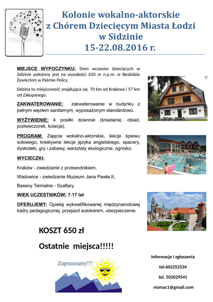 Kolonie wokalno-aktorskie z Chórem Dziecięcym Miasta Łodzi w Sidzinie 15-22.08.2016 r. MIEJSCE WYPOCZYNKU: Dom wczasów dziecięcych w Sidzinie położony jest na wysokości 620 m n.p.m. w Beskidzie Żywieckim w Paśmie Policy. Sidzina to miejscowość znajdująca się 70 km od Krakowa i 57 km od Zakopanego. ZAKWATEROWANIE: zakwaterowanie w budynku z pełnym węzłem sanitarnym, wyposażonym standardowo. WYŻYWIENIE: 4 posiłki podwieczorek, kolacja). dziennie (śniadanie, obiad, PROGRAM: Zajęcia wokalno-aktorskie, lekcje śpiewu solowego, kreatywne lekcje języka angielskiego, spacery, dyskoteki, gry i zabawy, warsztaty ekologiczne, ognisko. WYCIECZKI: Kraków - zwiedzanie z przewodnikiem, Wadowice - zwiedzanie Muzeum Jana Pawła II, Baseny Termalne - Szaflary. WIEK UCZESTNIKÓW: 7-17 lat OFERUJEMY: Opiekę wykwalifikowanej międzynarodowej kadry pedagogicznej, przejazd autokarem, ubezpieczenie. KOSZT 650 zł Ostatnie miejsca!!!!! Informacje i zgłoszenia tel.602252534 tel. 502029541 [email protected]