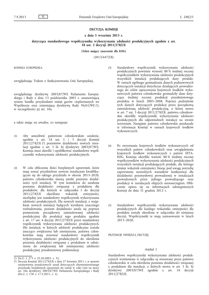 7.9.2013 PL Dziennik Urzędowy Unii Europejskiej L 240/23 DECYZJA KOMISJI z dnia 5 września 2013 r. dotycząca standardowego współczynnika wykorzystania zdolności produkcyjnych zgodnie z art. 18 ust. 2 decyzji 2011/278/UE (Tekst mający znaczenie dla EOG) (2013/447/UE) KOMISJA EUROPEJSKA, (3) Standardowy współczynnik wykorzystania zdolności produkcyjnych powinien wynosić 80 % średniej rocznej współczynników wykorzystania zdolności produkcyjnych wszystkich instalacji produkujących dany produkt. W ramach ogólnego gromadzenia danych podstawowych dotyczących instalacji dotychczas działających prowadzo nego do celów opracowania krajowych środków wyko nawczych państwa członkowskie gromadziły dane doty czące średniej rocznej produkcji przedmiotowego produktu w latach 2005–2008. Poprzez podzielenie tych danych dotyczących produkcji przez początkową zainstalowaną zdolność produkcyjną, o której mowa w art. 7 ust. 3 decyzji 2011/278/UE, państwa członkow skie określiły współczynniki wykorzystania zdolności produkcyjnych dla odpowiednich instalacji na swoim terytorium. Następnie państwa członkowskie przekazały te informacje Komisji w ramach krajowych środków wykonawczych. (4) Po otrzymaniu krajowych środków wykonawczych od wszystkich państw członkowskich oraz uwzględnieniu krajowych środków wykonawczych z państw EFTAEOG, Komisja określiła wartość 80 % średniej rocznej współczynników wykorzystania zdolności produkcyjnych wszystkich instalacji produkujących produkt, dla którego istnieje wskaźnik emisyjności, biorąc pod uwagę potrzebę zapewnienia neutralnych warunków konkurencji dla działalności przemysłowej prowadzonej w instalacjach prowadzonych przez jednego prowadzącego oraz produkcji w instalacjach objętych outsourcingiem. Obli czenie opiera się na informacjach udostępnionych Komisji do dnia 31 grudnia 2012 r. (5) Standardowe współczynniki wykorzystania zdolności produkcyjnych dla każdego wskaźnika emisyjności dla produktu zostały określone w załączniku do niniejszej decyzji. Współczynniki te mają zastosowanie w latach 2013–2020, uwzględniając Traktat o funkcjonowaniu Unii Europejskiej, uwzględniając dyrektywę 2003/87/WE Parlamentu Europej skiego i Rady z dnia 13 października 2003 r. ustanawiającą system handlu przydziałami emisji gazów cieplarnianych we Wspólnocie oraz zmieniającą dyrektywę Rady 96/61/WE (1), w szczególności jej art. 10a, a także mając na uwadze, co następuje: (1) (2) Aby umożliwić państwom członkowskim ustalenie, zgodnie z art. 18 ust. 1 i 3 decyzji Komisji 2011/278/UE (2) poziomów działalności nowych insta lacji zgodnie z art. 3 lit. h) dyrektywy 2003/87/WE, Komisja musi określić i opublikować standardowe współ czynniki wykorzystania zdolności produkcyjnych. W celu obliczenia ilości bezpłatnych uprawnień, które mają zostać przydzielone nowym instalacjom kwalifiku jącym się do takiego przydziału w okresie 2013–2020, państwa członkowskie muszą ustalić poziomy działal ności tych instalacji. W tym kontekście do ustalenia poziomu działalności związanej z produktem dla produktów, dla których w załączniku I do decyzji 2011/278/UE określono wskaźnik emisyjności, niezbędny jest standardowy współczynnik wykorzystania zdolności produkcyjnych. Dla nowych instalacji, z wyjąt kiem nowych instalacji będących wynikiem znacznego rozbudowania, poziom działalności ustala się poprzez pomnożenie początkowej zainstalowanej zdolności produkcyjnej dla produkcji tego produktu zgodnie z art. 17 ust. 4 decyzji 2011/278/UE przez standardowy współczynnik wykorzystania zdolności produkcyjnych. Dla instalacji, w których zdolność produkcyjna została znacząco zwiększona lub zmniejszona, państwa człon kowskie mają stosować standardowy współczynnik wykorzystania zdolności produkcyjnych do określenia poziomu działalności związanej z produktem w odnie sieniu do zwiększonej lub zmniejszonej zdolności produkcyjnej przedmiotowej podinstalacji. (1) Dz.U. L 275 z 25.10.2003, s. 32. (2) Decyzja Komisji 2011/278/UE z dnia 27 kwietnia 2011 r. w sprawie ustanowienia przejściowych zasad dotyczących zharmonizowanego przydziału bezpłatnych uprawnień do emisji w całej Unii na mocy art. 10a dyrektywy 2003/87/WE Parlamentu Europejskiego i Rady (Dz.U. L 130 z 17.5.2011, s. 1). PRZYJMUJE NINIEJSZĄ DECYZJĘ: Artykuł 1 Standardowe współczynniki wykorzystania zdolności produk cyjnych wymienione w załączniku są stosowane przez państwa członkowskie w celu określenia poziomu działalności związanej z produktem dla instalacji, o których mowa w art. 3 lit. h) dyrektywy 2003/87/WE zgodnie z art. 18 decyzji 2011/278/UE. L 240/24 PL Dziennik Urzędowy Unii Europejskiej Artykuł 2 Niniejsza decyzja wchodzi w życie pierwszego dnia po jej opublikowaniu w Dzienniku Urzędowym Unii Europejskiej. Sporządzono w Brukseli dnia 5 września 2013 r. W imieniu Komisji José Manuel BARROSO Przewodniczący 7.9.2013 PL 7.9.2013 Dziennik Urzędowy Unii Europejskiej L 240/25 ZAŁĄCZNIK Wskaźnik emisyjności dla produktu wymieniony w załączniku I do decyzji 2011/278/UE Standardowy współczynnik wykorzystania zdolności produkcyjnych Koks 0,960 Ruda spiekana 0,886 Ciekły metal 0,894 Wstępnie spieczona anoda 0,928 Aluminium 0,964 Szary klinkier cementowy 0,831 Biały klinkier cementowy 0,787 Wapno 0,813 Dolomit kalcynowany 0,748 Dolomit spiekany 0,784 Szkło typu „float” 0,946 Butle i słoiki ze szkła bezbarwnego 0,883 Butle i słoiki ze szkła barwnego 0,912 Produkty z włókien ciągłych szklanych 0,892 Cegły licówki 0,809 Kostki brukowe 0,731 Dachówki 0,836 Proszek uzyskany metodą suszenia rozpryskowego 0,802 Gips 0,801 Suszony gips wtórny 0,812 Krótkowłóknista masa celulozowa siarczanowa 0,808 Długowłóknista masa siarczanowa 0,823 Masa celulozowa uzyskana metodą siarczynową, ścier drzewny otrzymywany termomechanicznie i mec